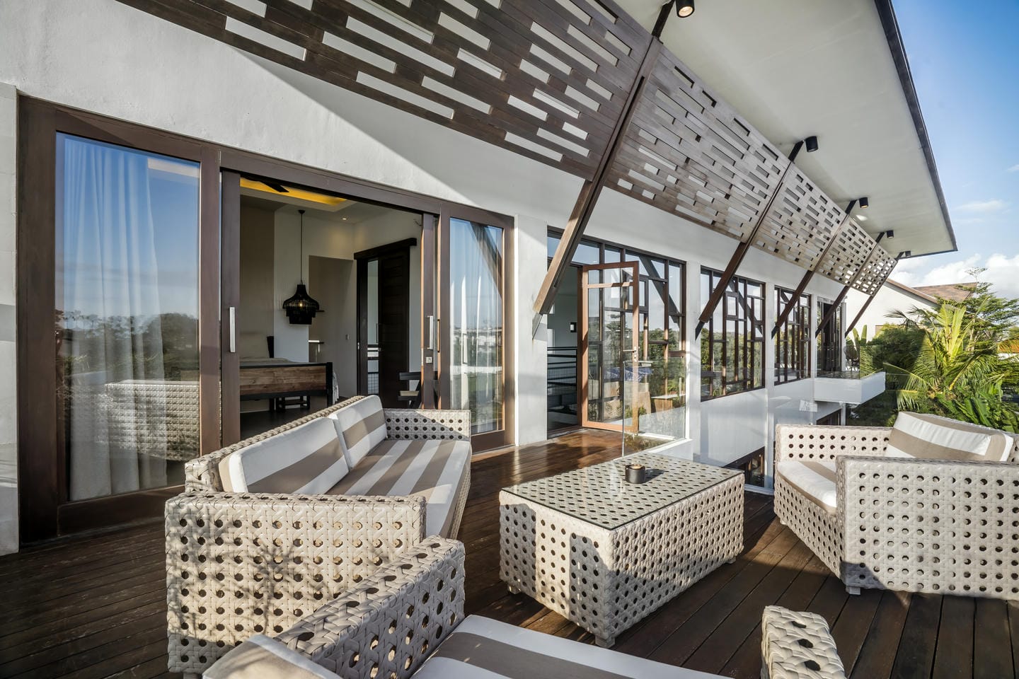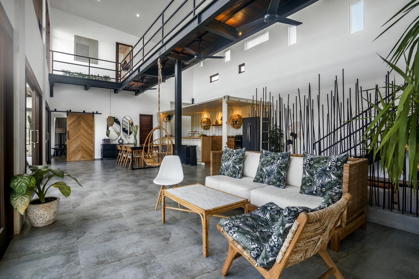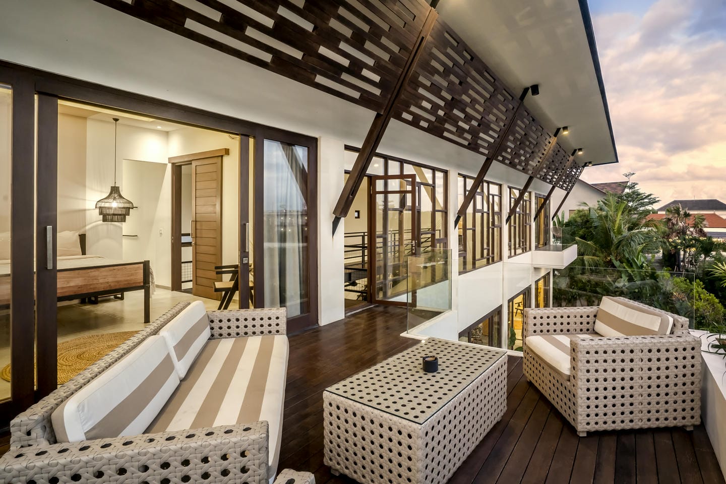 Designed for true tropical living, the villa’s outdoor area centers around a refreshing private pool framed by lush landscaping. A wooden deck on the second floor, complete with comfortable seating, provides the perfect setting for sunbathing.