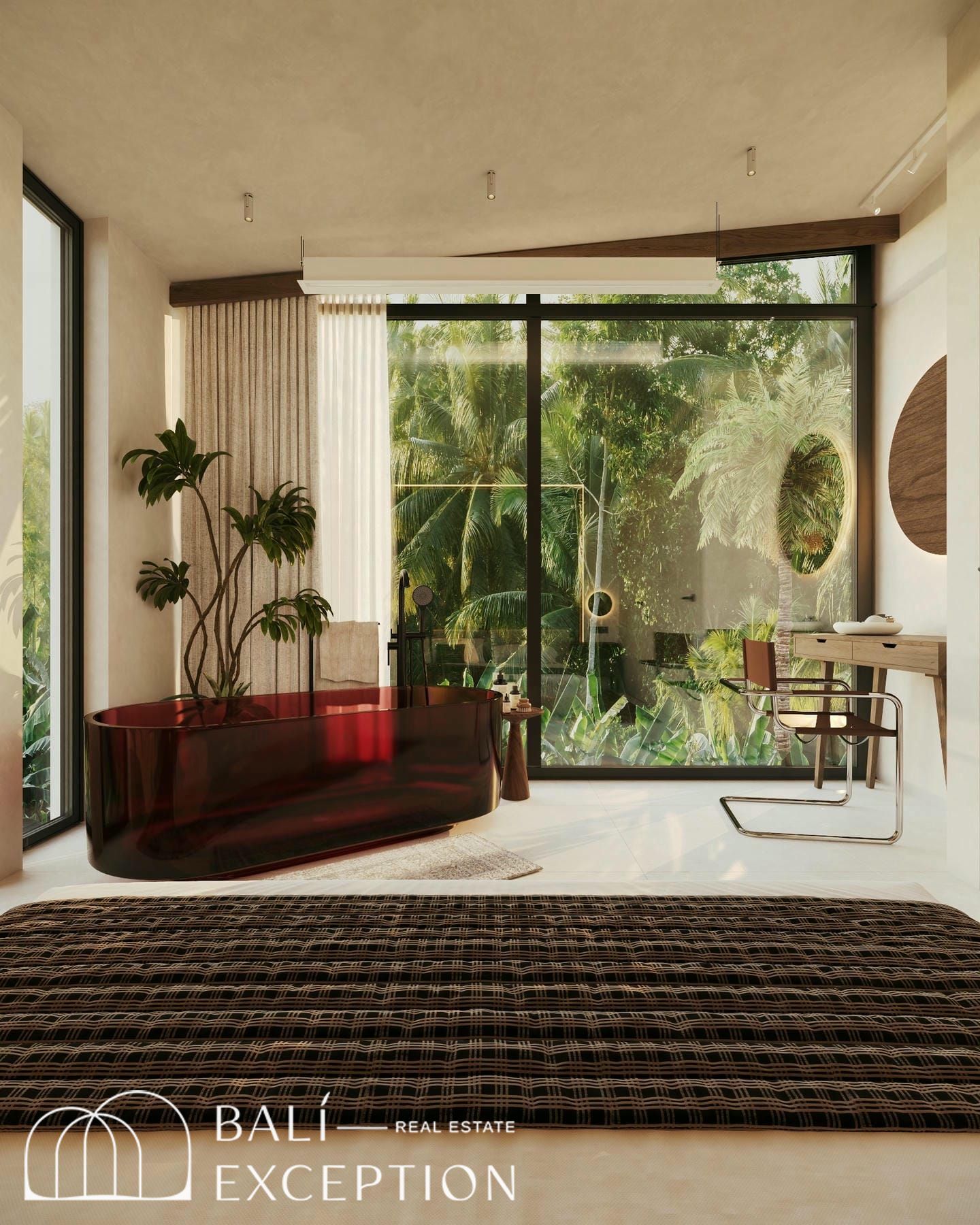 The outdoor space is designed for both relaxation and entertaining, centered around a private swimming pool surrounded by tropical greenery.