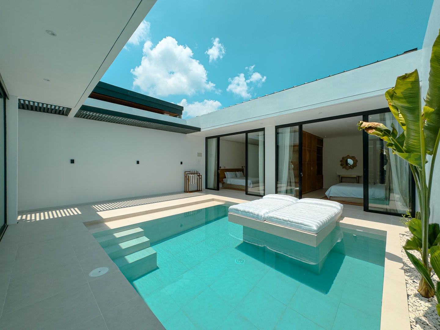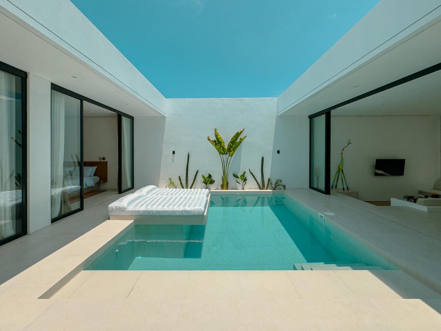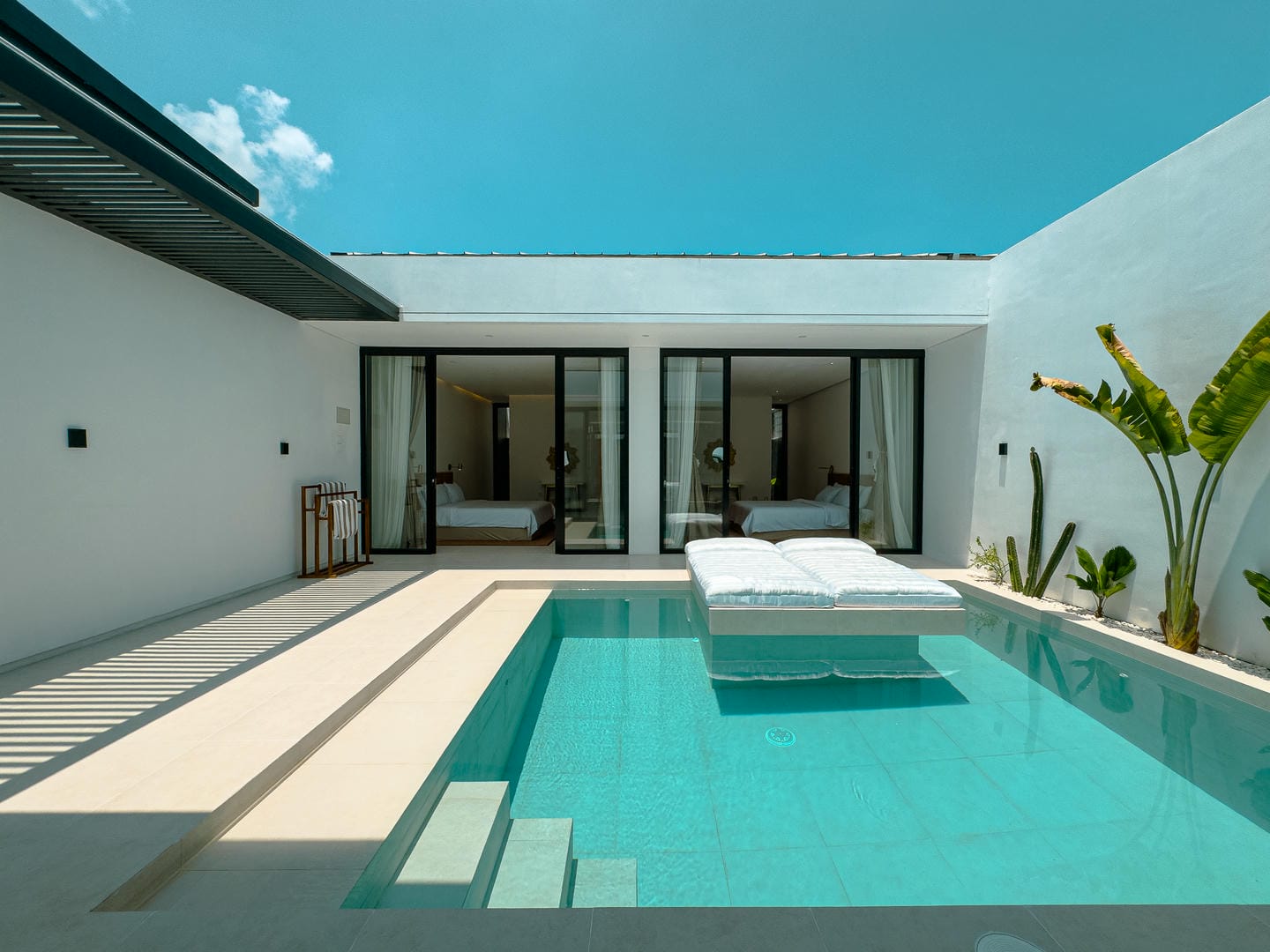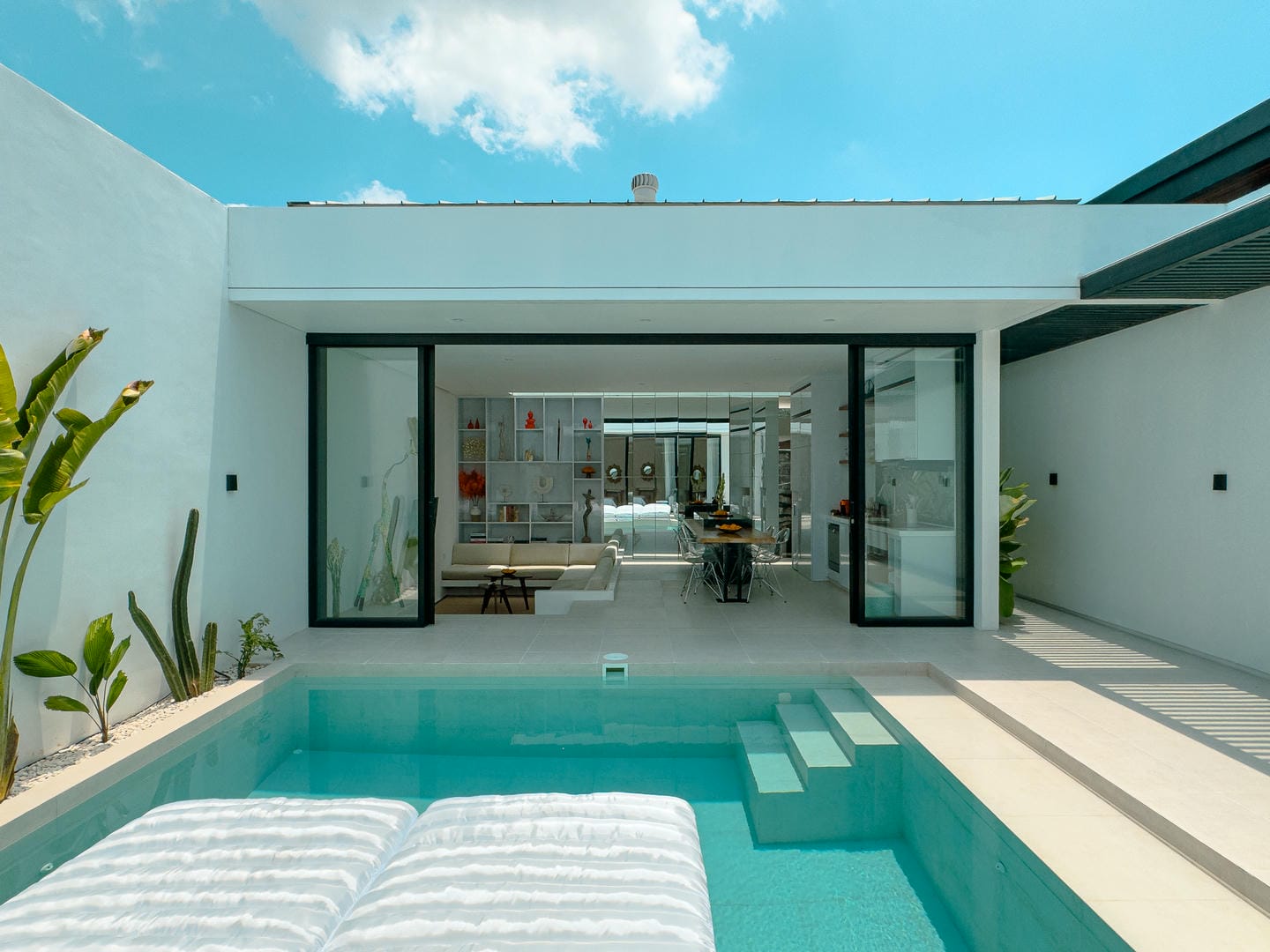 Outside, the villa presents a beautiful private pool framed by tropical landscaping and clean architectural lines. An in-pool daybed and vertical garden wall elevate the space, making it perfect for both lounging and entertaining.