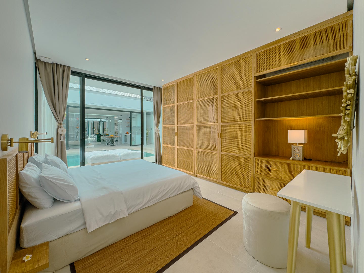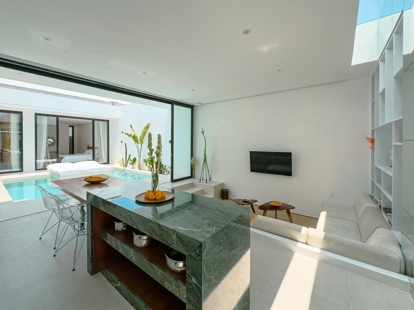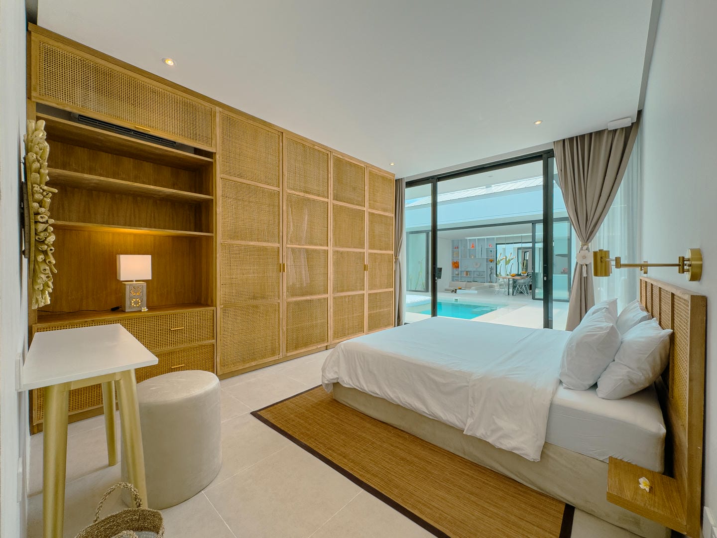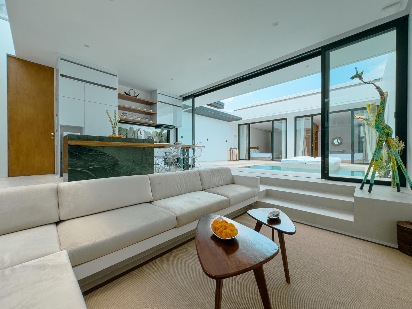 Outside, the villa presents a beautiful private pool framed by tropical landscaping and clean architectural lines. An in-pool daybed and vertical garden wall elevate the space, making it perfect for both lounging and entertaining.