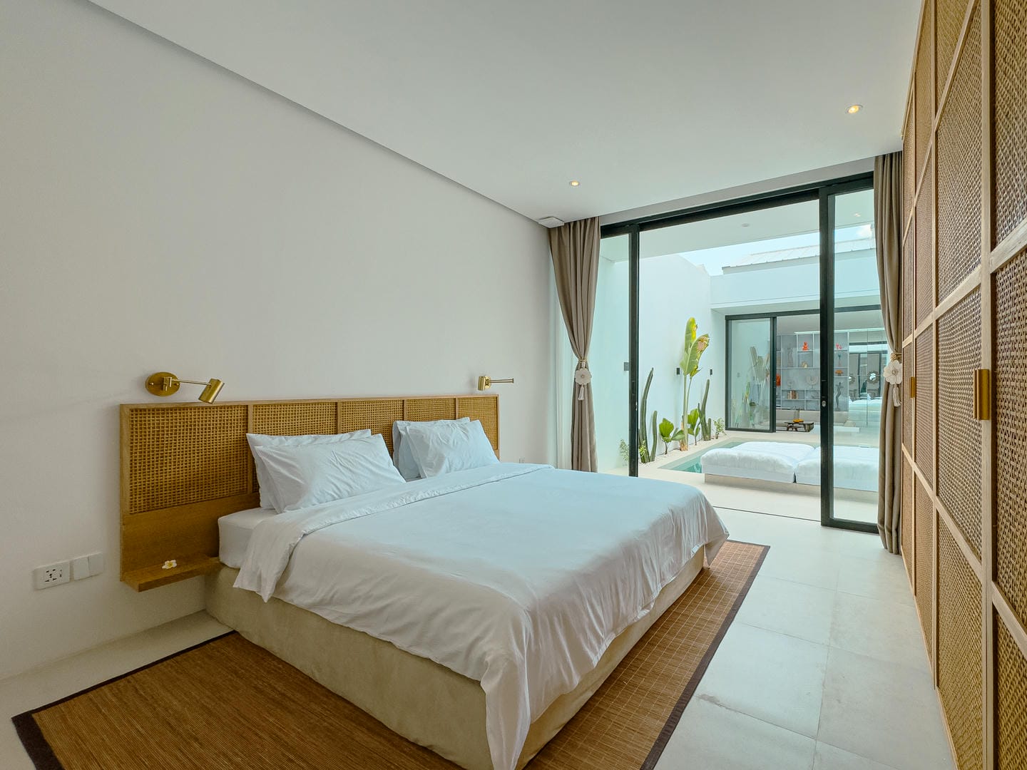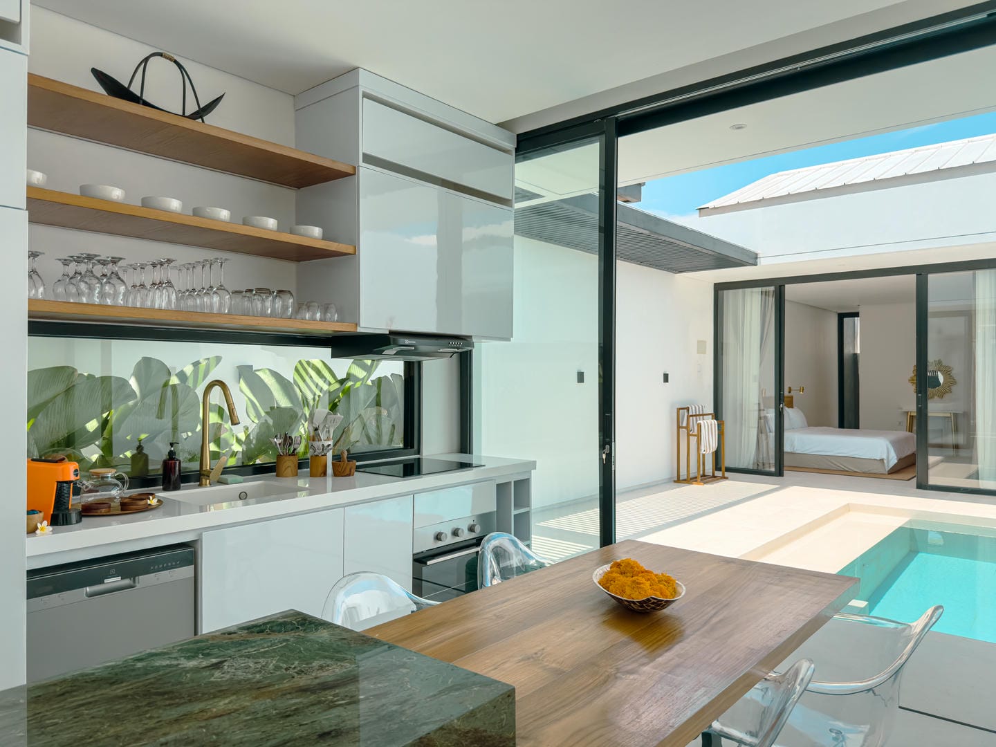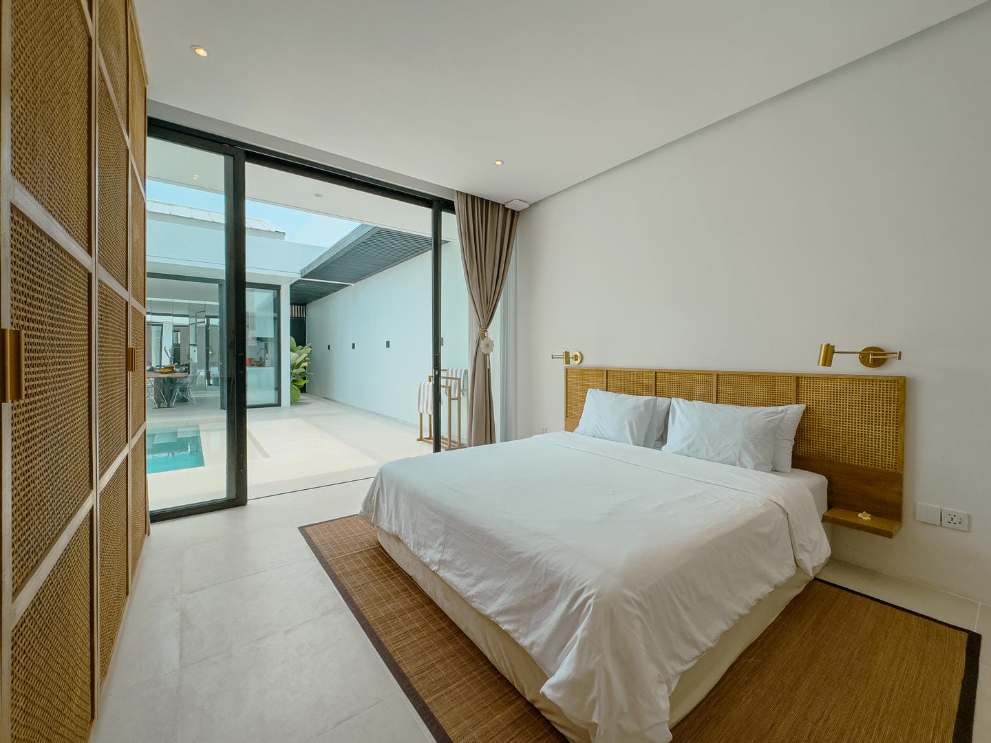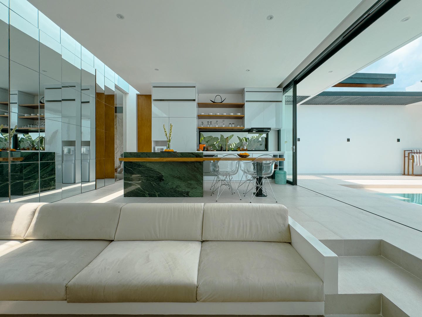 Outside, the villa presents a beautiful private pool framed by tropical landscaping and clean architectural lines. An in-pool daybed and vertical garden wall elevate the space, making it perfect for both lounging and entertaining.
