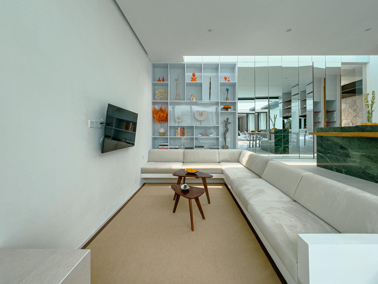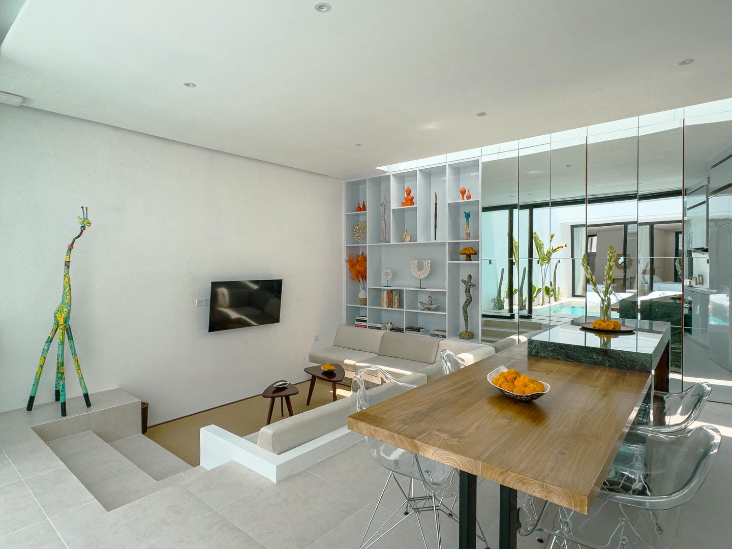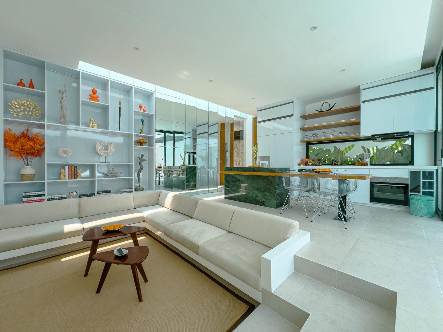 Step inside to find a refined interior that reflects a minimalist-modern style with warm natural elements. The open-plan living area features a stylish sunken lounge, sleek kitchen with marble island, and curated shelving that adds both function and aesthetic charm. The neutral palette, wood accents, and soft lighting create an inviting and calming atmosphere.