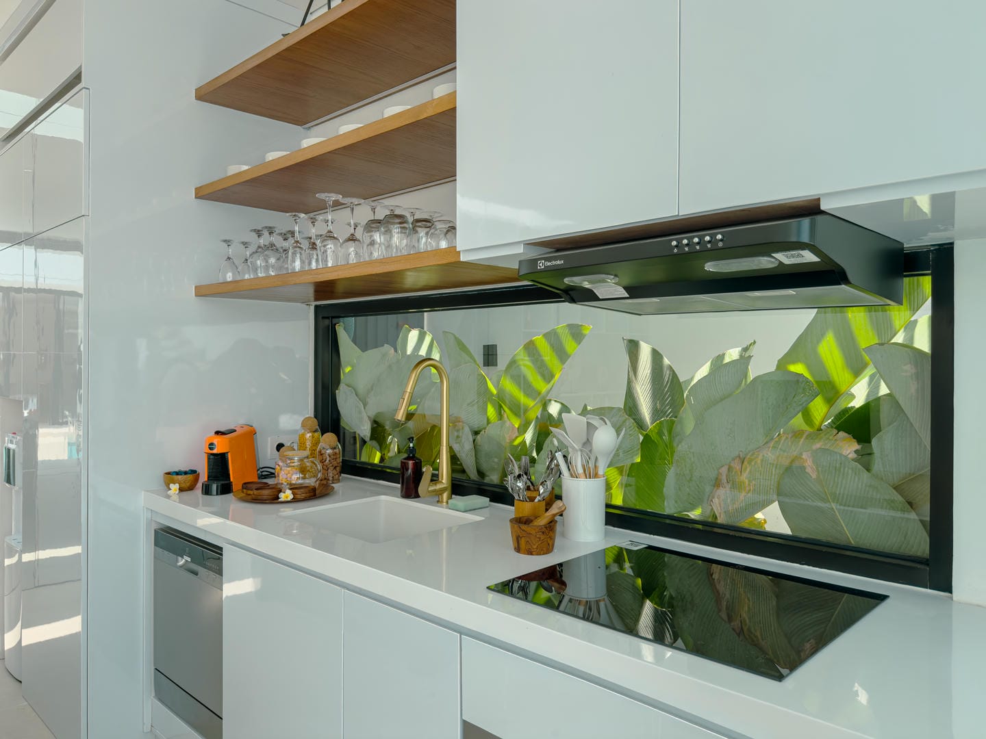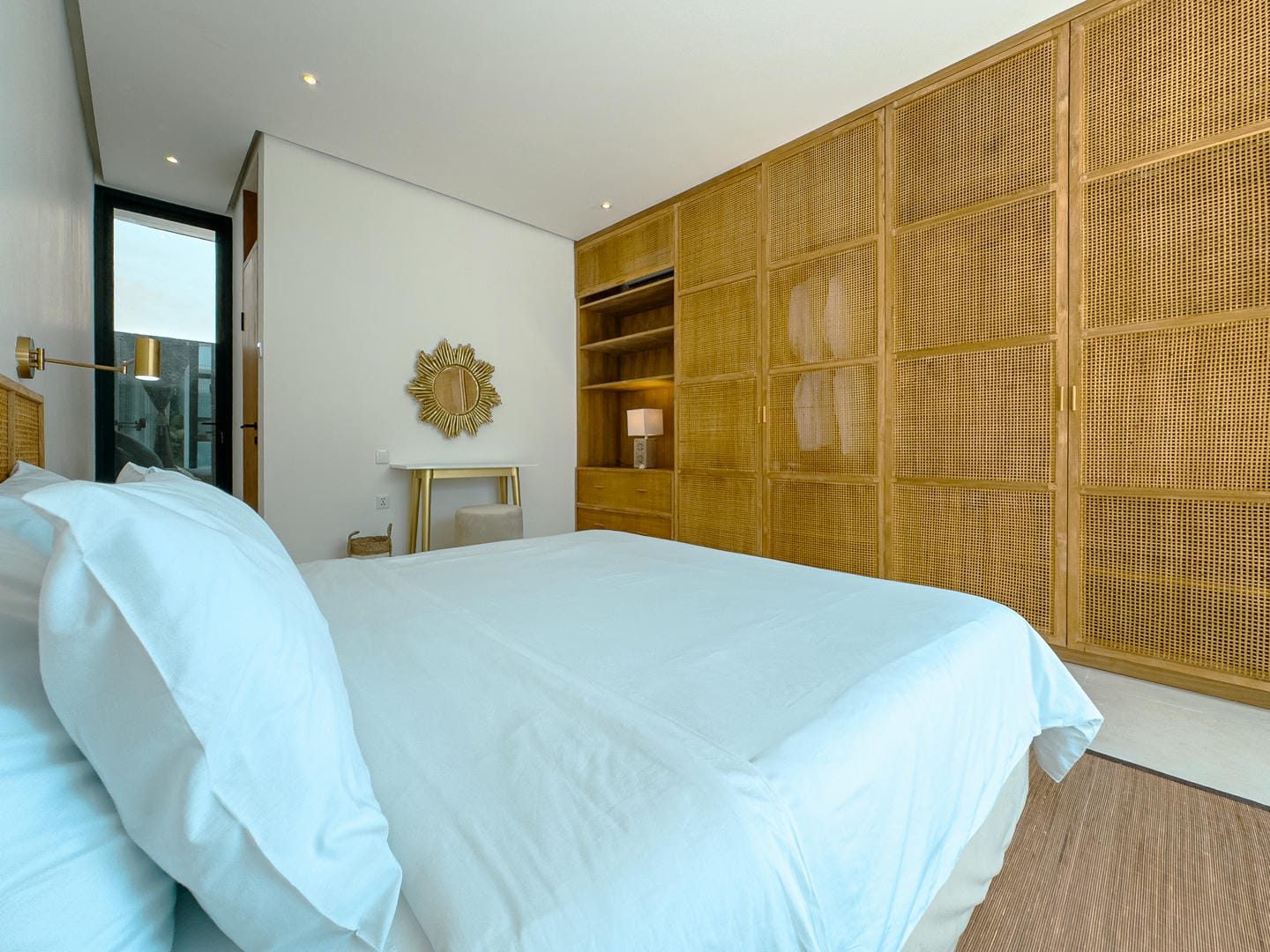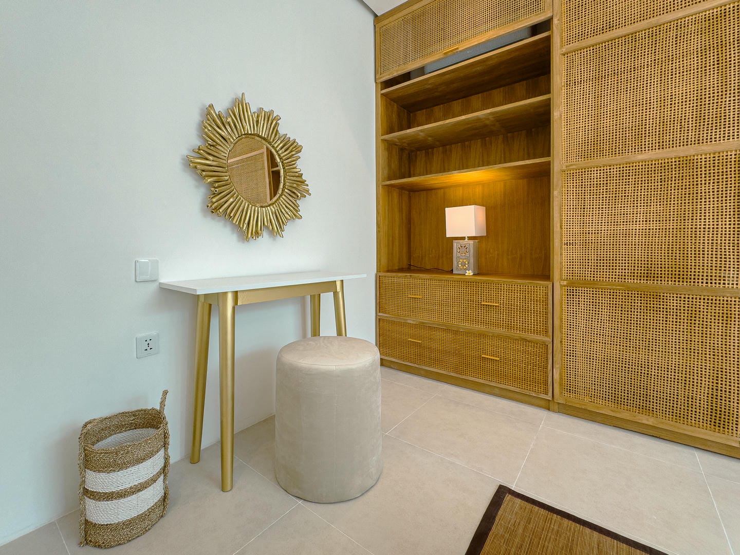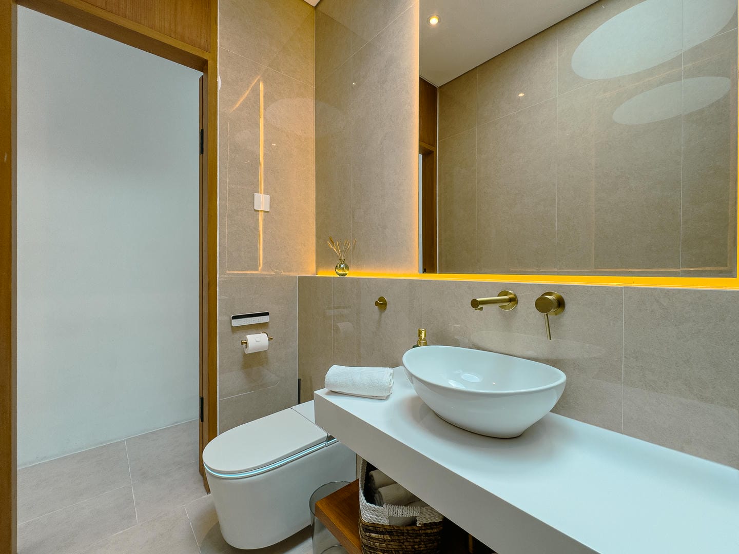 Step inside to find a refined interior that reflects a minimalist-modern style with warm natural elements. The open-plan living area features a stylish sunken lounge, sleek kitchen with marble island, and curated shelving that adds both function and aesthetic charm. The neutral palette, wood accents, and soft lighting create an inviting and calming atmosphere.