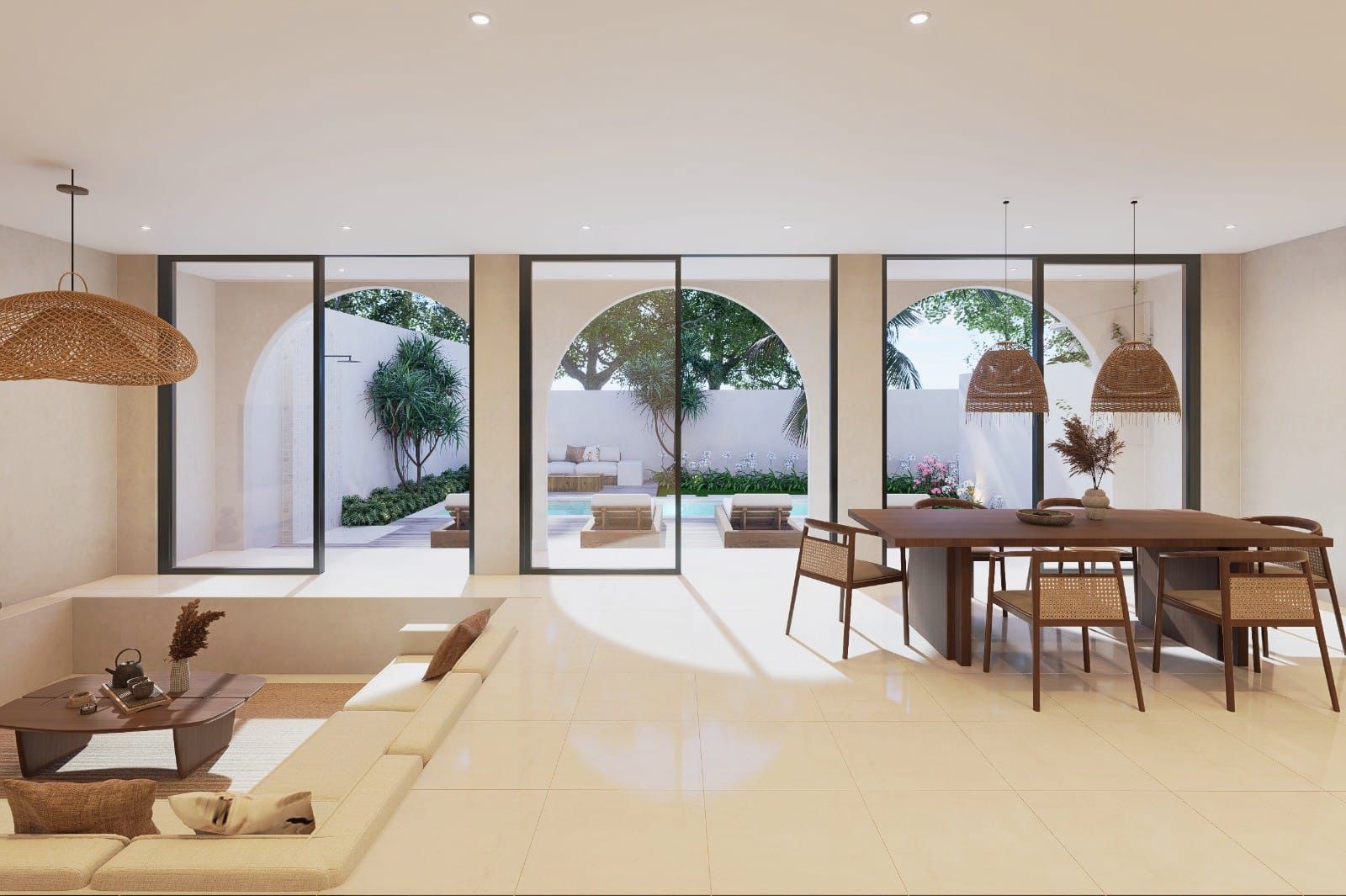 The outdoor area is beautifully designed with a private swimming pool surrounded by a wooden deck and sun loungers. The arched architectural details add a unique character, while the garden space offers a serene and private tropical ambiance—perfect for relaxing or entertaining.