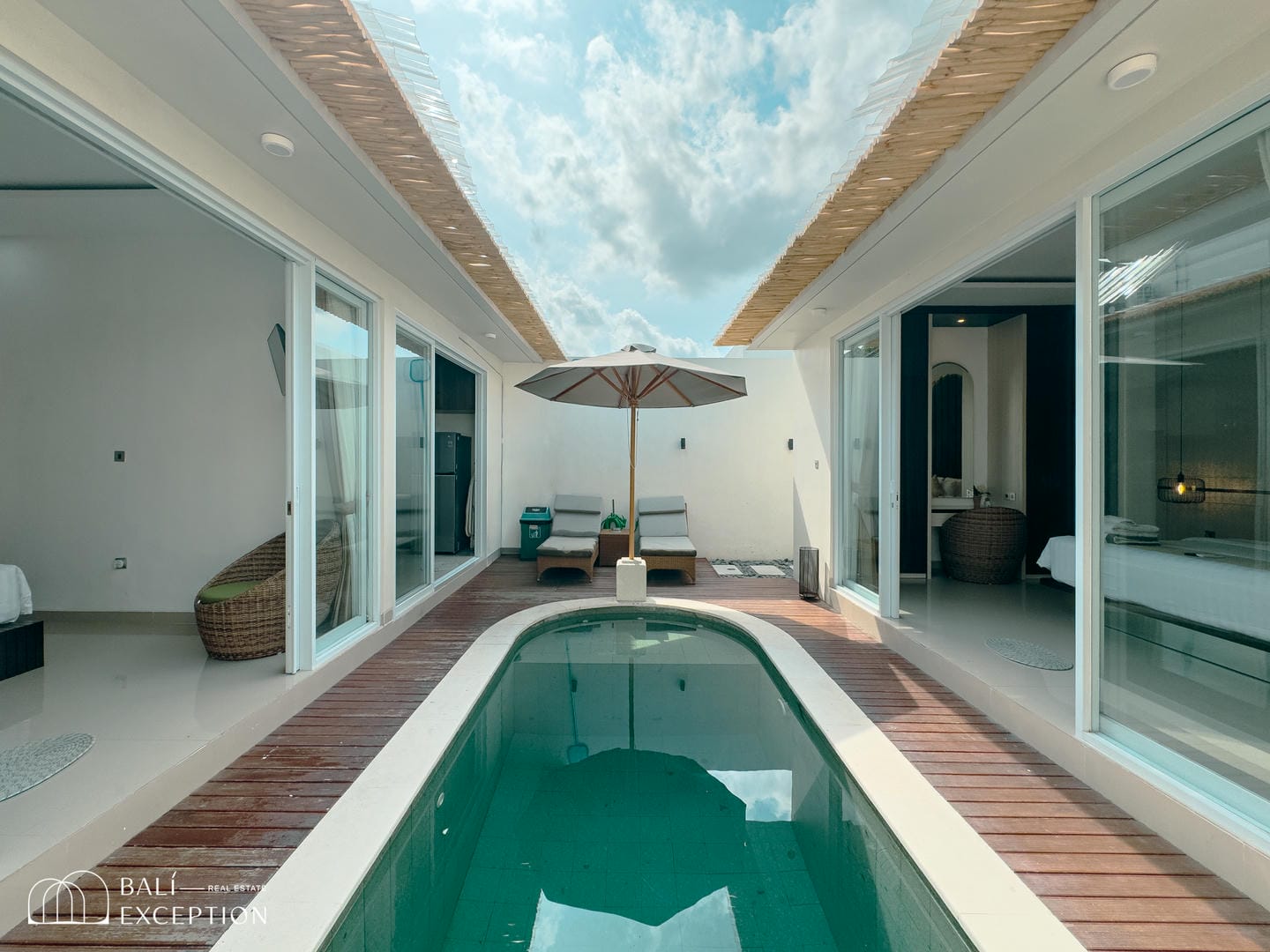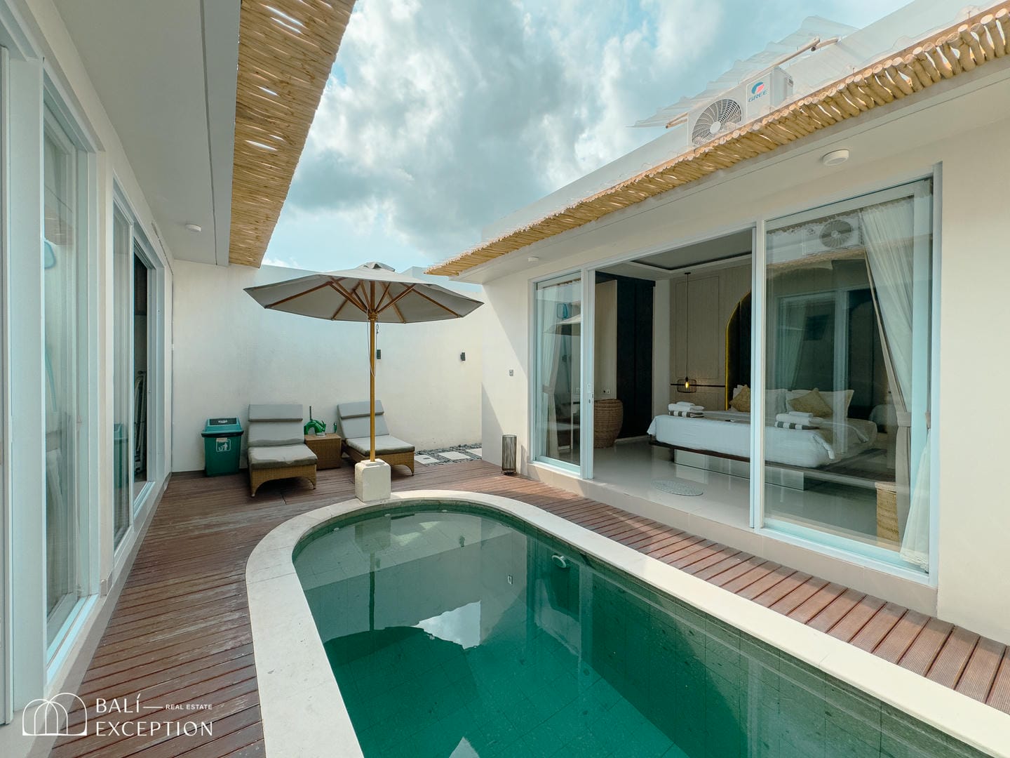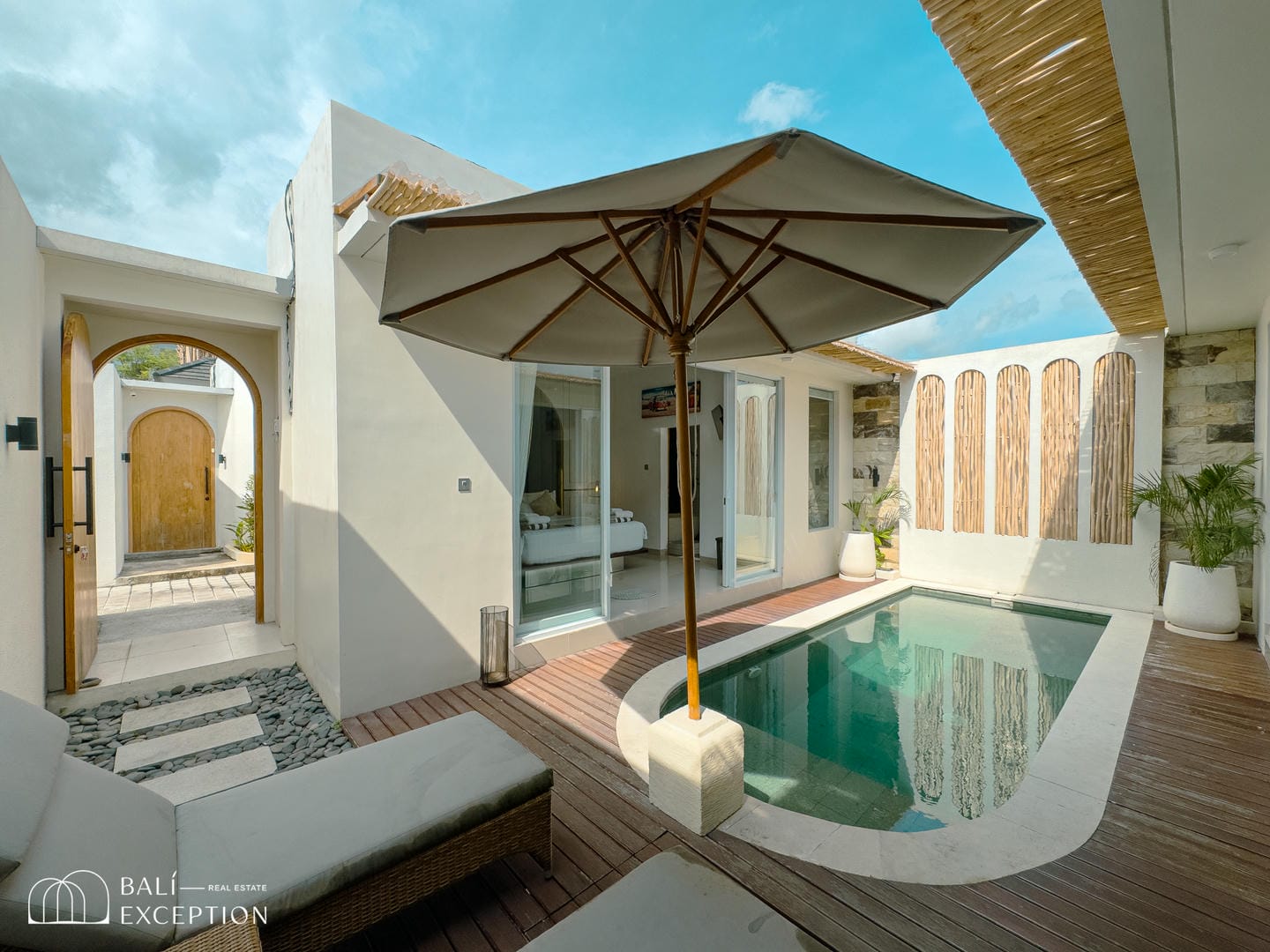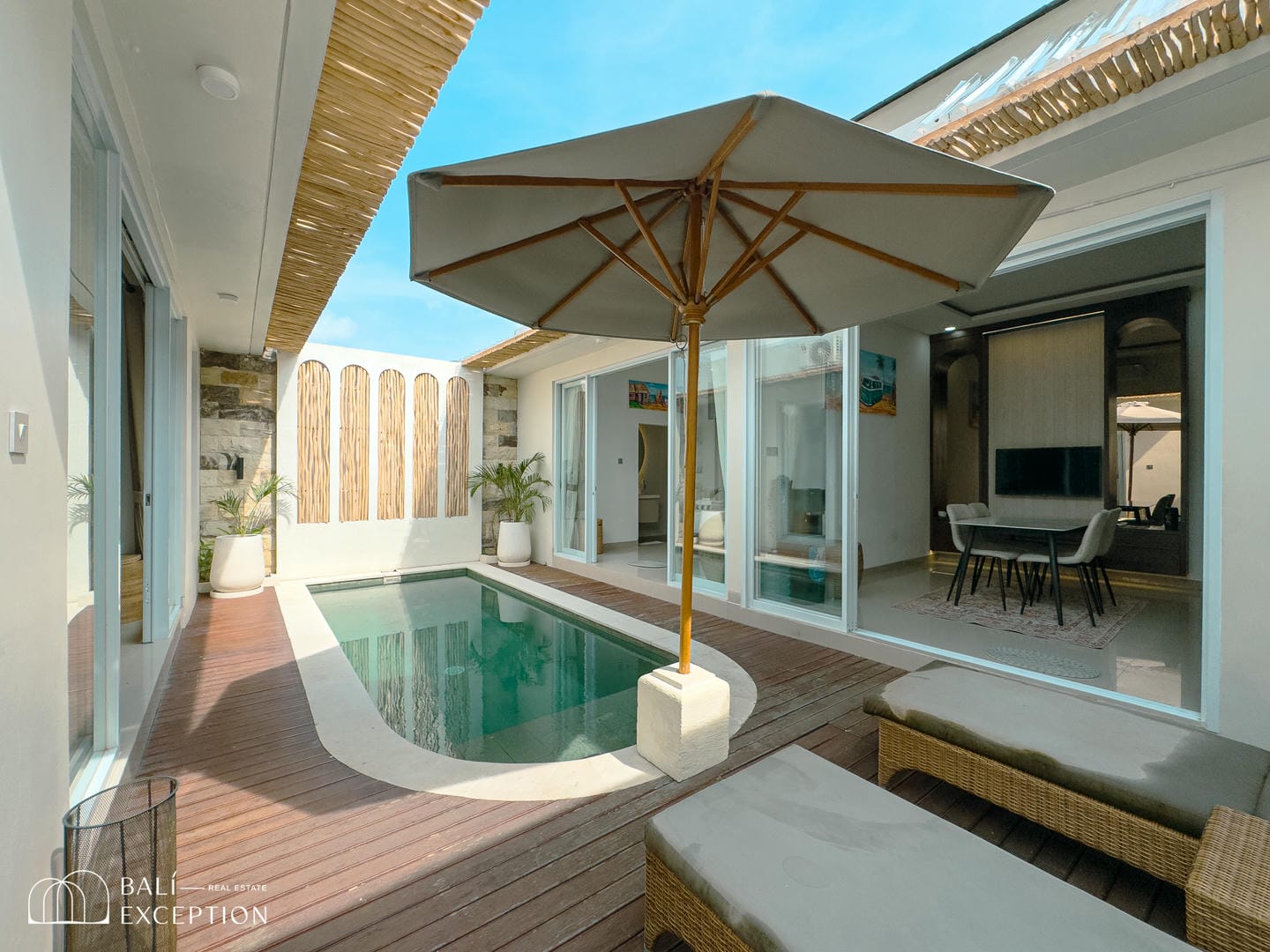 The villa opens onto a private tropical courtyard featuring a refreshing pool. Sun loungers and a shaded seating area create the perfect spot to unwind, relax, and soak up the Bali sunshine.