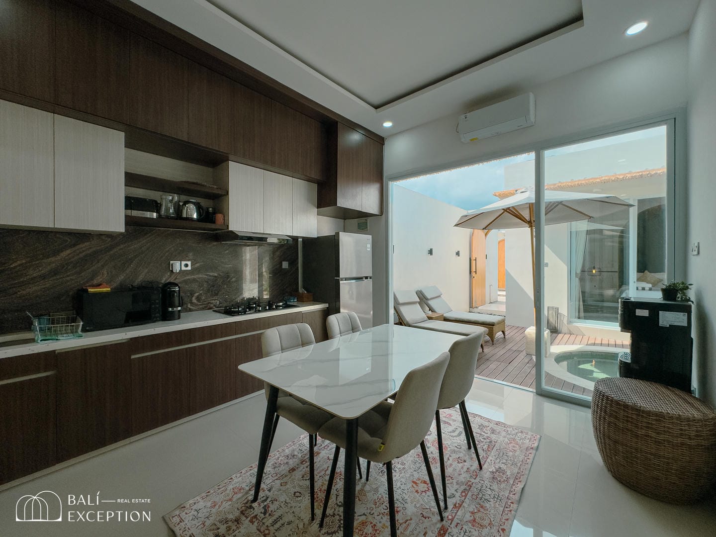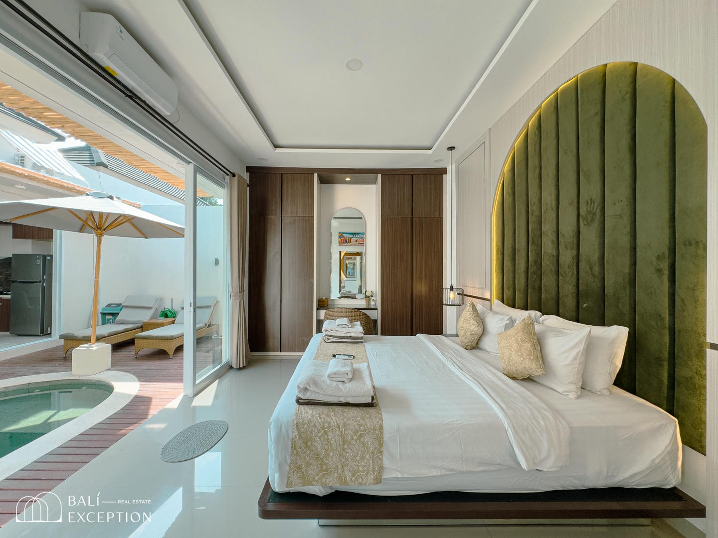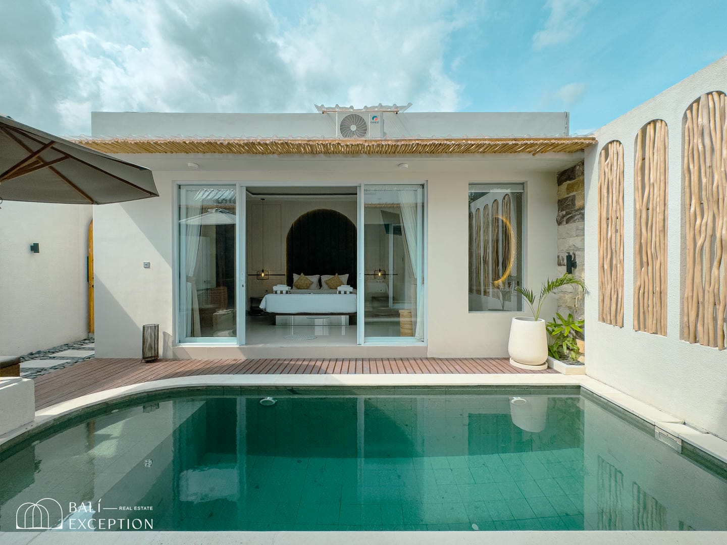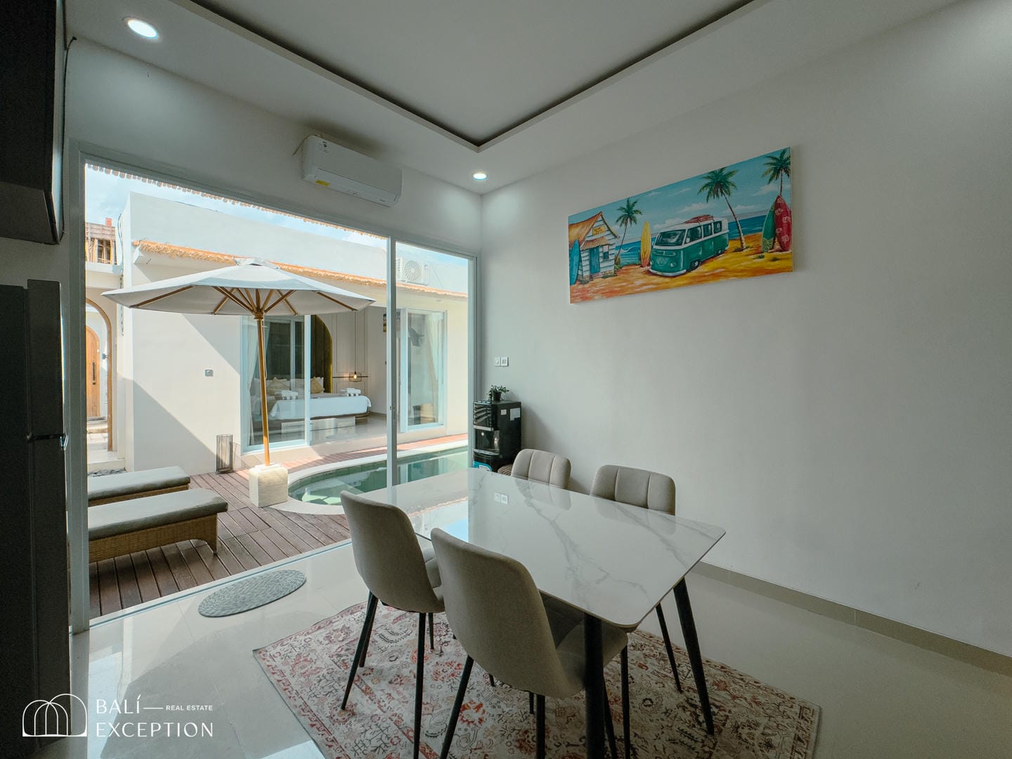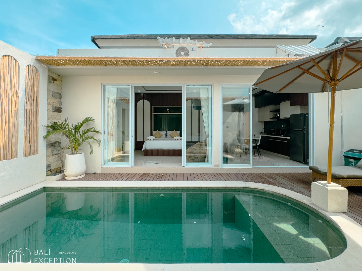 The villa opens onto a private tropical courtyard featuring a refreshing pool. Sun loungers and a shaded seating area create the perfect spot to unwind, relax, and soak up the Bali sunshine.