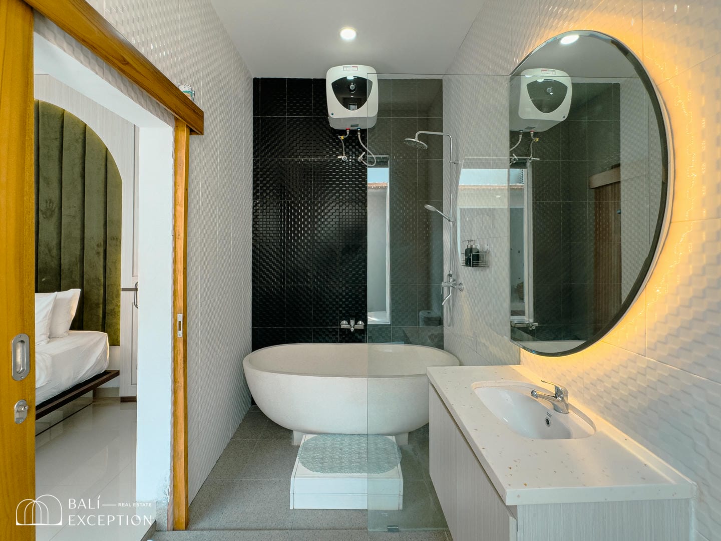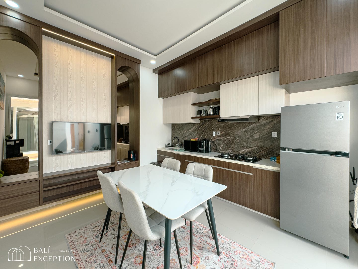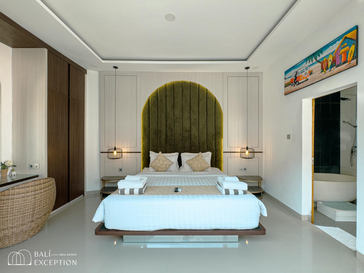 Step into an inviting living and dining area enhanced by warm wood accents and modern finishes. This fully furnished 2-bedroom villa features ensuite bathrooms, a sleek and fully equipped kitchen, and a serene master bedroom. The highlight is the luxurious bathroom with its elegant stone soaking tub—bringing a spa-like feel to your everyday living.