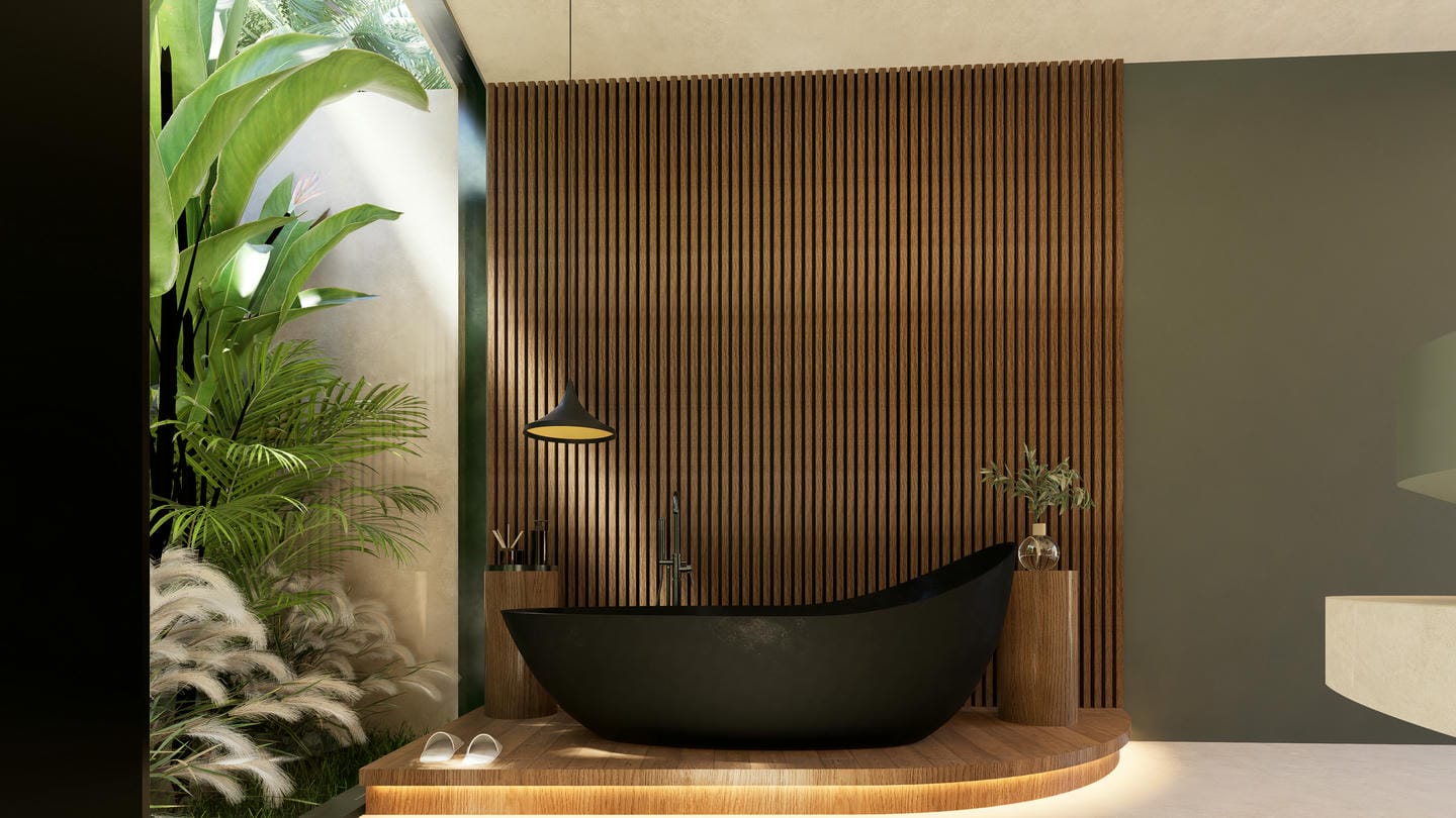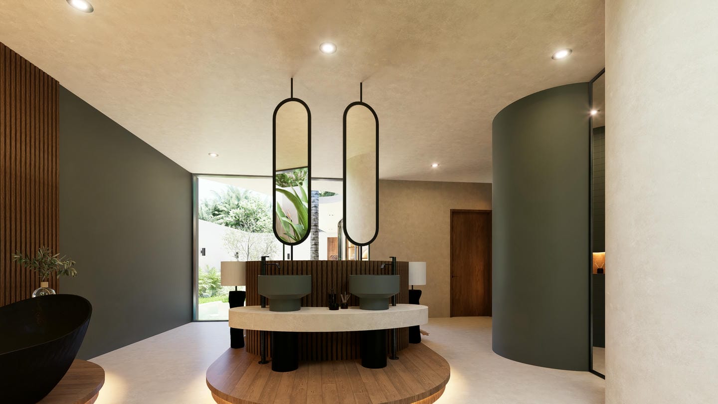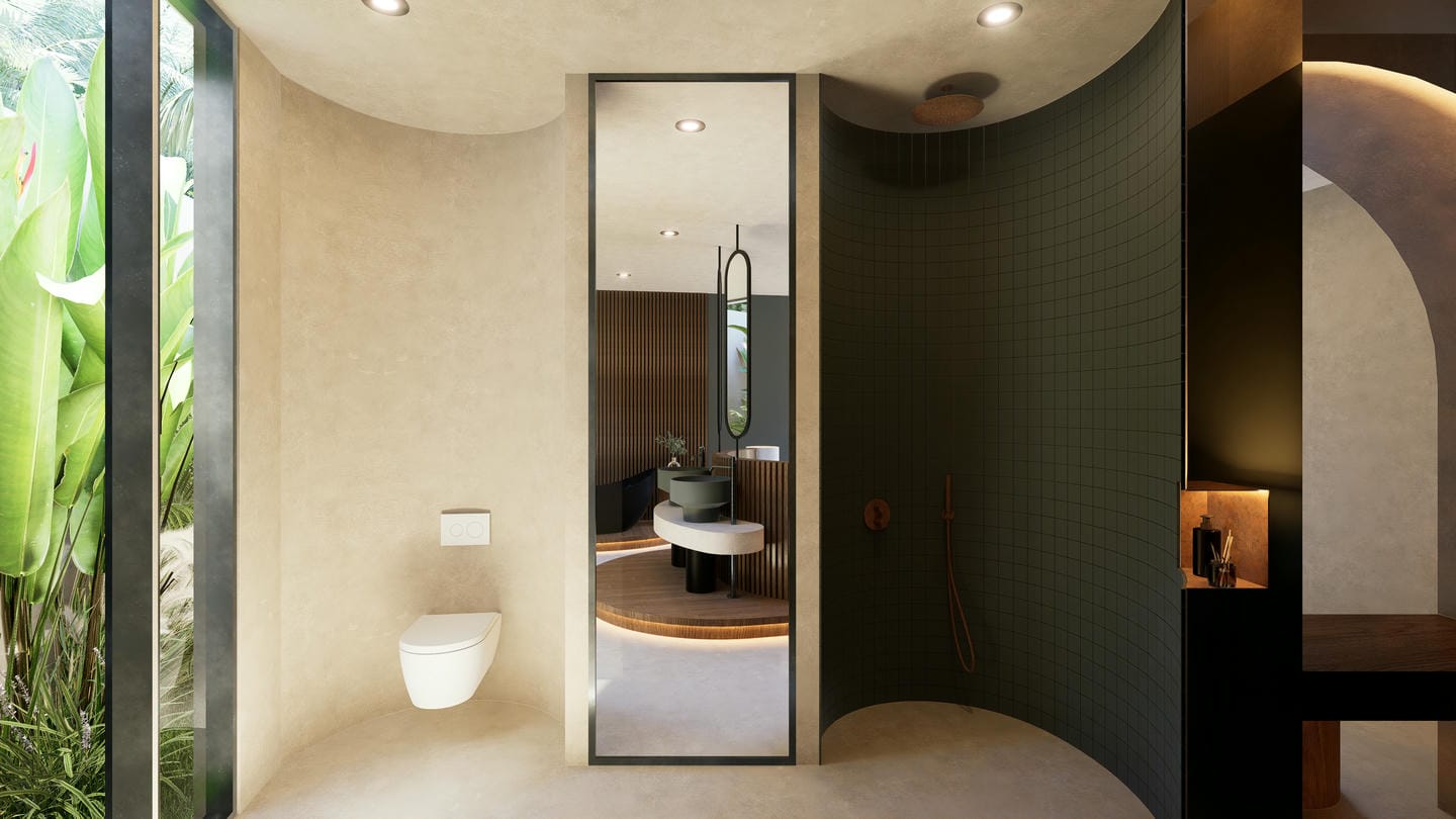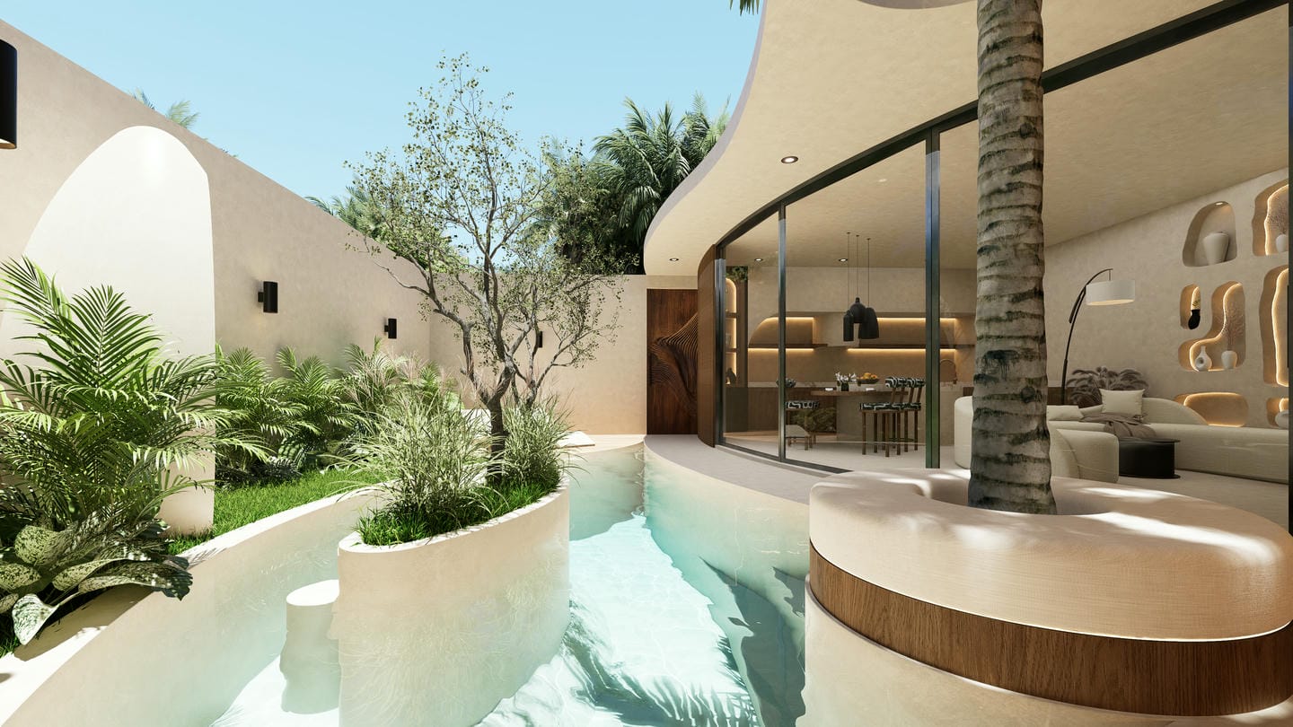 Outdoors, the villa is centered around a unique curved swimming pool with lush tropical landscaping. The design incorporates natural elements, including a statement tree feature and serene garden views, creating a peaceful oasis perfect for relaxation.