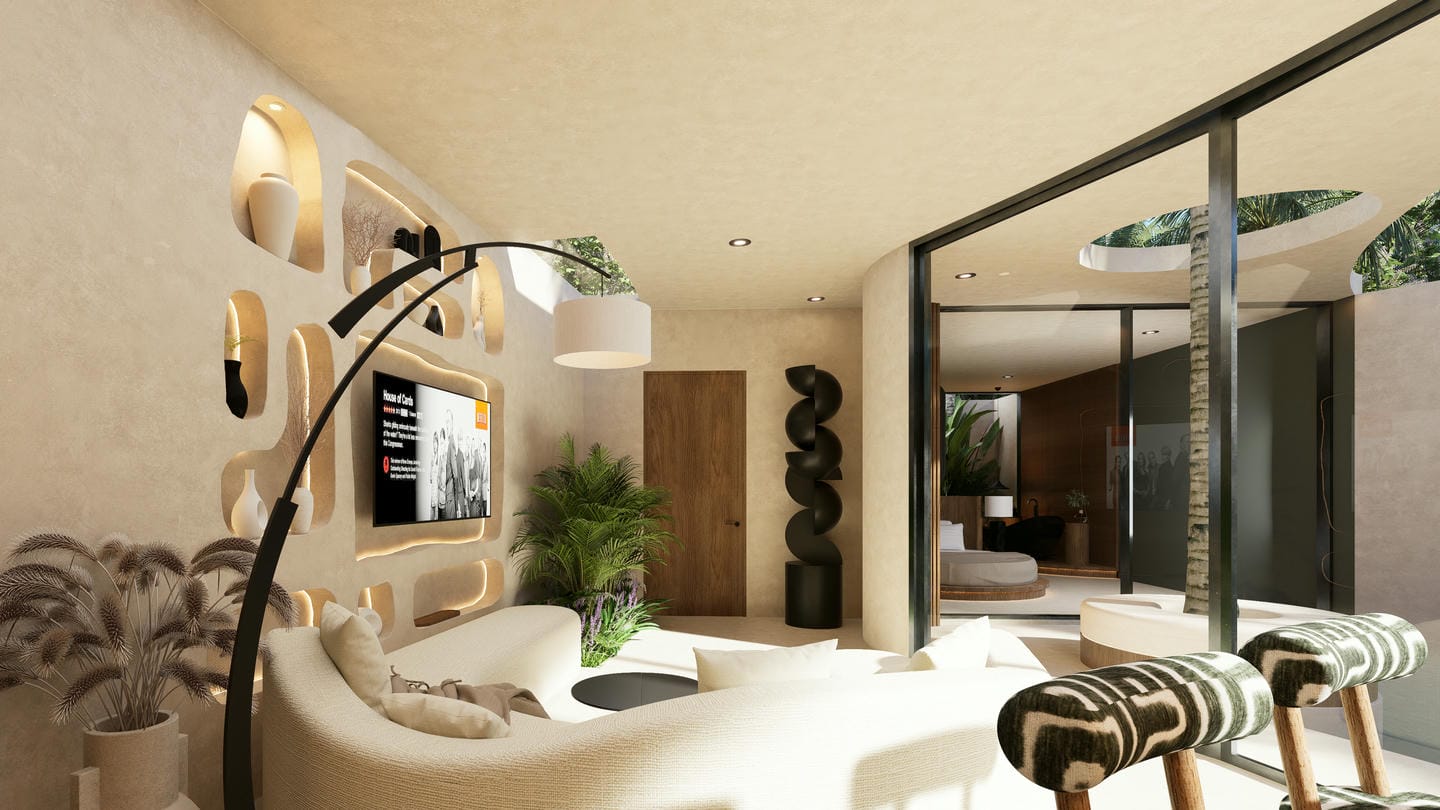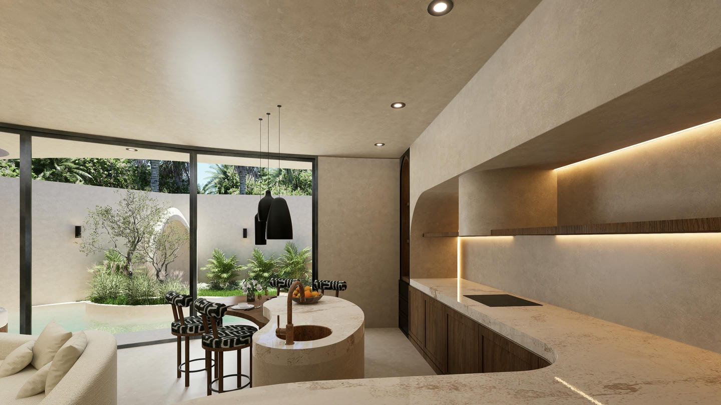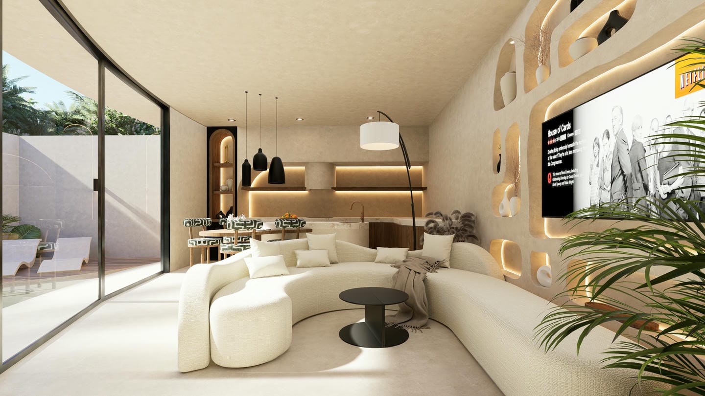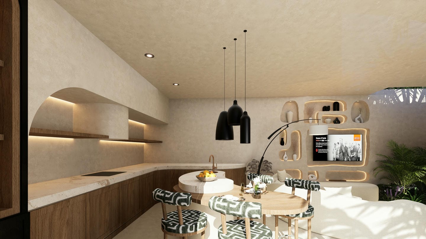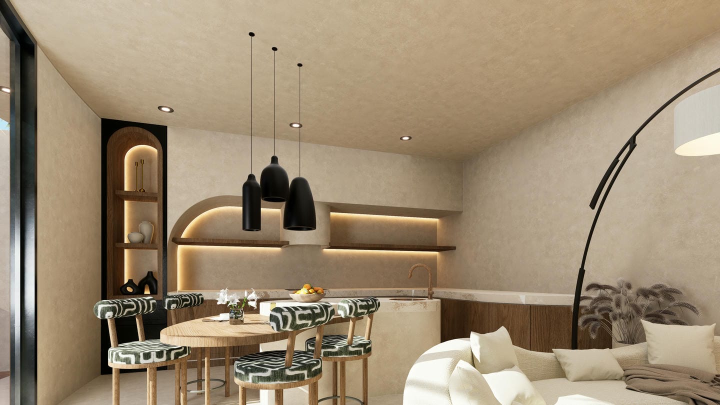 The interior showcases a modern organic style, featuring soft curves, warm earthy tones, and custom-built elements. The open-plan living area blends seamlessly with a minimalist kitchen, complemented by textured walls, ambient lighting, and carefully curated furnishings that create a cozy yet sophisticated atmosphere.