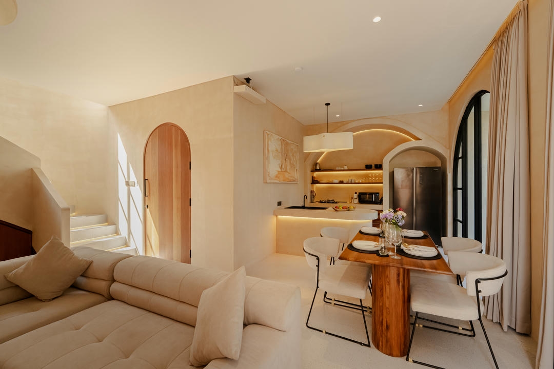 Spread across two levels, the villa features 2 bedrooms with ensuite bathrooms and a powder room, an enclosed living room with high ceilings, and a dining area with an equipped kitchen. The property comes fully furnished, ready for you to move in.