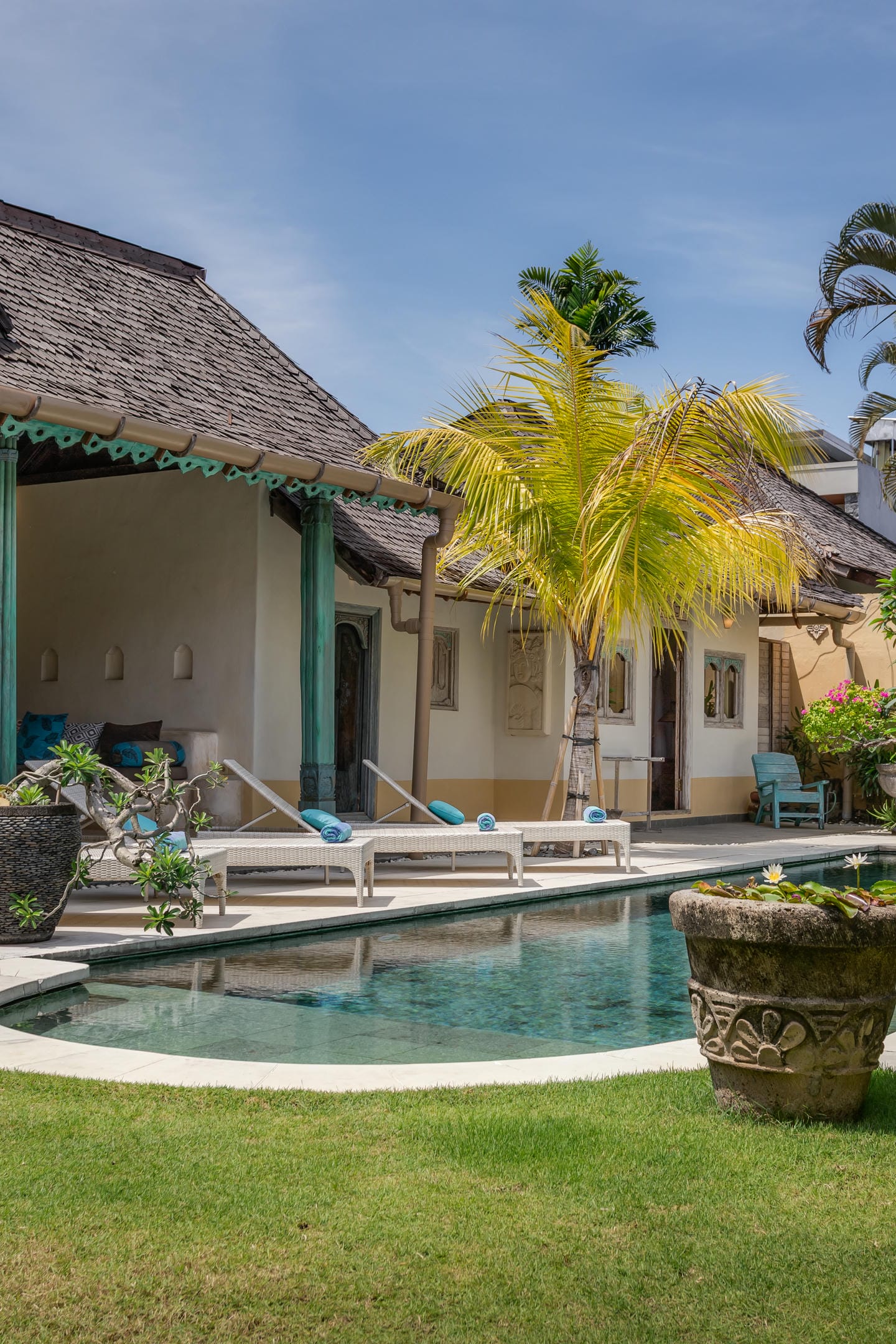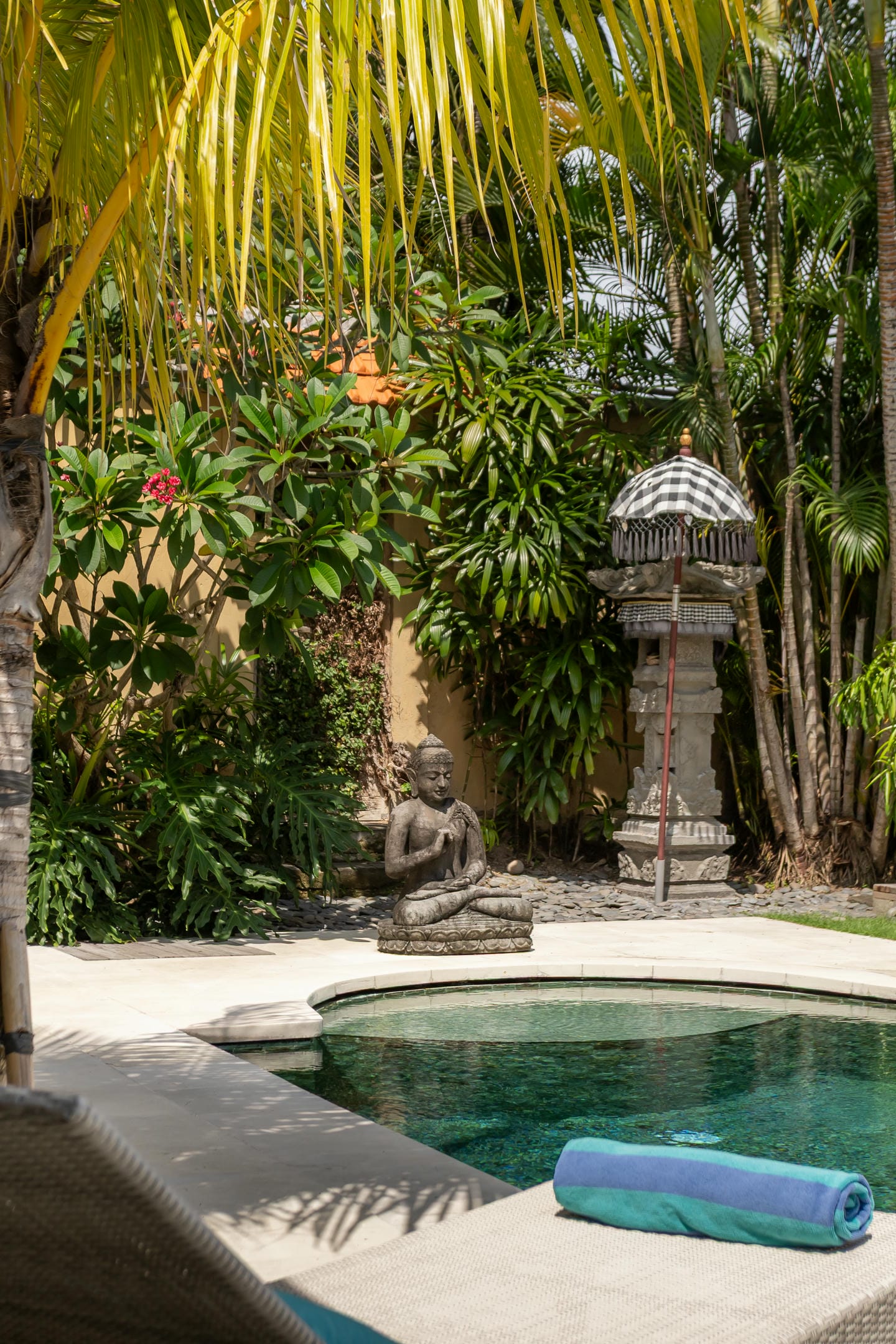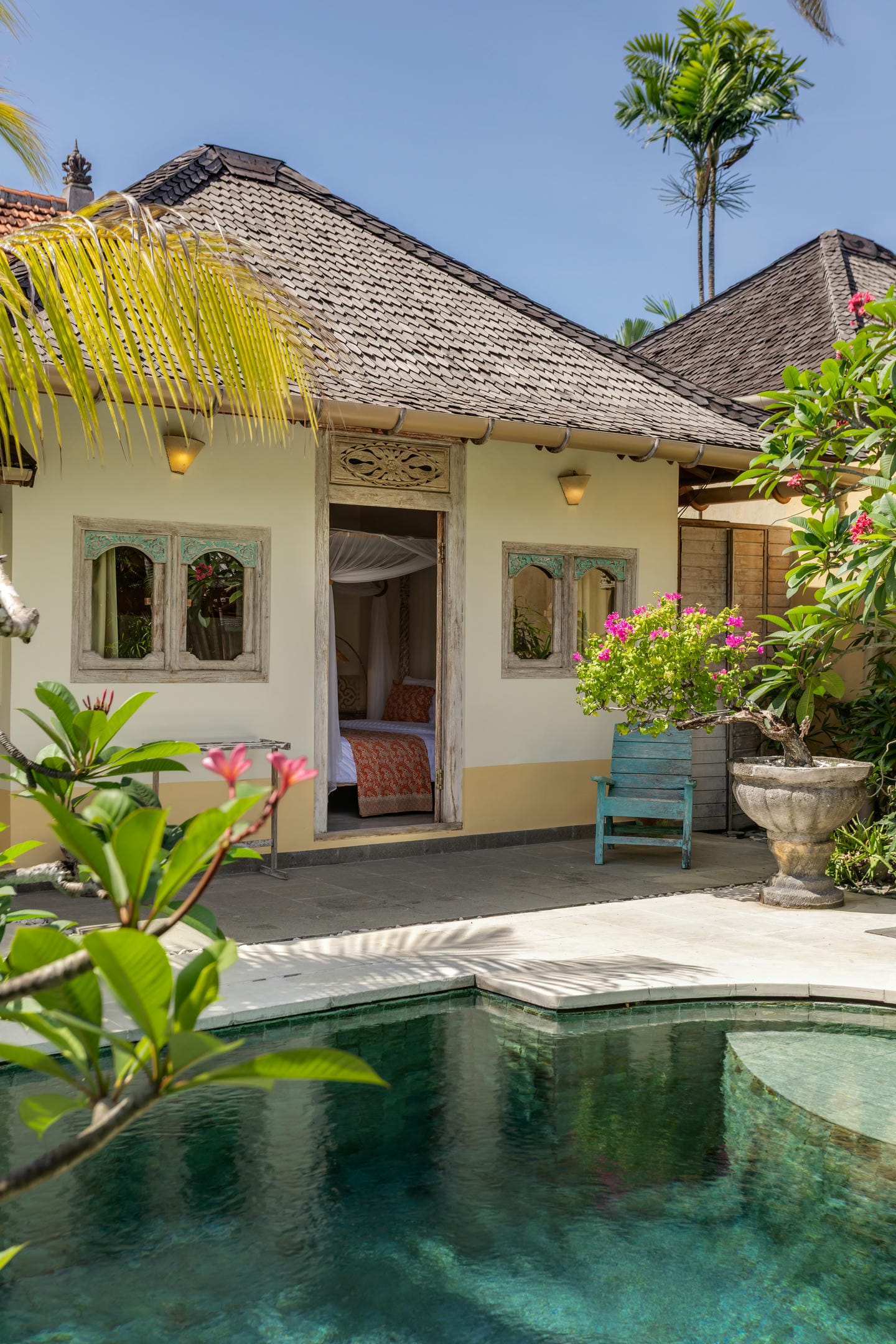 Outdoors, the villa features a serene private pool surrounded by lush gardens, frangipani trees, and inviting sun loungers. The view from every angle feels tranquil, tropical, and perfectly secluded.