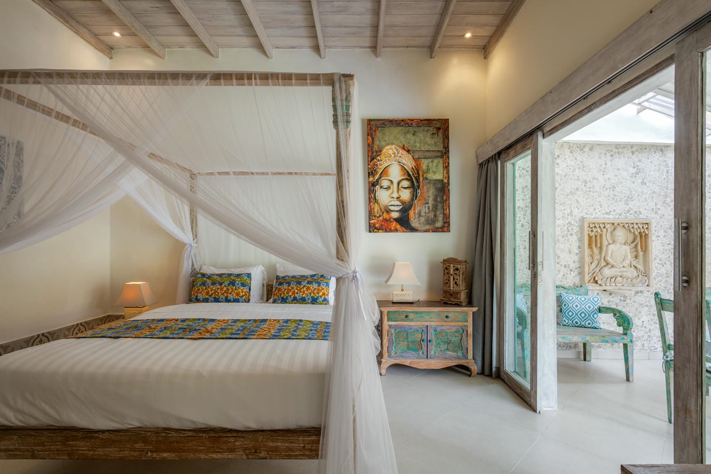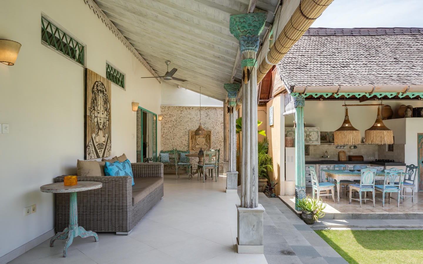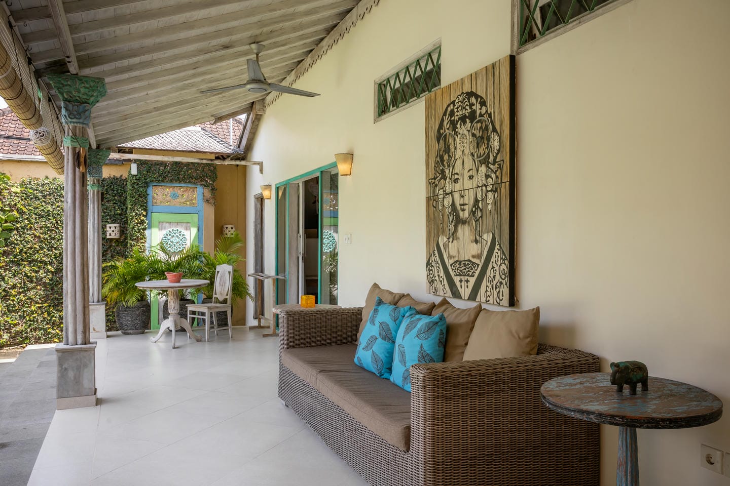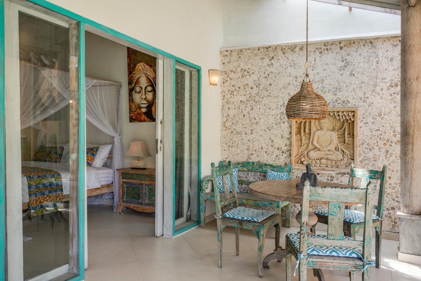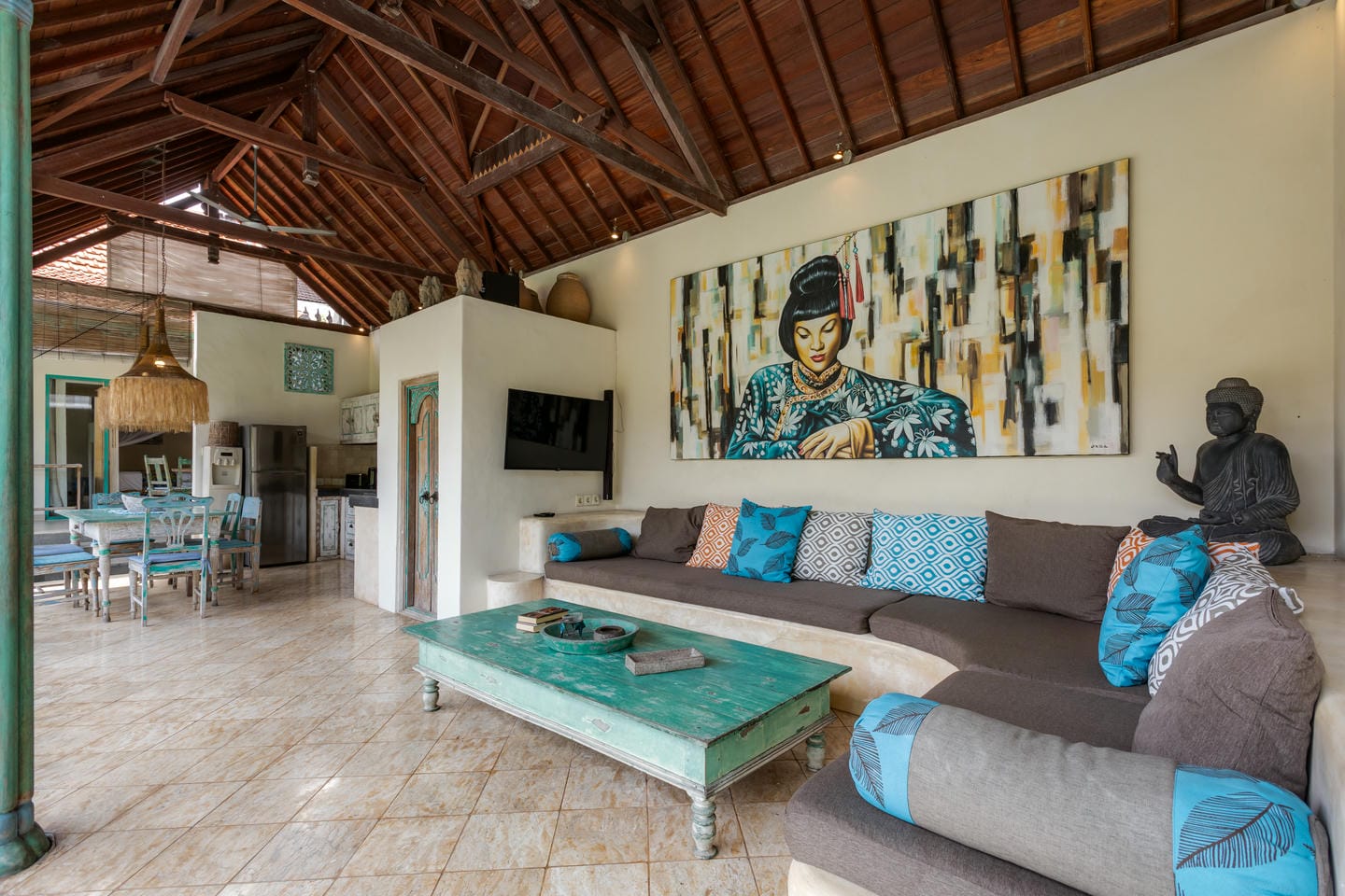 Inside, the villa showcases a warm blend of Balinese tropical charm and vintage boho style. Hand-carved doors, rustic wood furniture, colorful artwork, and open-concept living areas create a cozy, character-filled atmosphere throughout the home.