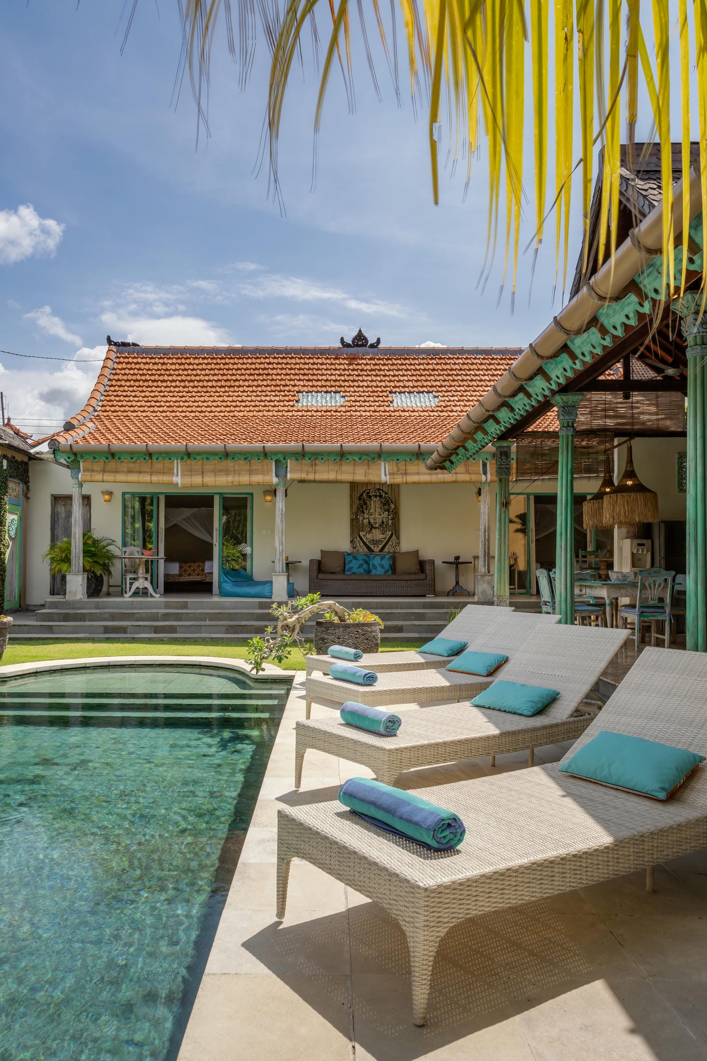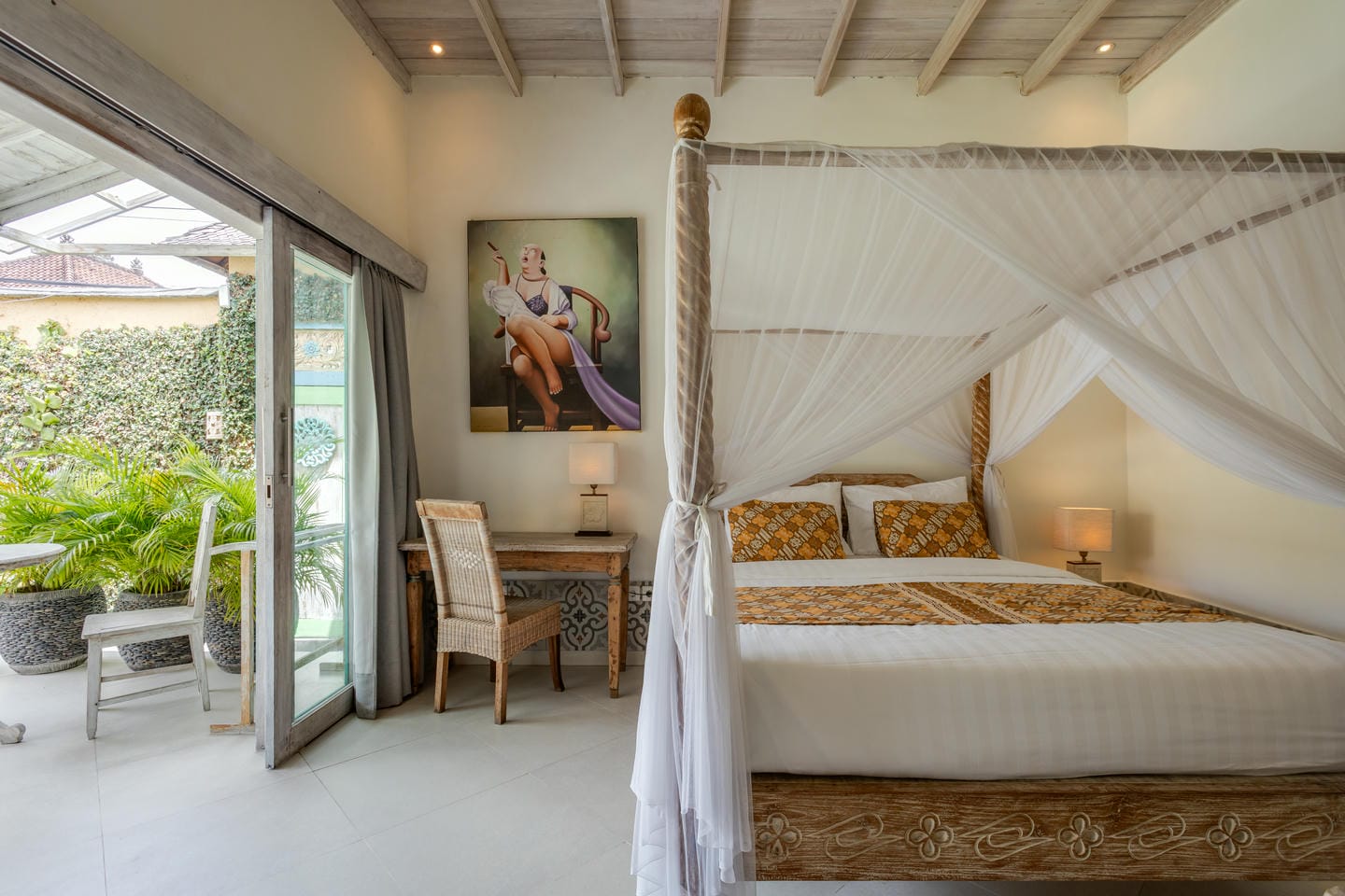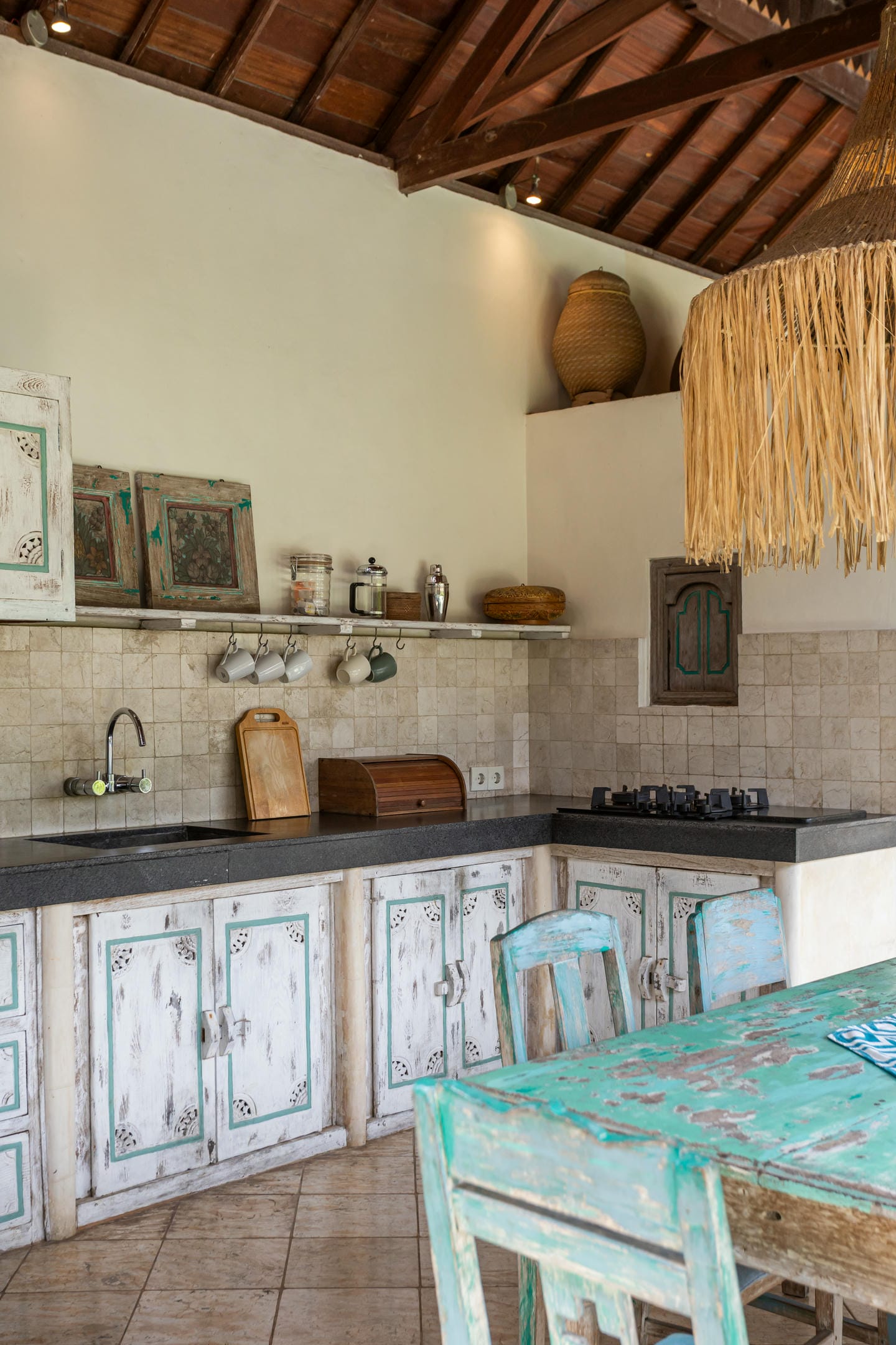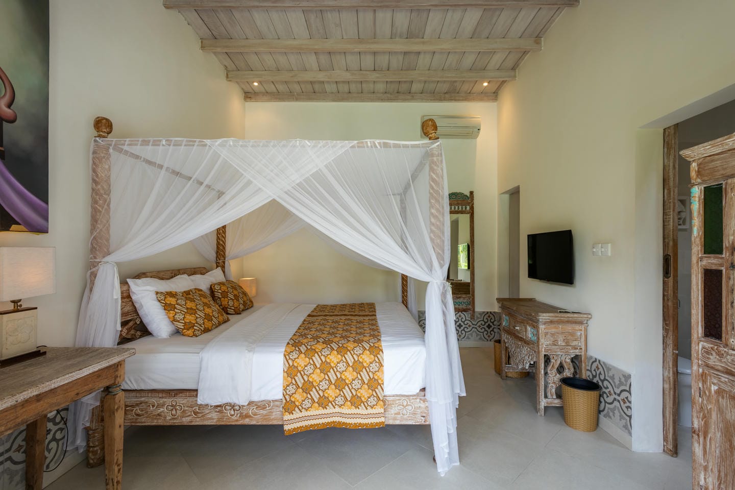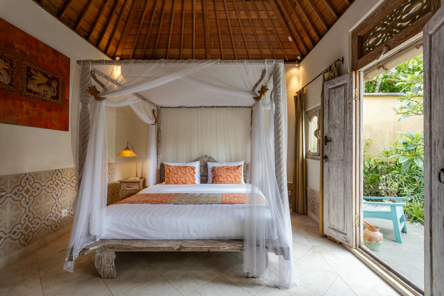 Inside, the villa showcases a warm blend of Balinese tropical charm and vintage boho style. Hand-carved doors, rustic wood furniture, colorful artwork, and open-concept living areas create a cozy, character-filled atmosphere throughout the home.