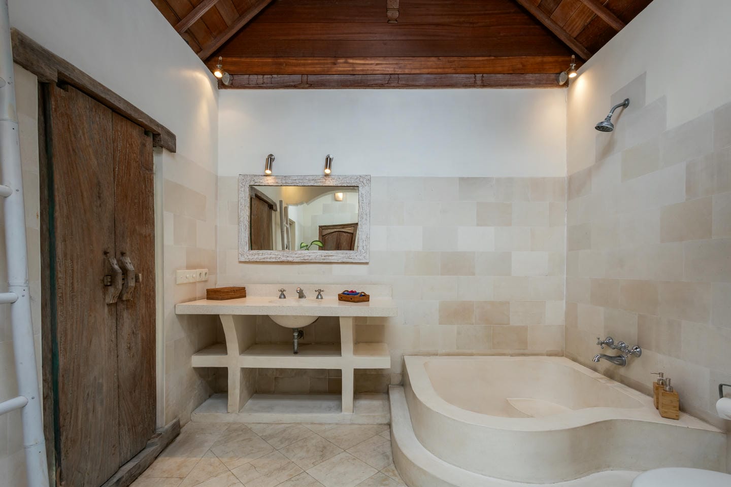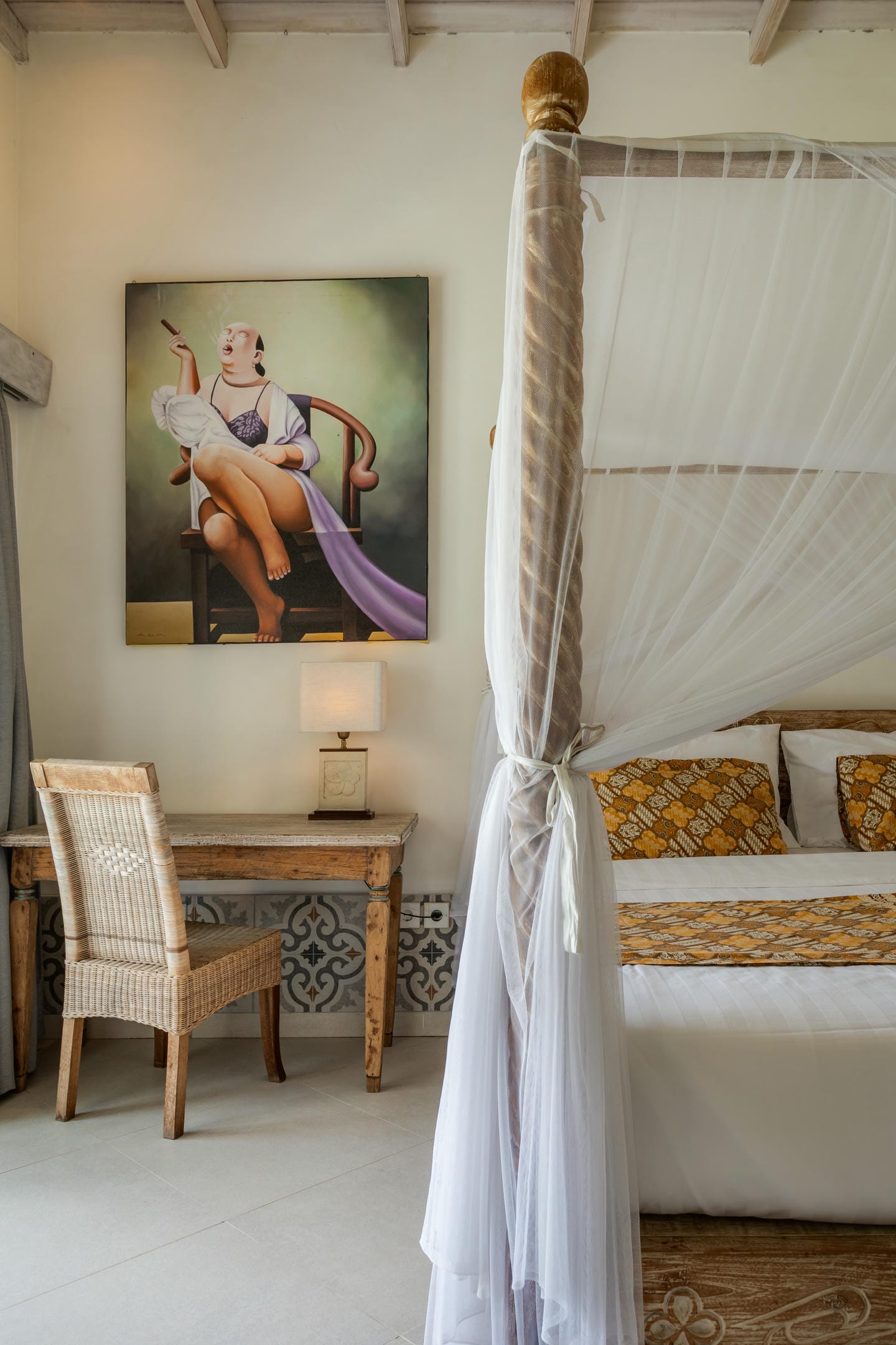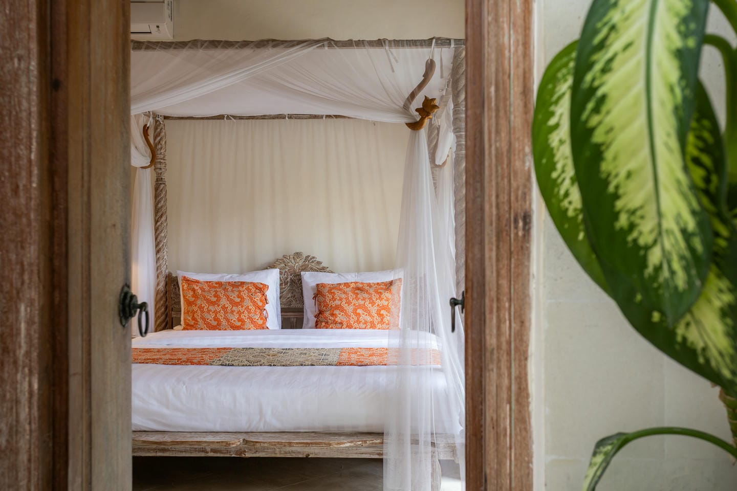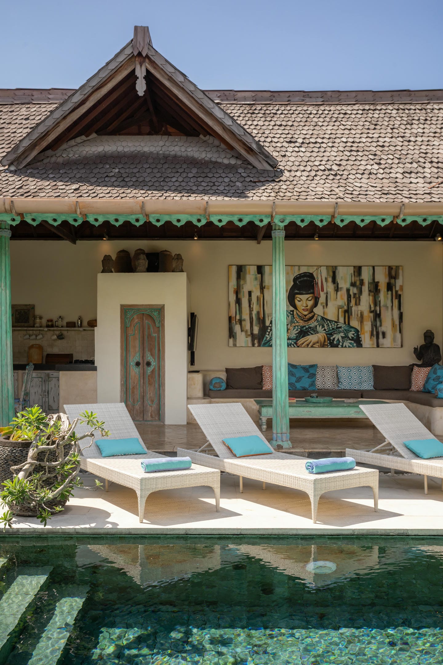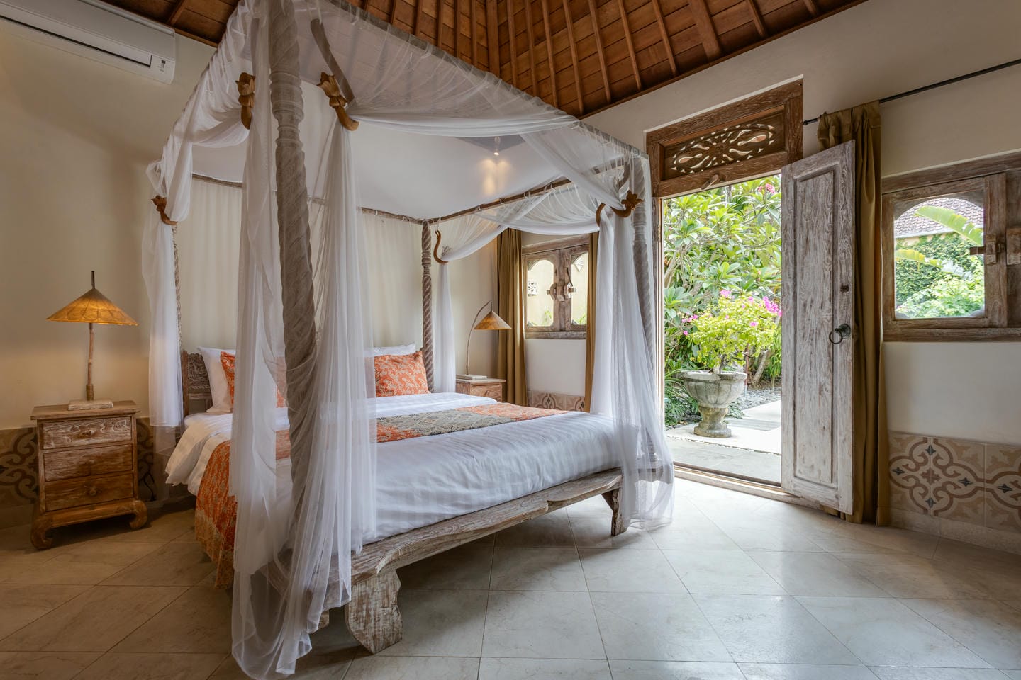 Inside, the villa showcases a warm blend of Balinese tropical charm and vintage boho style. Hand-carved doors, rustic wood furniture, colorful artwork, and open-concept living areas create a cozy, character-filled atmosphere throughout the home.