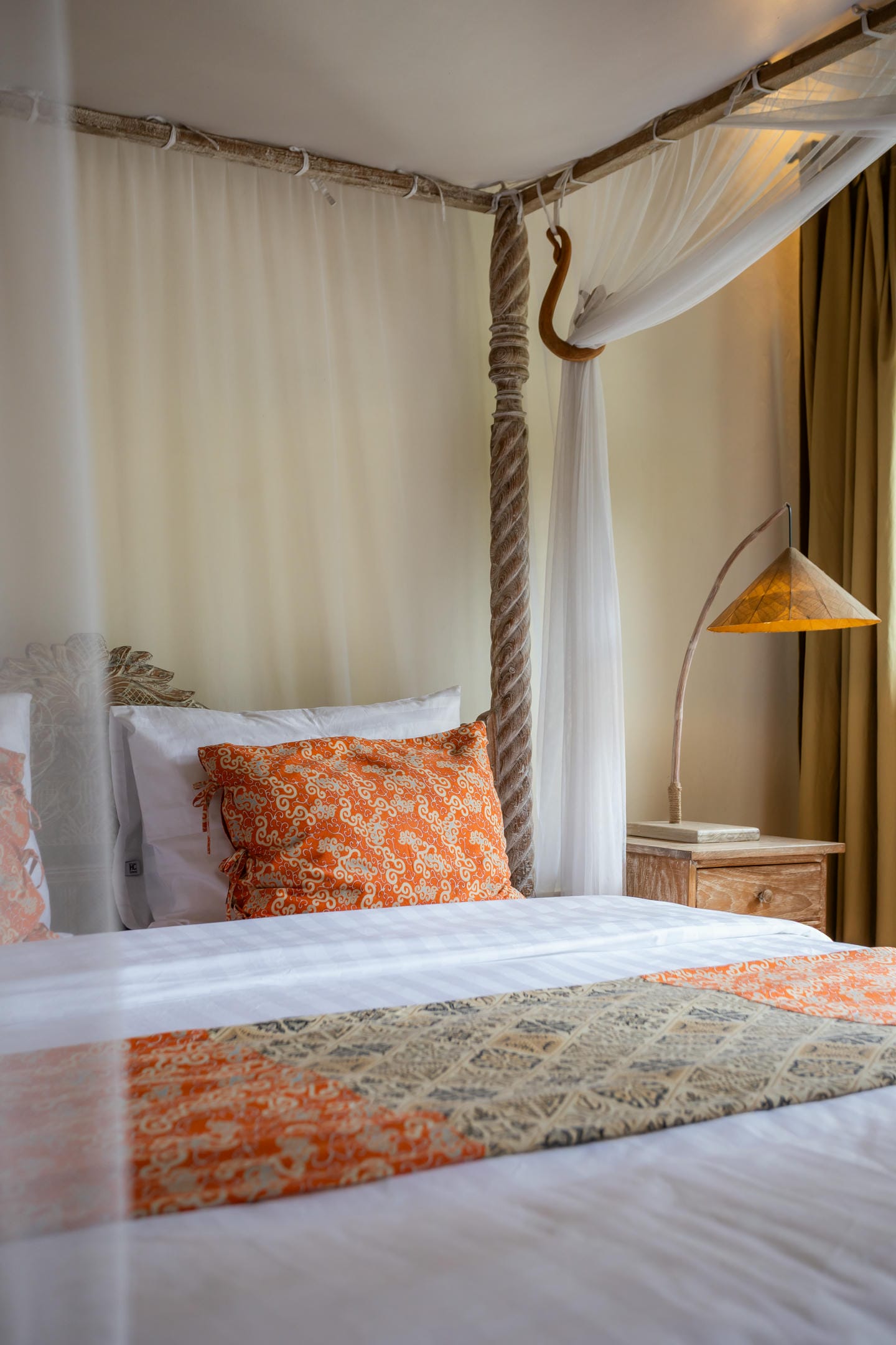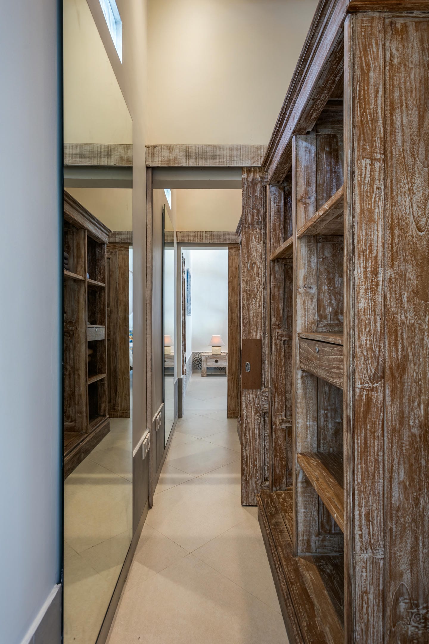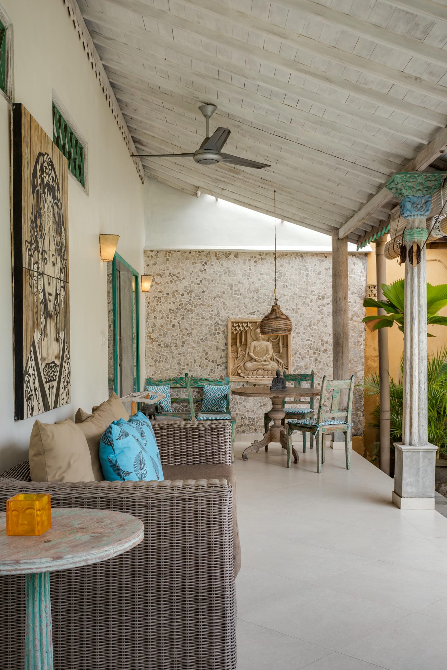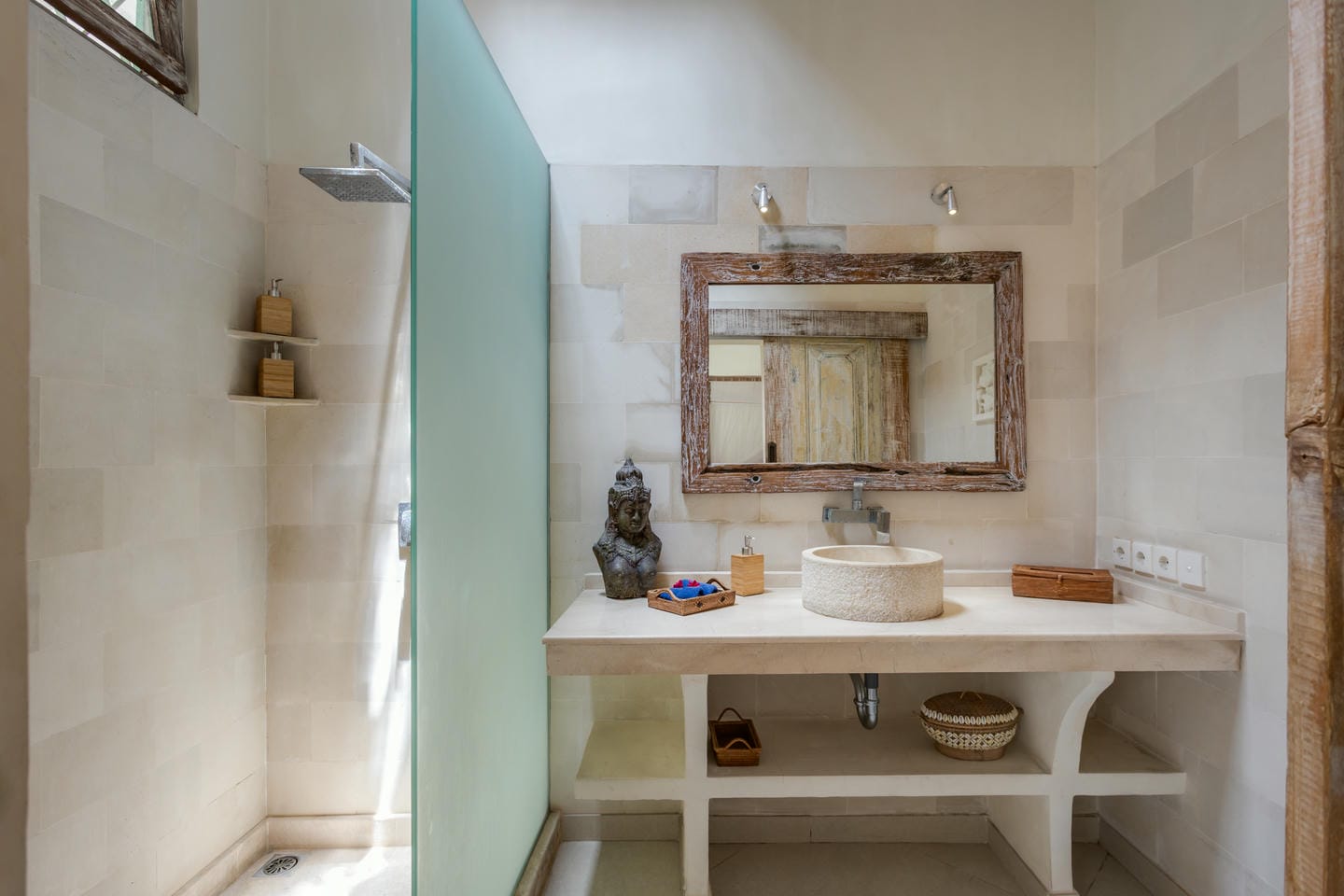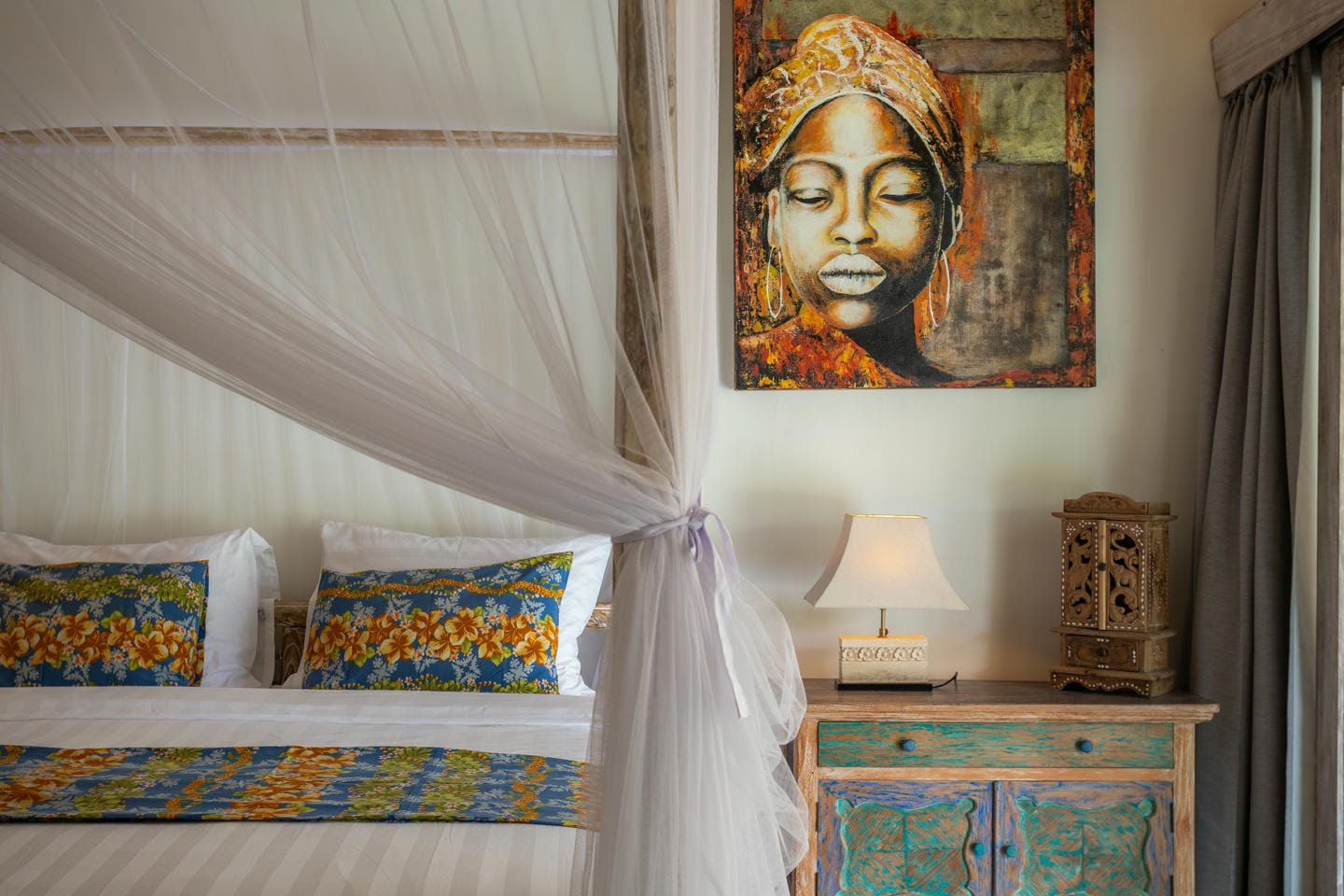 Inside, the villa showcases a warm blend of Balinese tropical charm and vintage boho style. Hand-carved doors, rustic wood furniture, colorful artwork, and open-concept living areas create a cozy, character-filled atmosphere throughout the home.