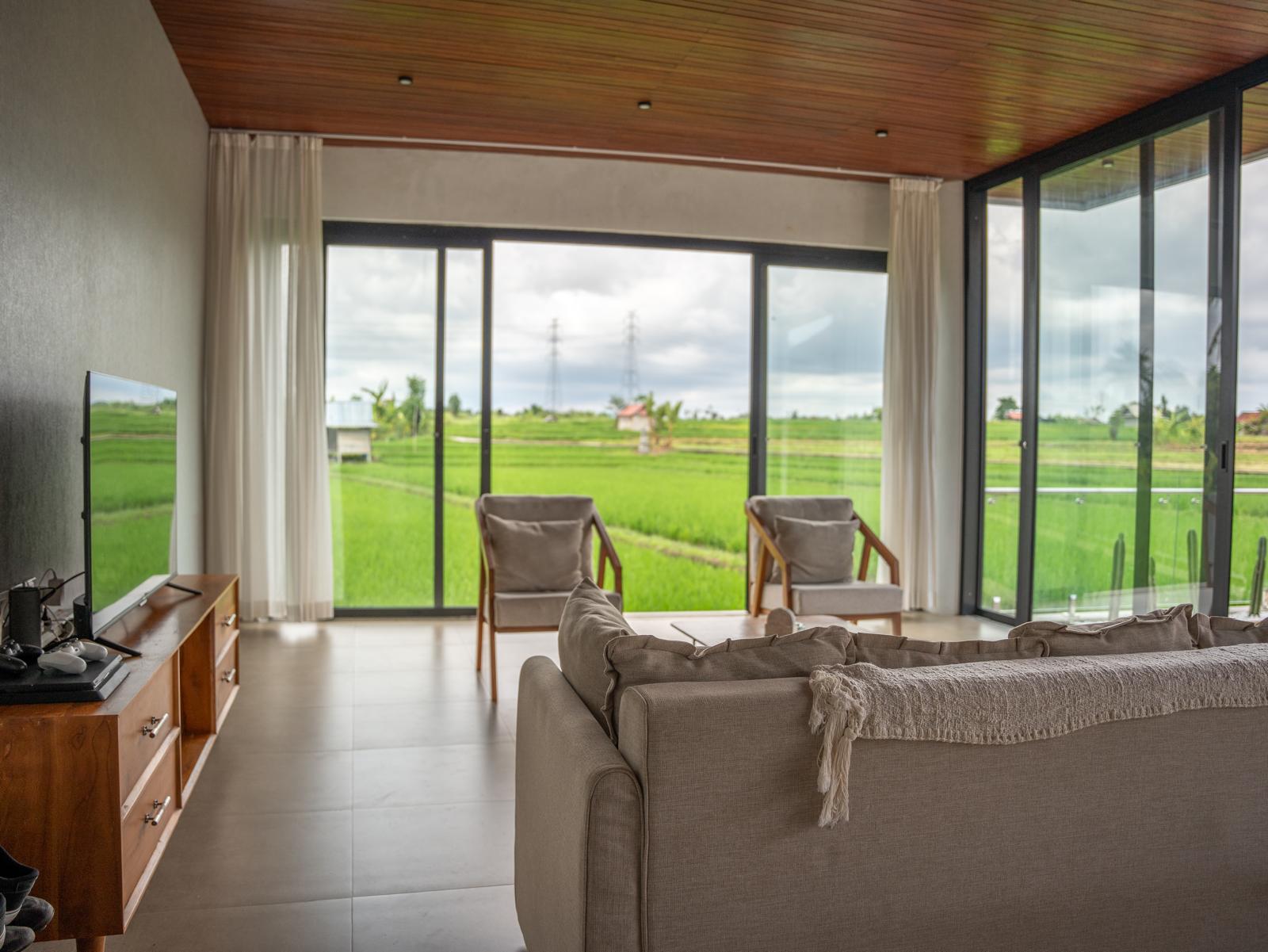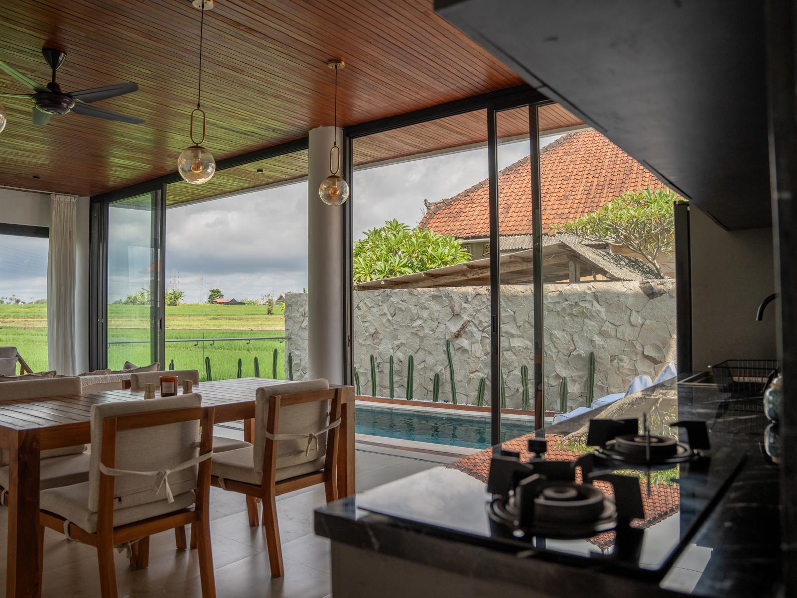 Outdoors, the villa offers stunning rice field views from every corner. The private pool area is complemented by a cozy wooden deck and seating area—ideal for relaxing or enjoying sunsets over the green landscape.