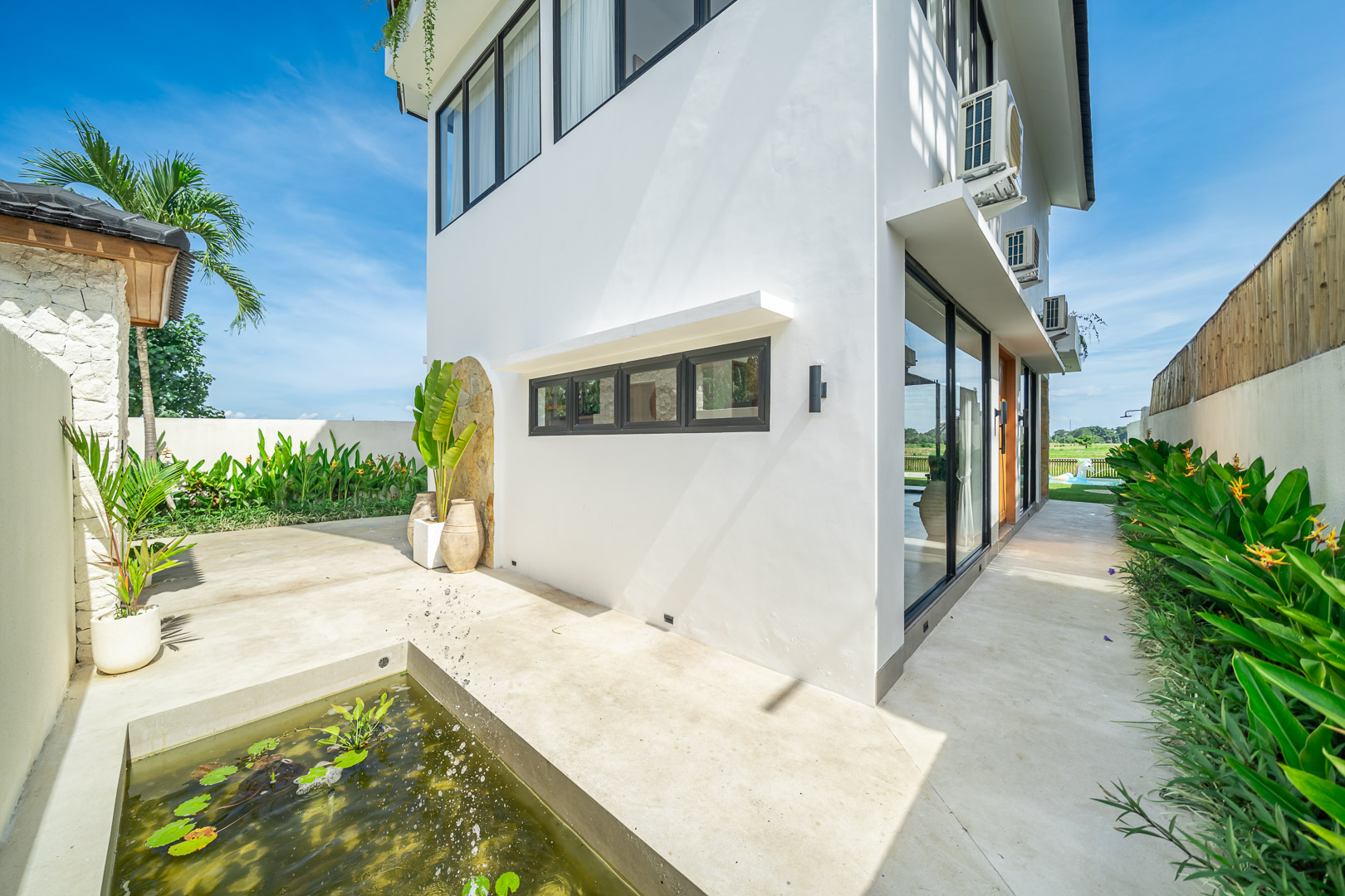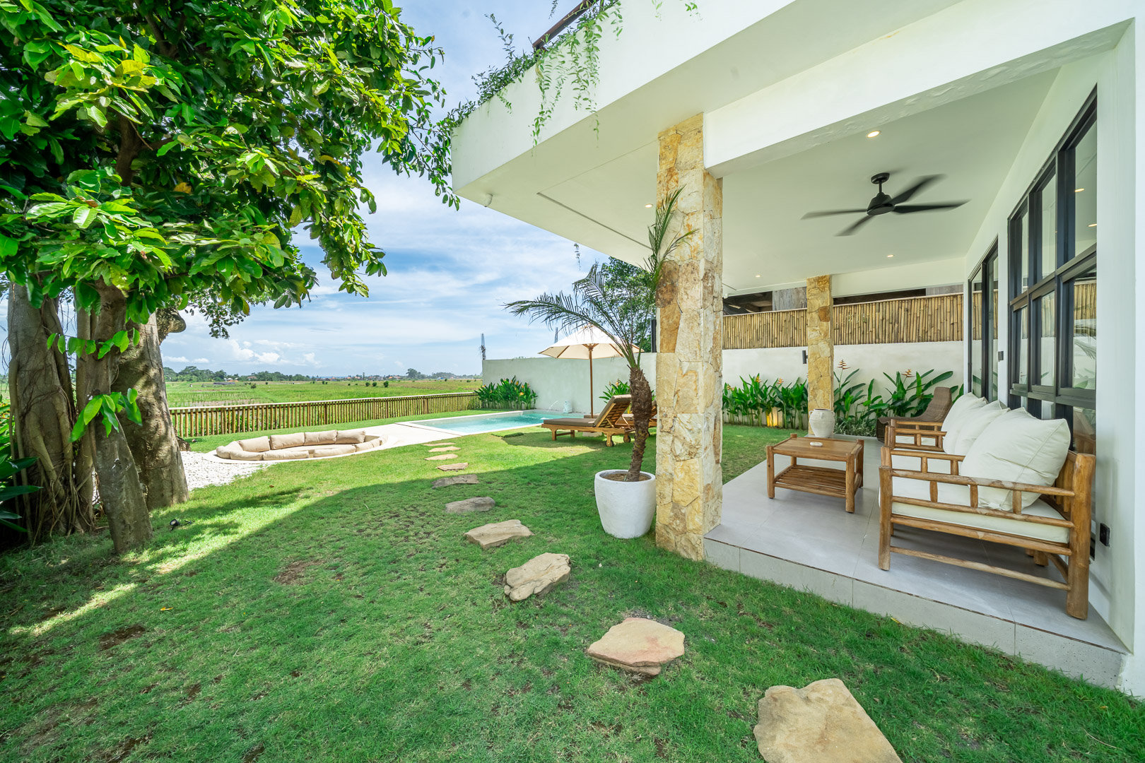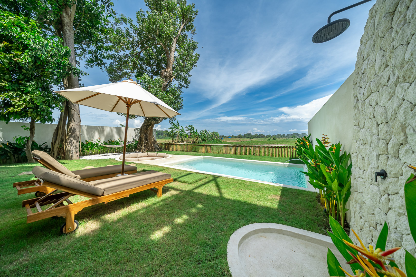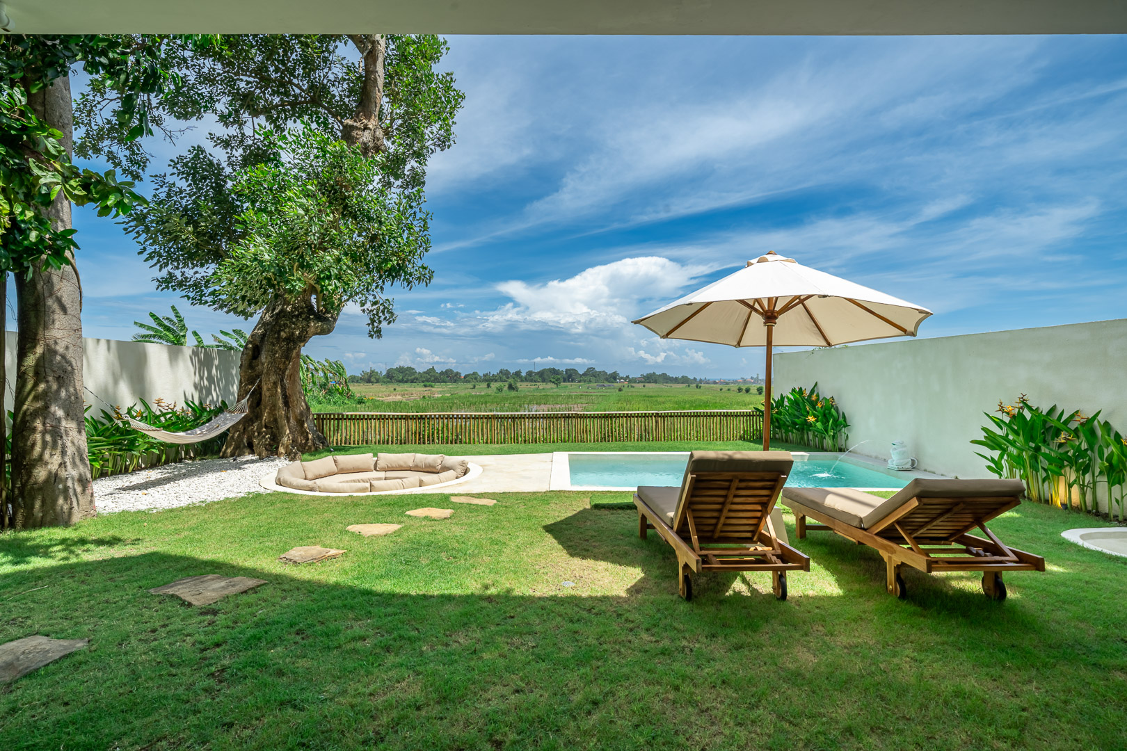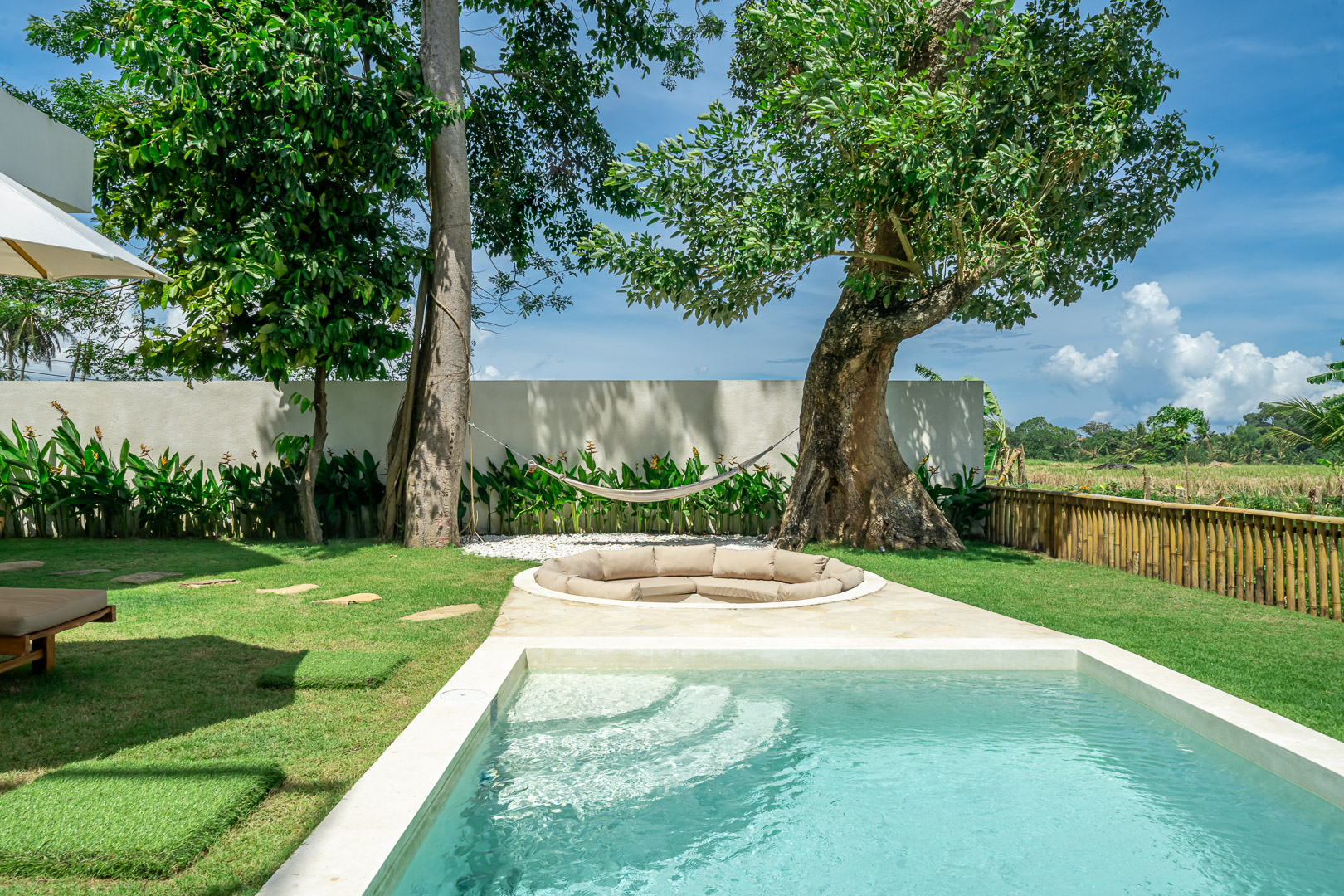 The villa has a spacious outdoor area with a private swimming pool, sun loungers, and a green garden. There is also a cozy seating area and a hammock under a large tree, making it a perfect place to relax and enjoy the peaceful surroundings.