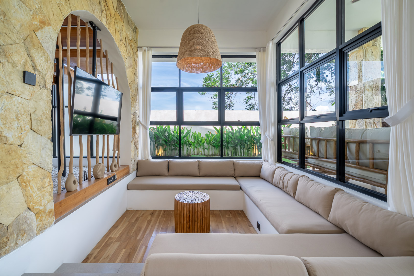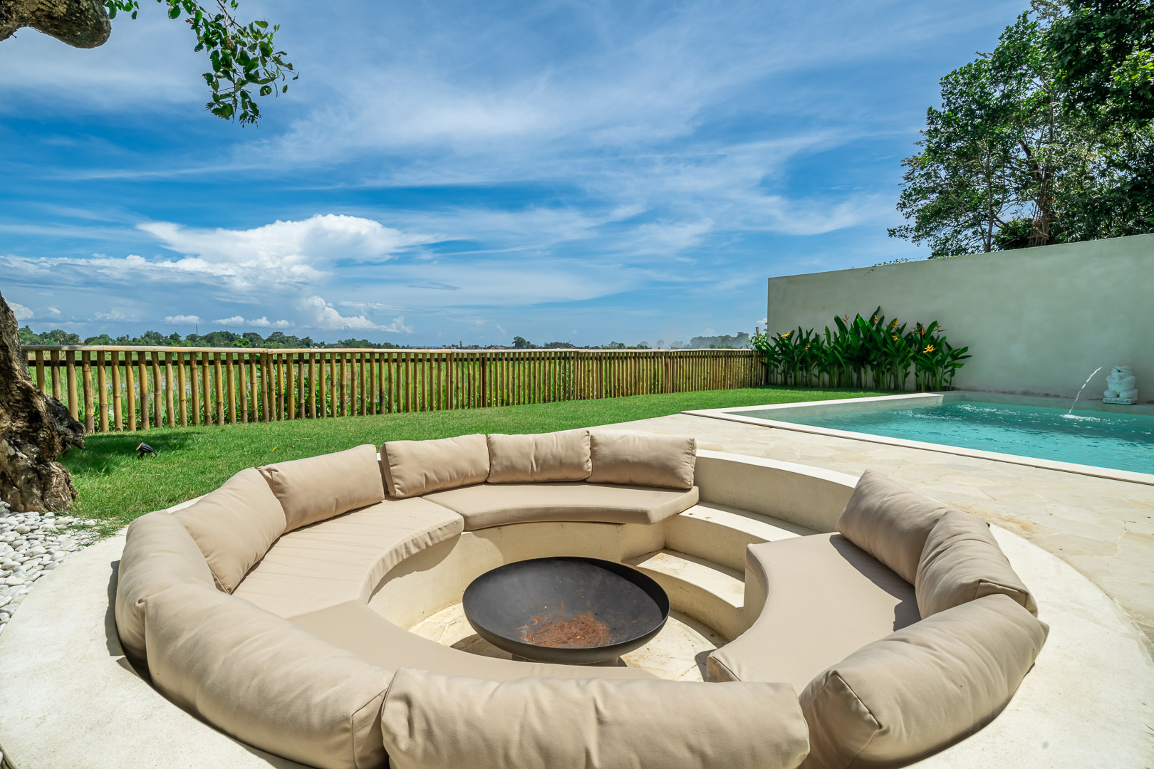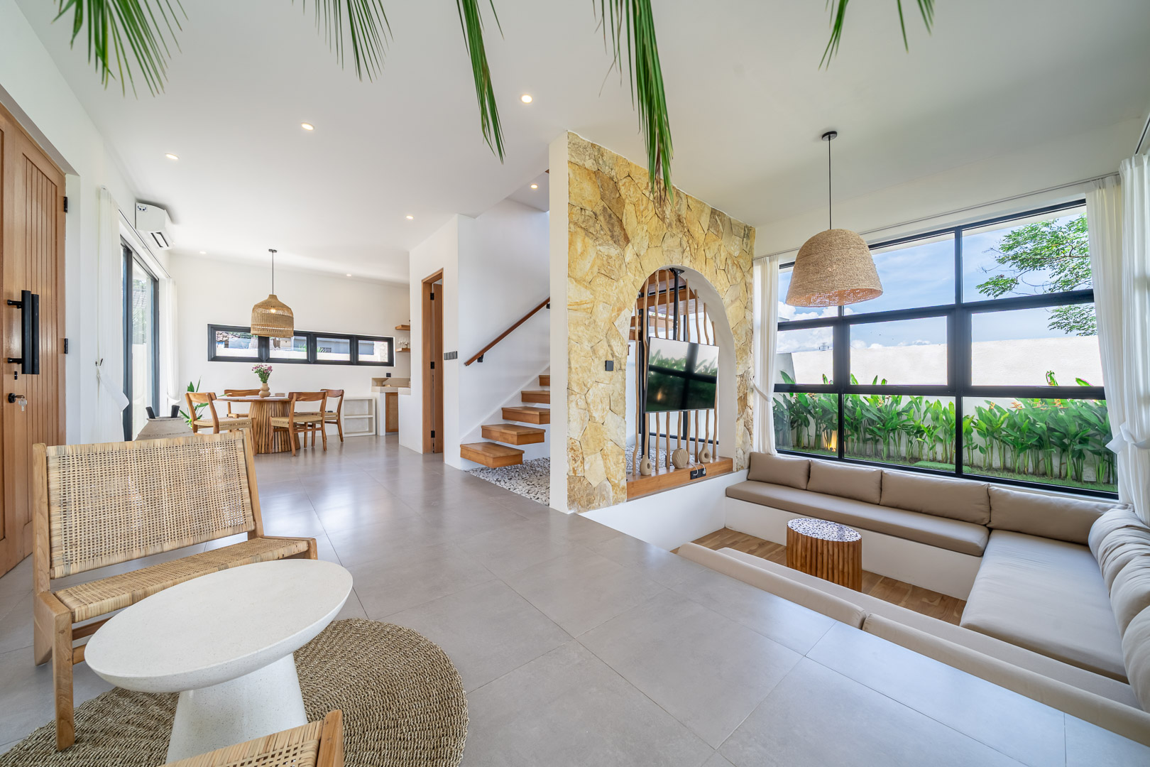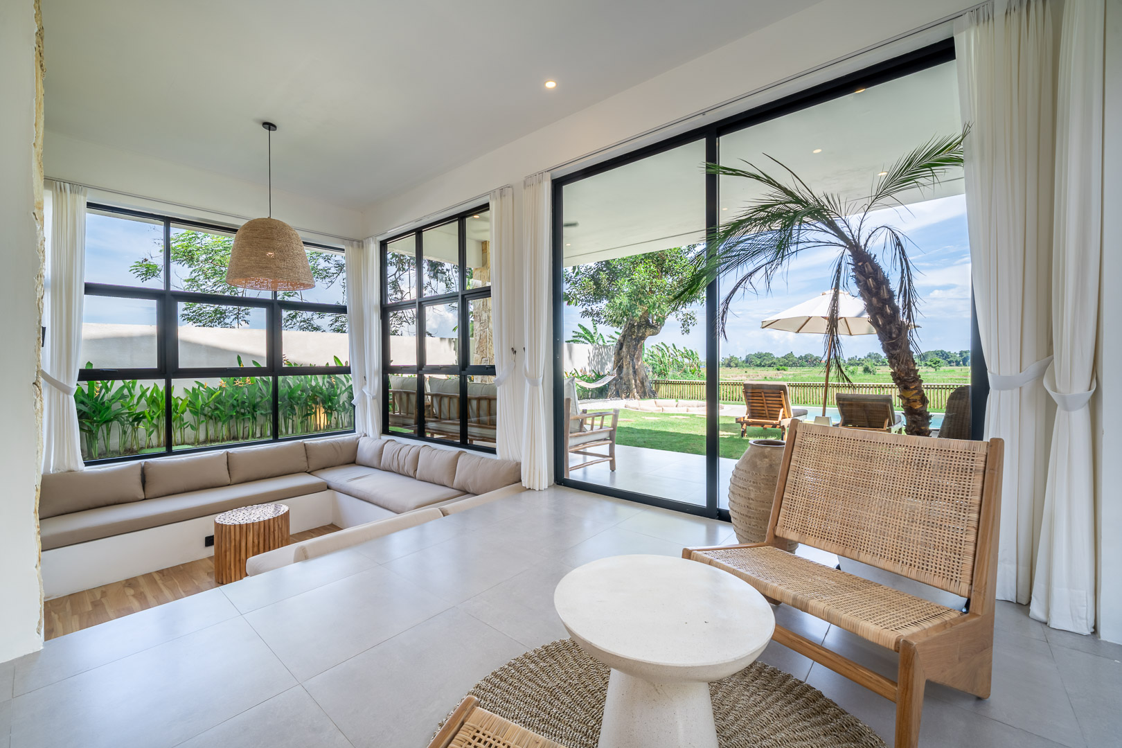 This villa features a modern tropical living concept with a bright and open layout, using natural materials like wood and stone to create a warm and comfortable atmosphere. Large windows and sliding doors bring in plenty of natural light and connect the living area to the greenery and rice field views outside. The sunken seating area provides a cozy space to relax and enjoy the surroundings. The villa has 3 bedrooms and 3 bathrooms, and the master bedroom features a private balcony with a rice field view.