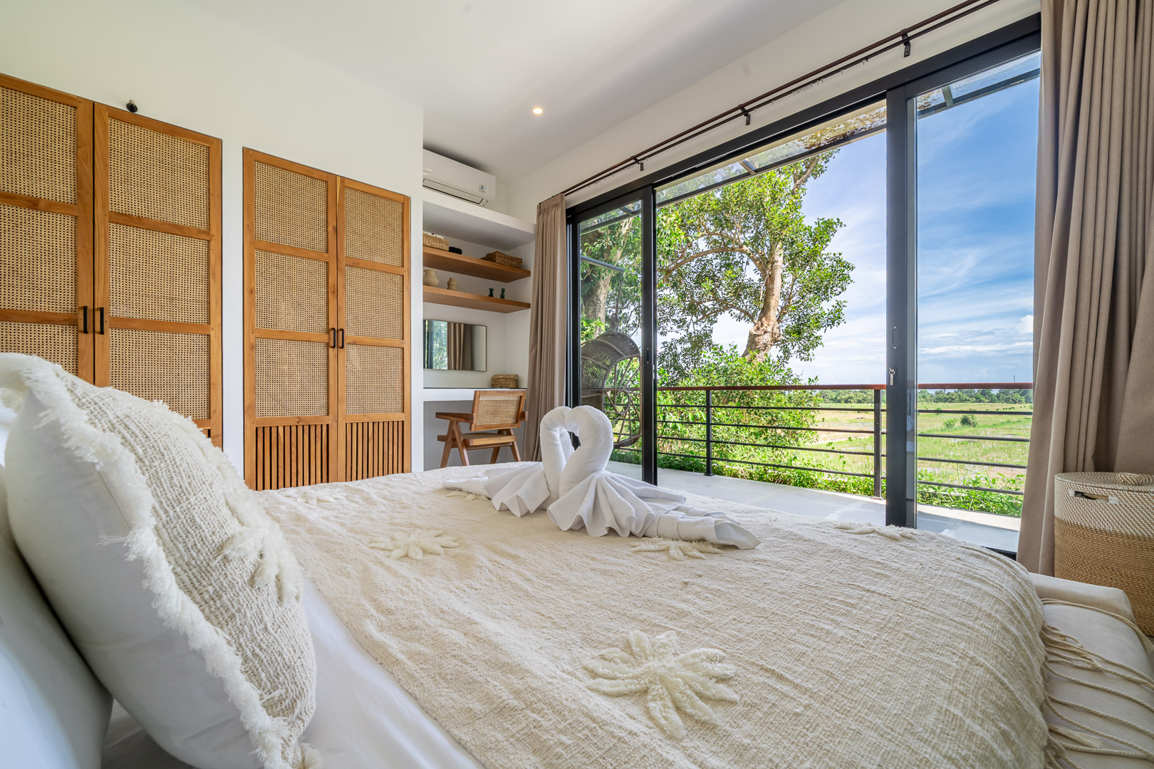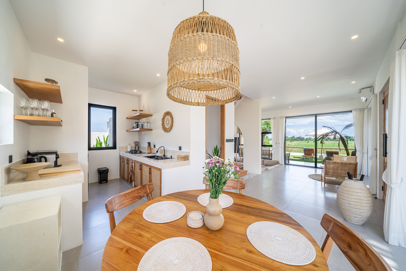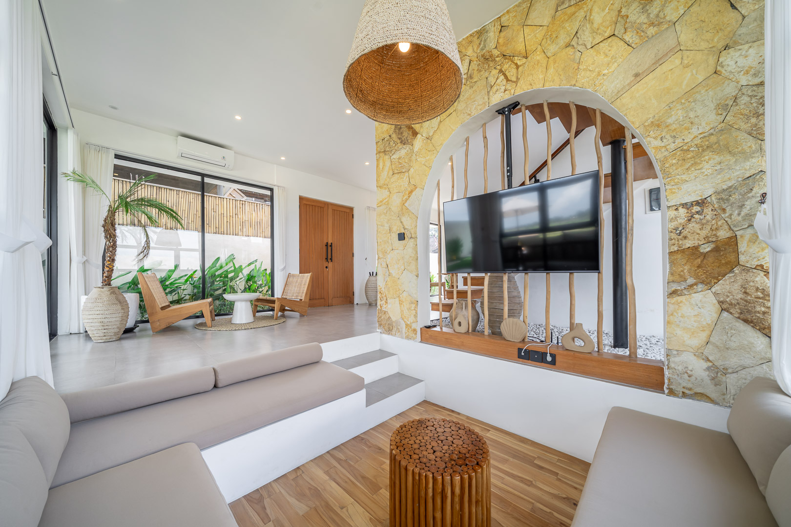 This villa features a modern tropical living concept with a bright and open layout, using natural materials like wood and stone to create a warm and comfortable atmosphere. Large windows and sliding doors bring in plenty of natural light and connect the living area to the greenery and rice field views outside. The sunken seating area provides a cozy space to relax and enjoy the surroundings. The villa has 3 bedrooms and 3 bathrooms, and the master bedroom features a private balcony with a rice field view.