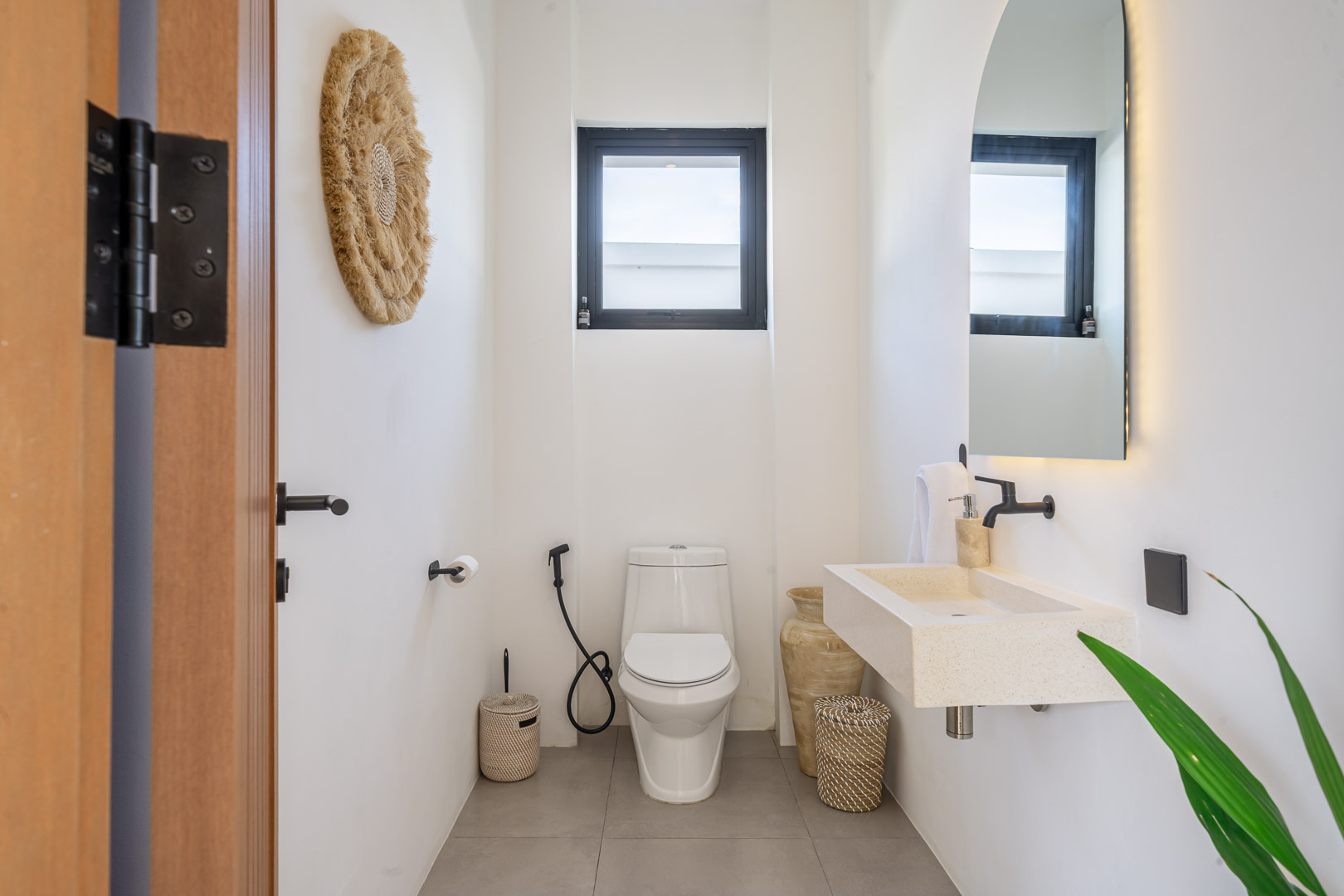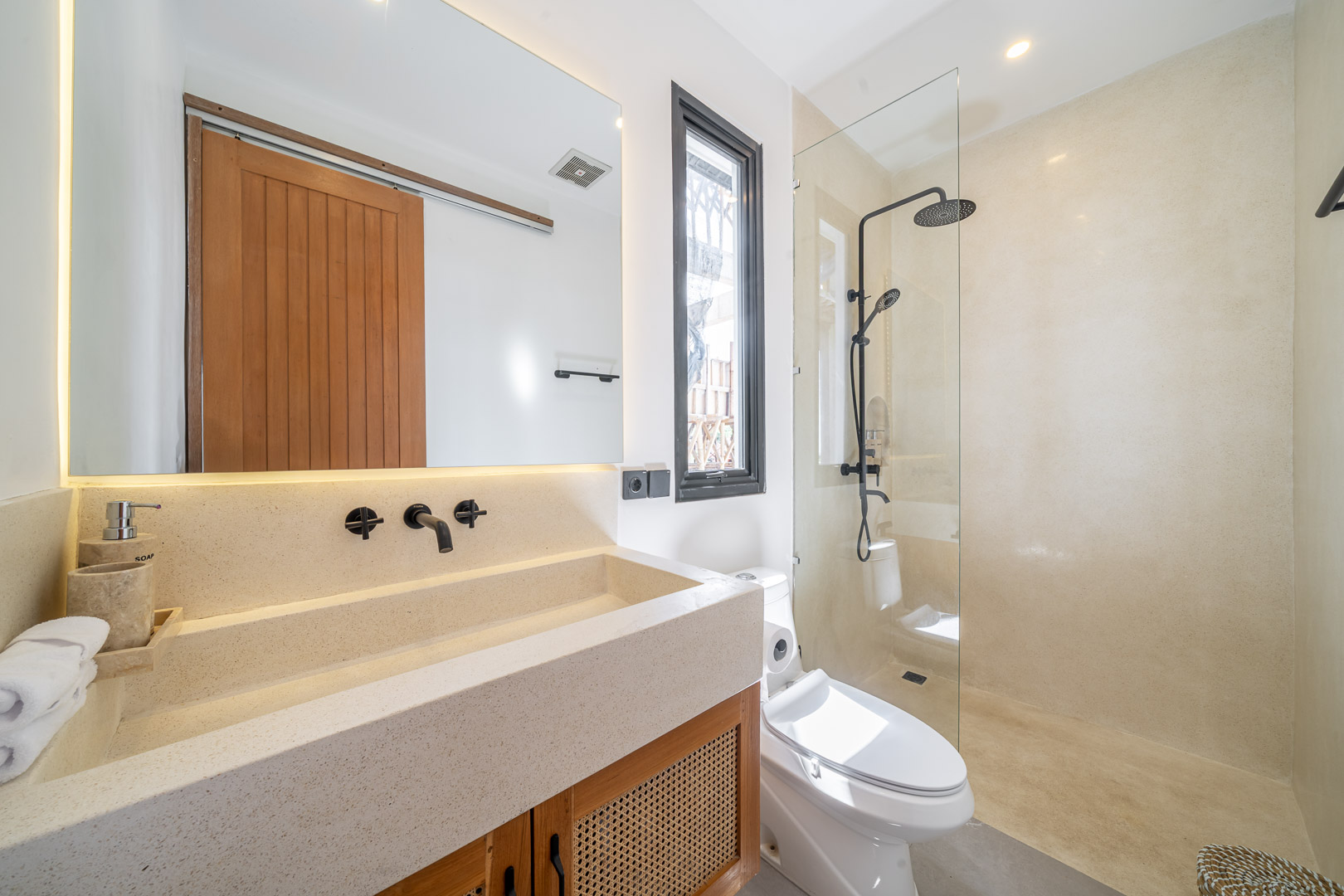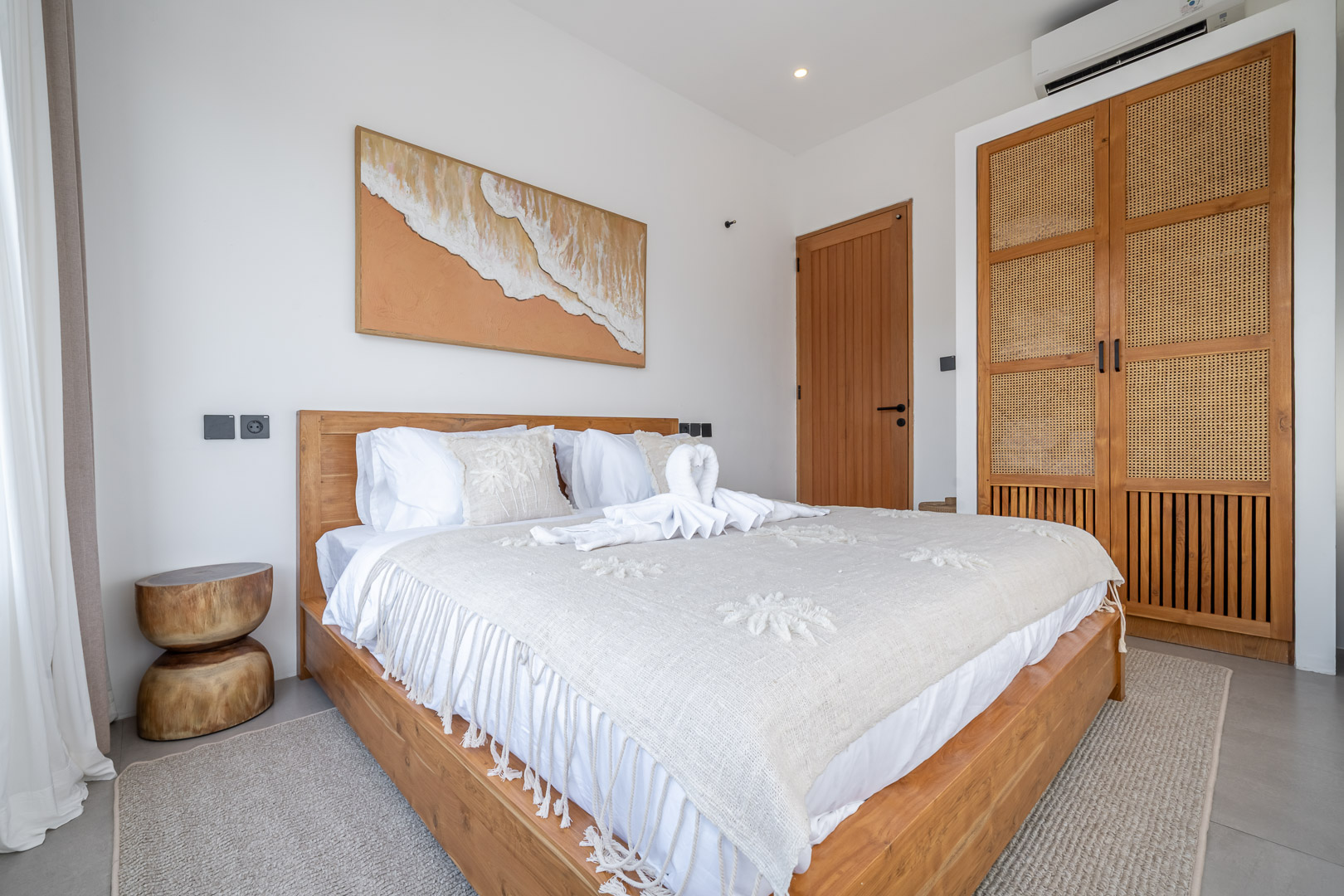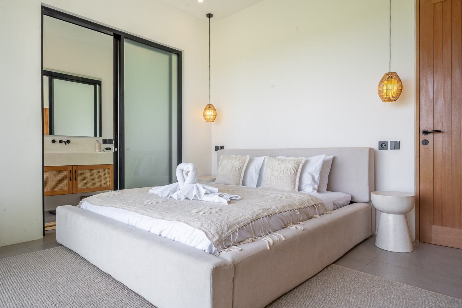 This villa features a modern tropical living concept with a bright and open layout, using natural materials like wood and stone to create a warm and comfortable atmosphere. Large windows and sliding doors bring in plenty of natural light and connect the living area to the greenery and rice field views outside. The sunken seating area provides a cozy space to relax and enjoy the surroundings. The villa has 3 bedrooms and 3 bathrooms, and the master bedroom features a private balcony with a rice field view.