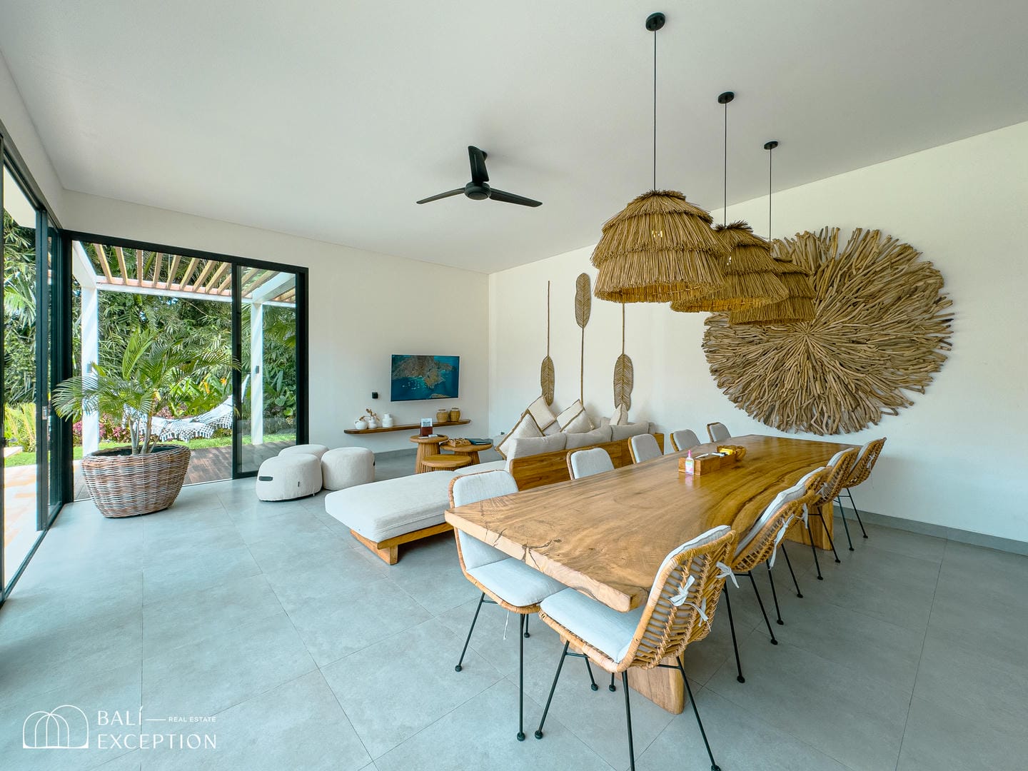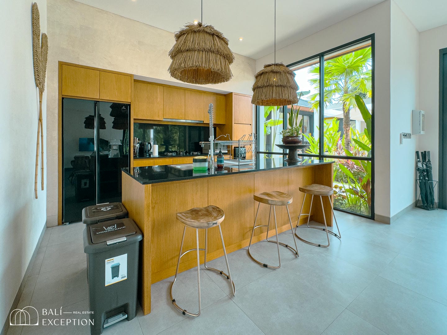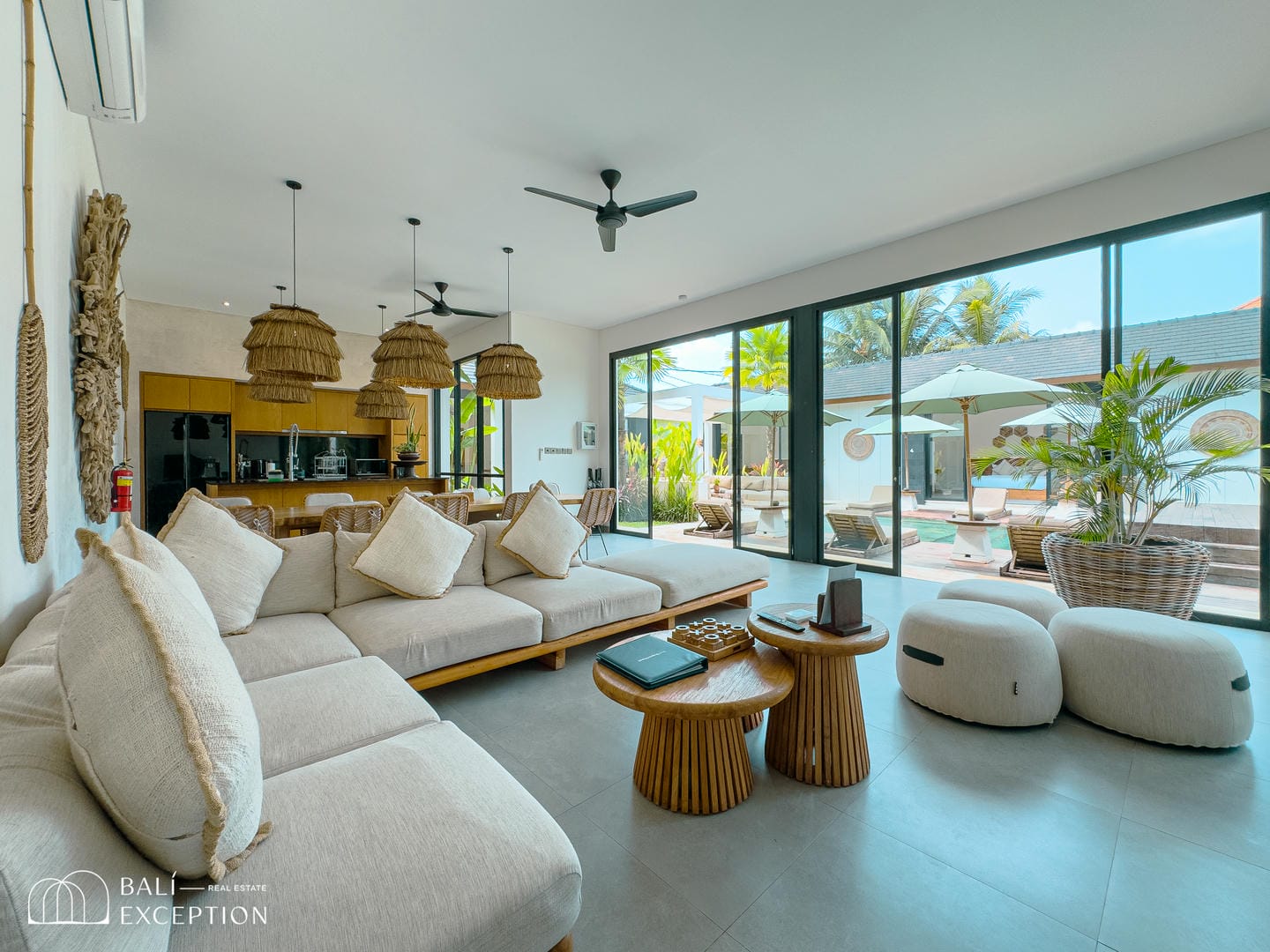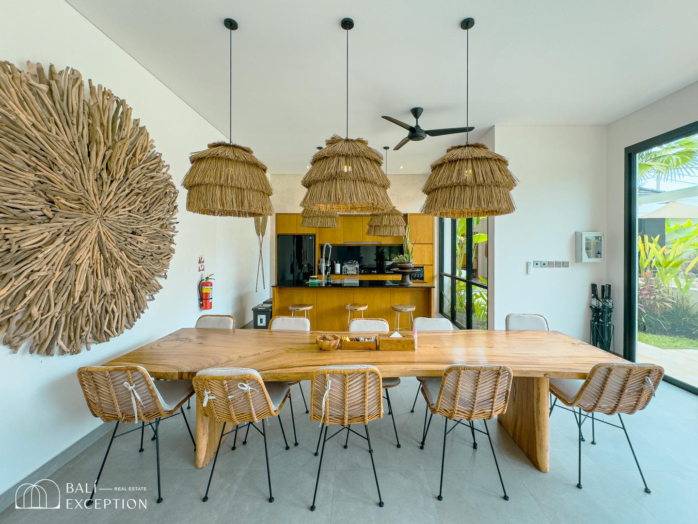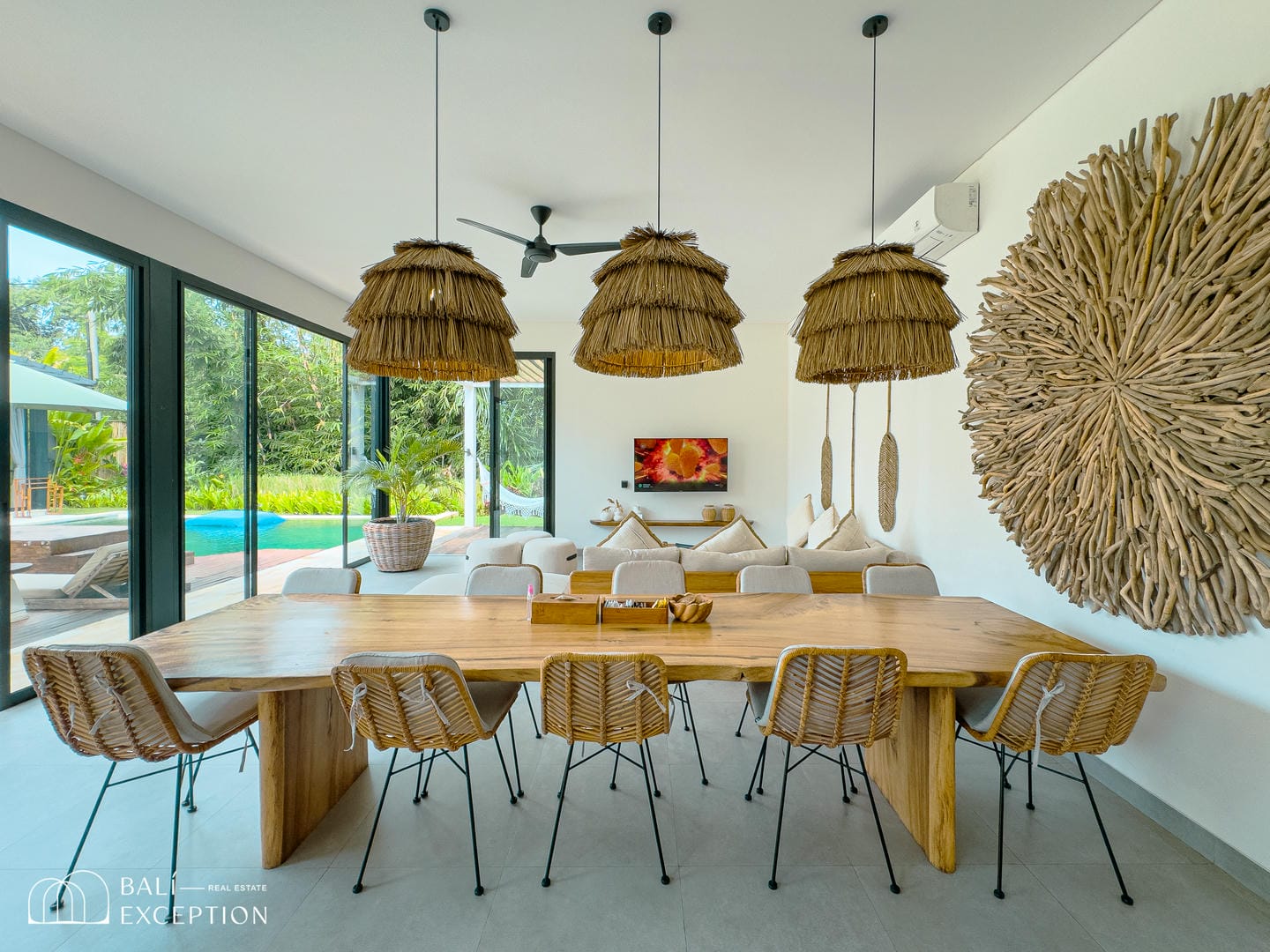The interior of the villa is designed in a modern tropical concept, combining warm natural materials with clean architectural lines. The property includes five bedrooms, all with ensuite bathrooms, ensuring comfort and privacy throughout. Fully furnished, the main living space is bright and airy, with the lounge and dining area flowing naturally into a fully equipped kitchen.
