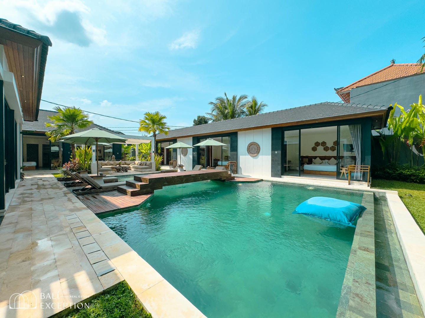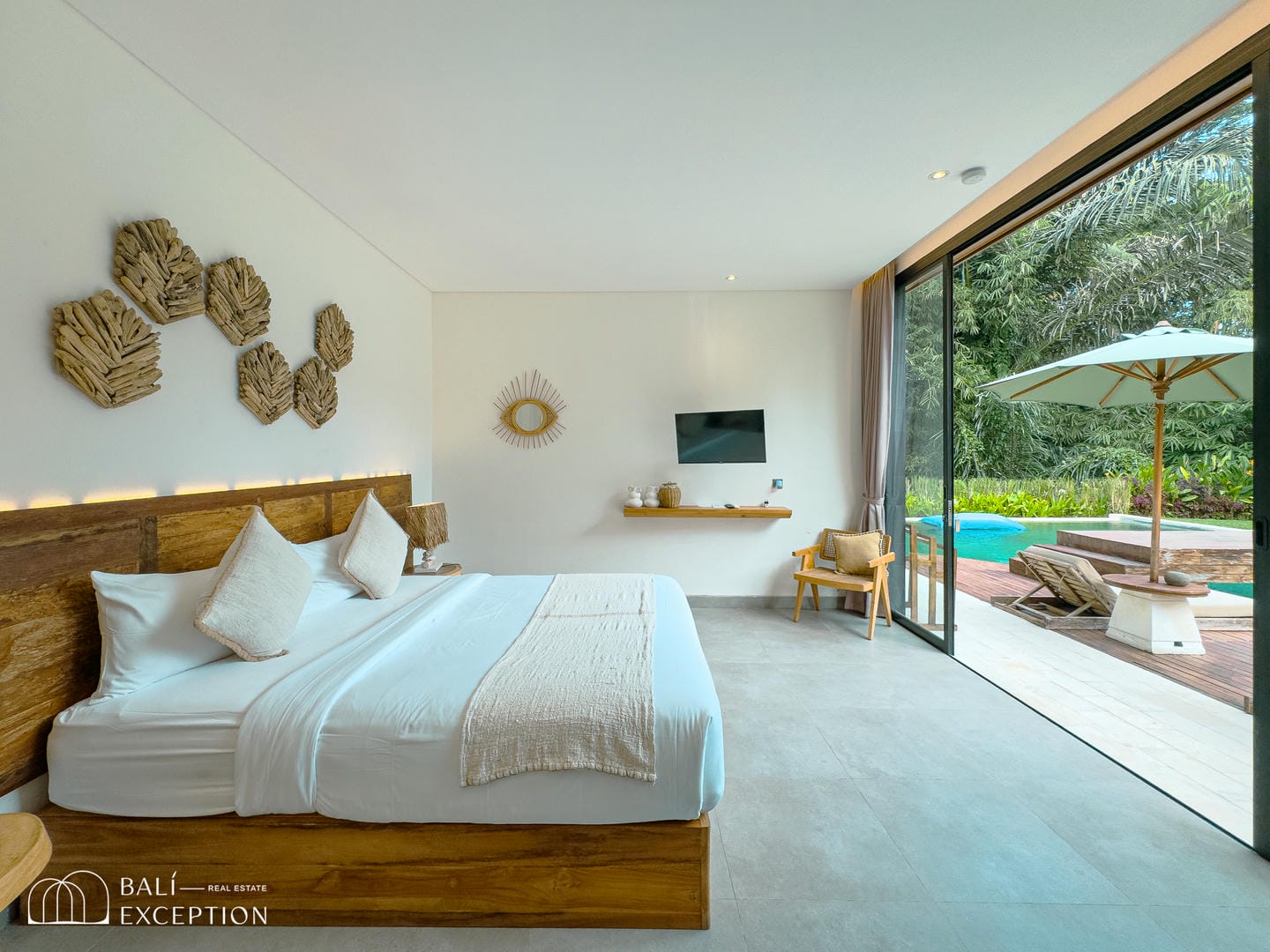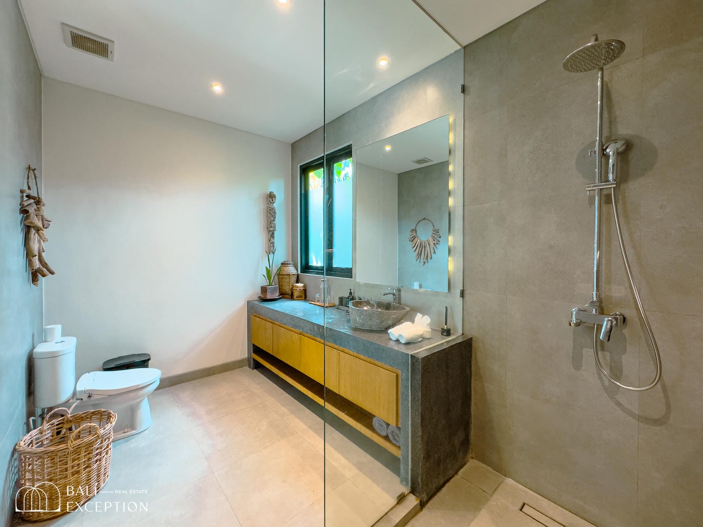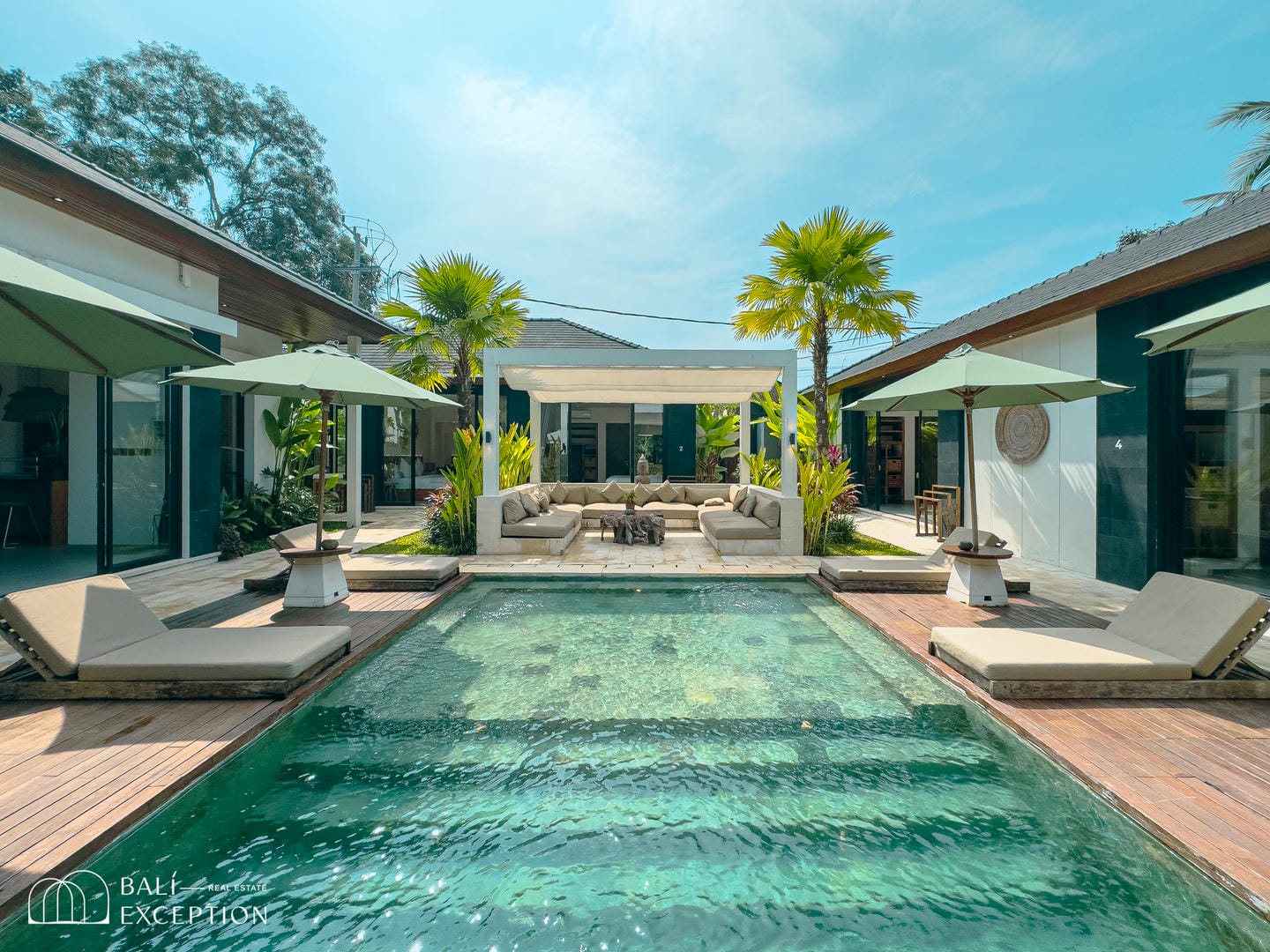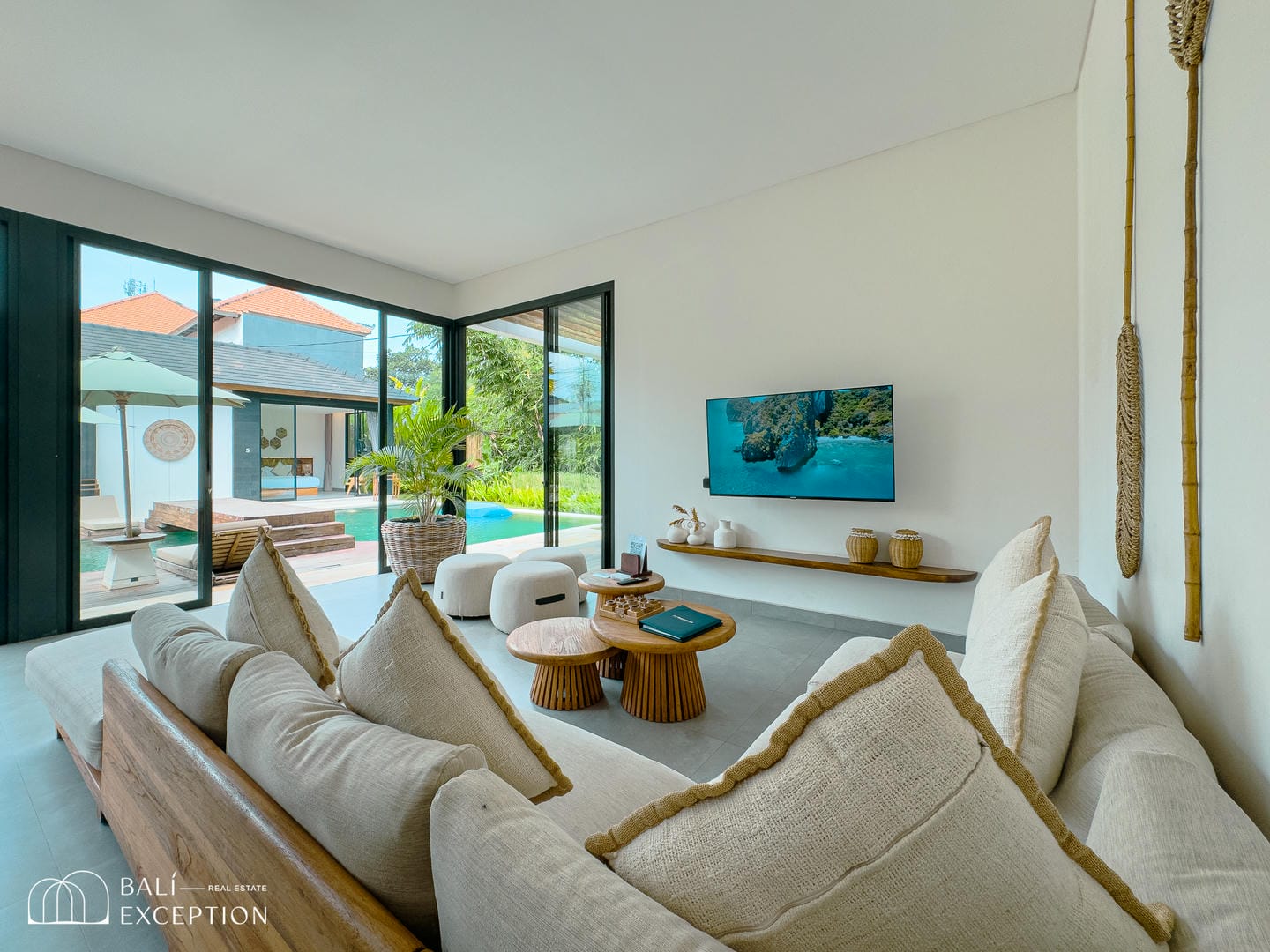 The interior of the villa is designed in a modern tropical concept, combining warm natural materials with clean architectural lines. The property includes five bedrooms, all with ensuite bathrooms, ensuring comfort and privacy throughout. Fully furnished, the main living space is bright and airy, with the lounge and dining area flowing naturally into a fully equipped kitchen.