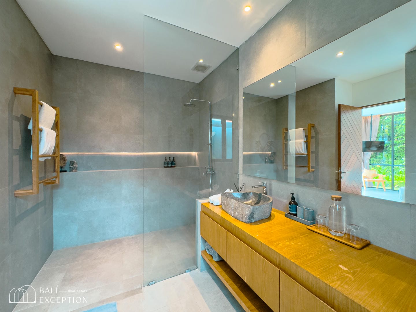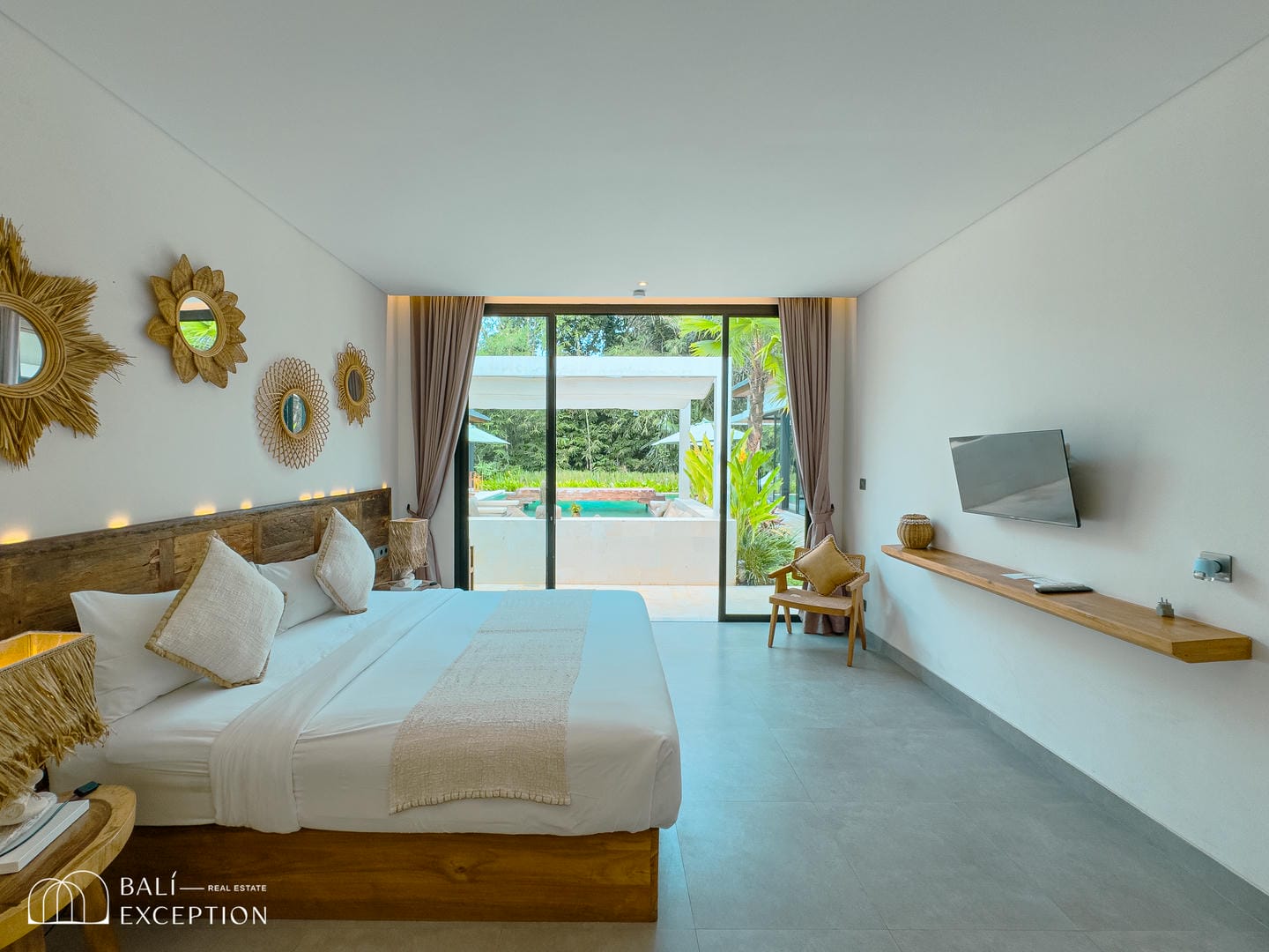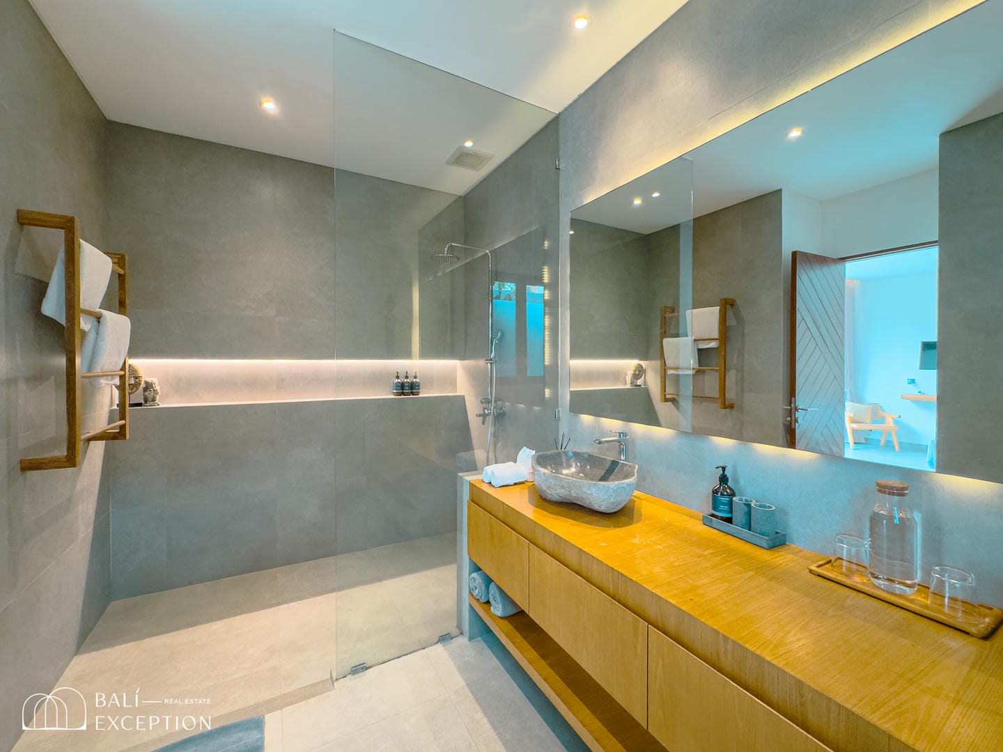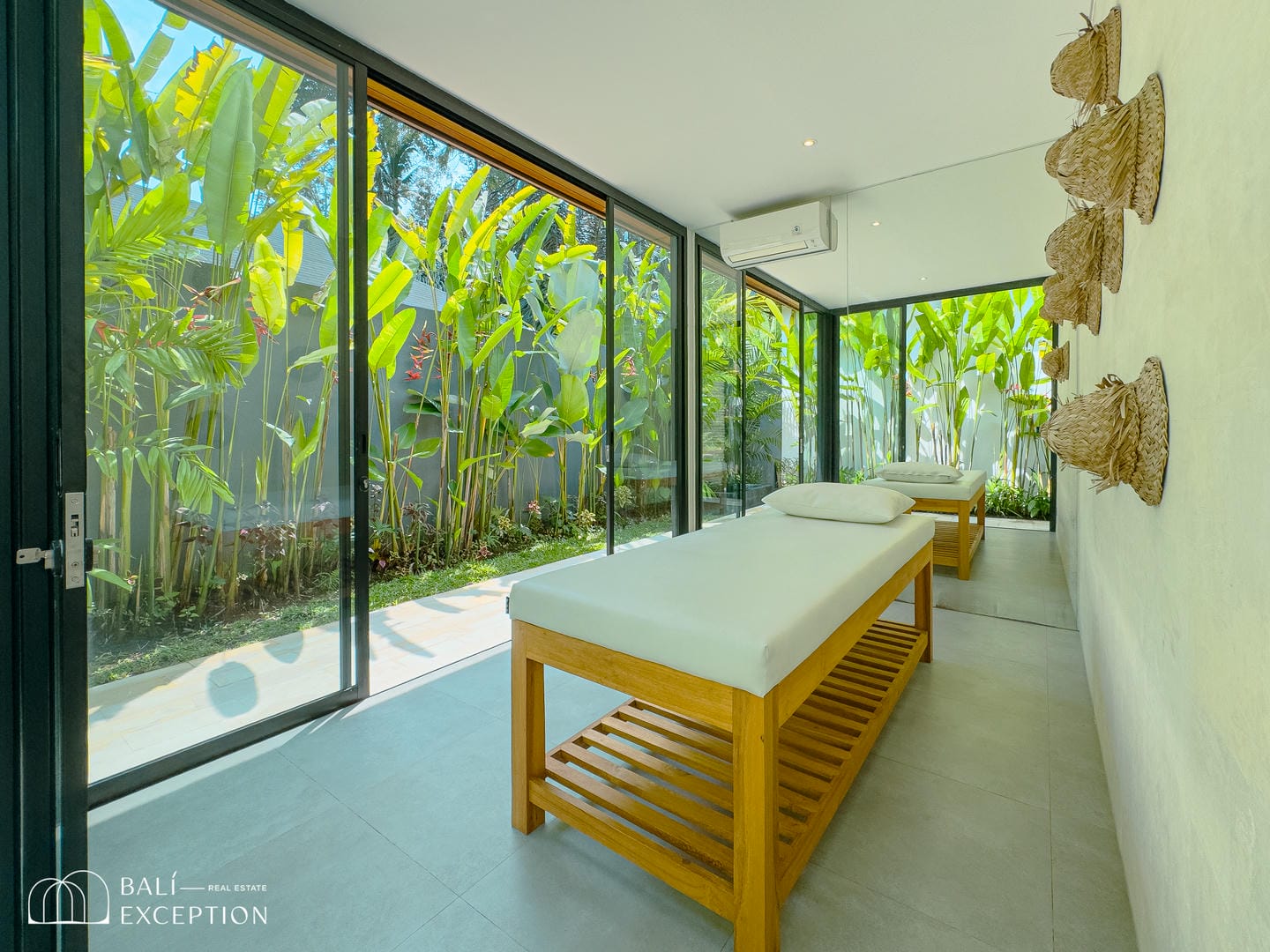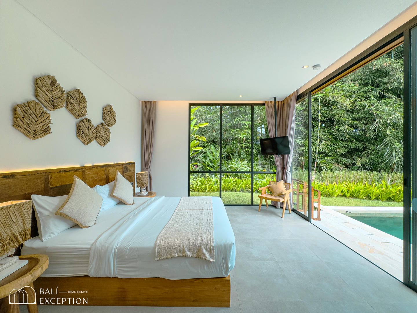 The interior of the villa is designed in a modern tropical concept, combining warm natural materials with clean architectural lines. The property includes five bedrooms, all with ensuite bathrooms, ensuring comfort and privacy throughout. Fully furnished, the main living space is bright and airy, with the lounge and dining area flowing naturally into a fully equipped kitchen.