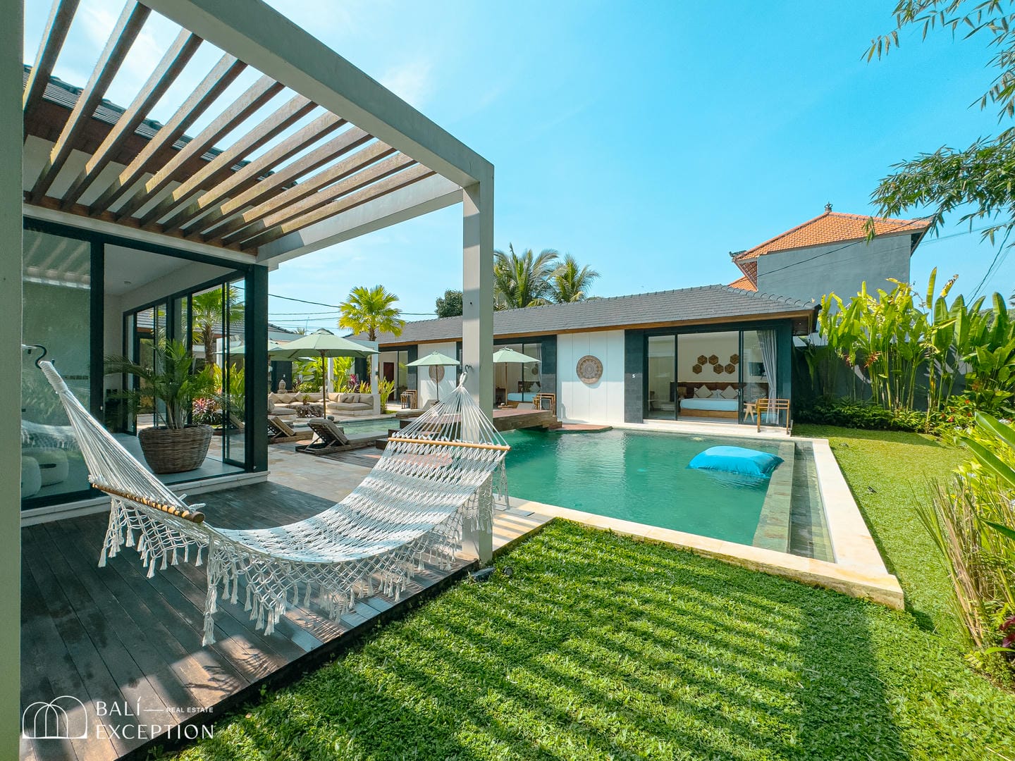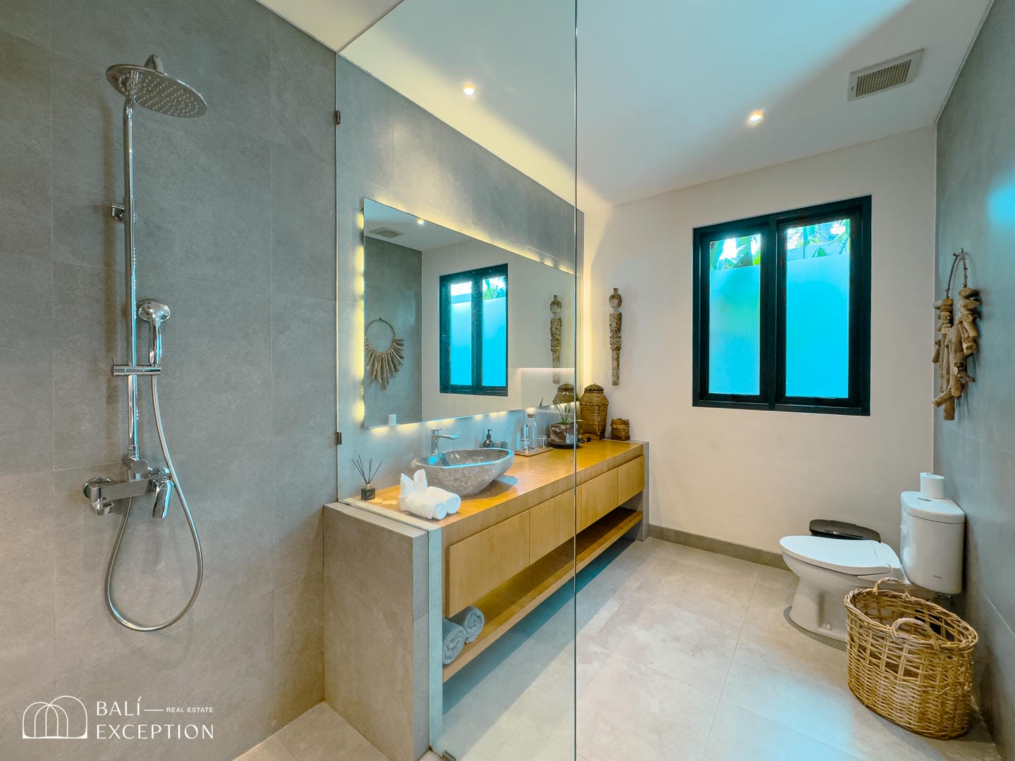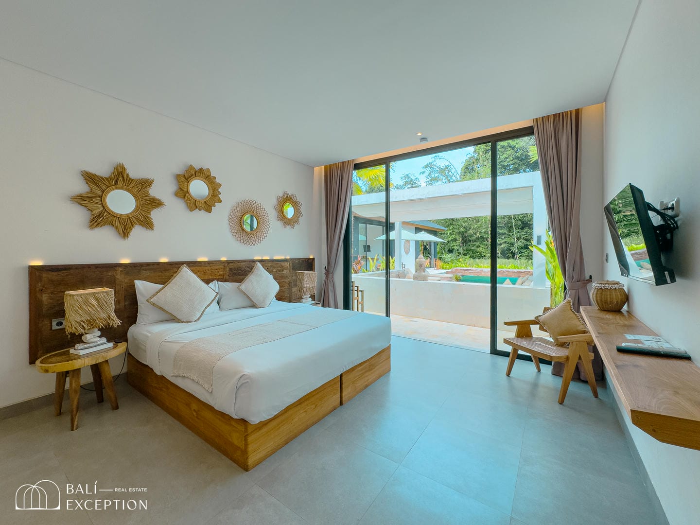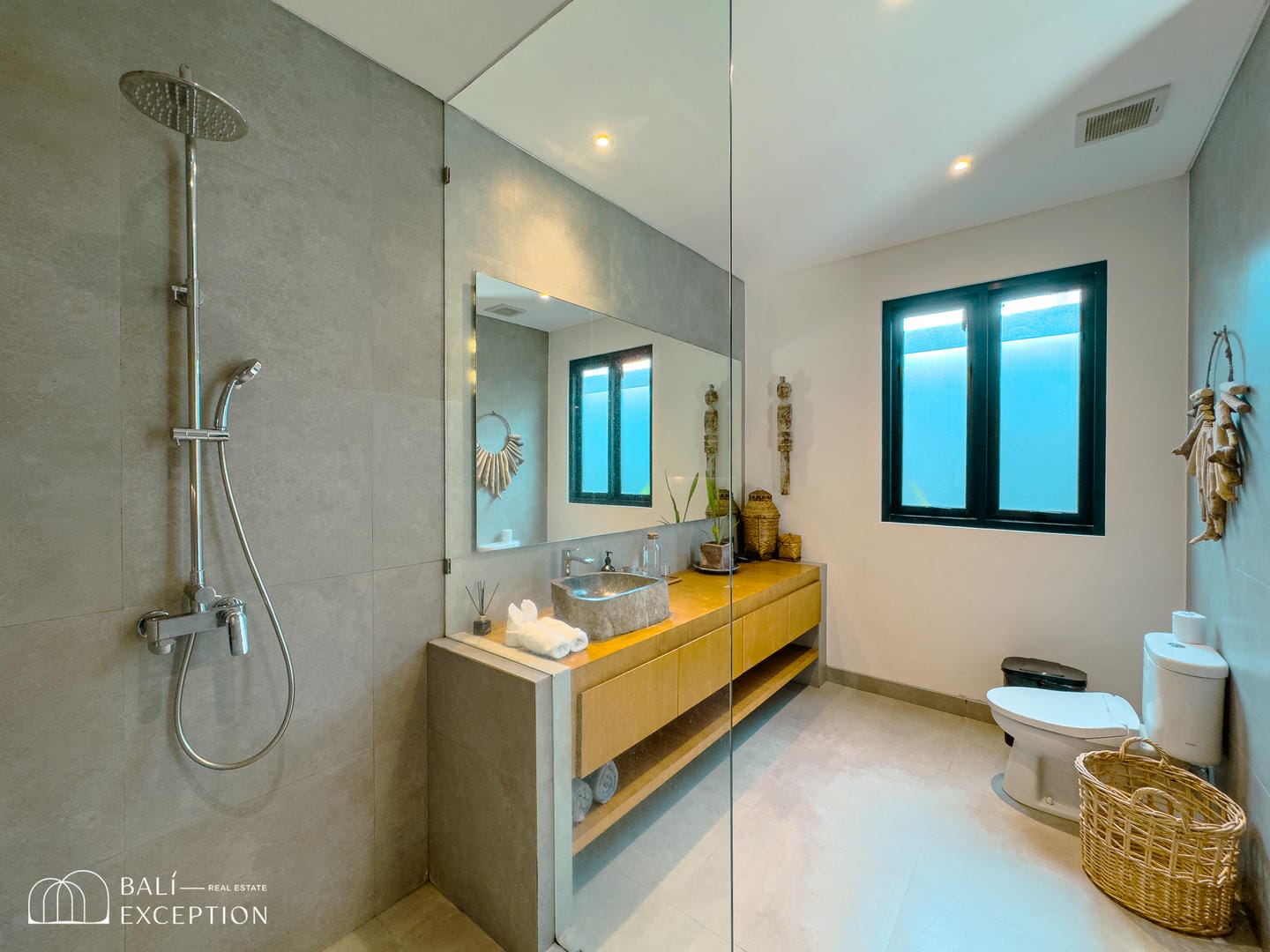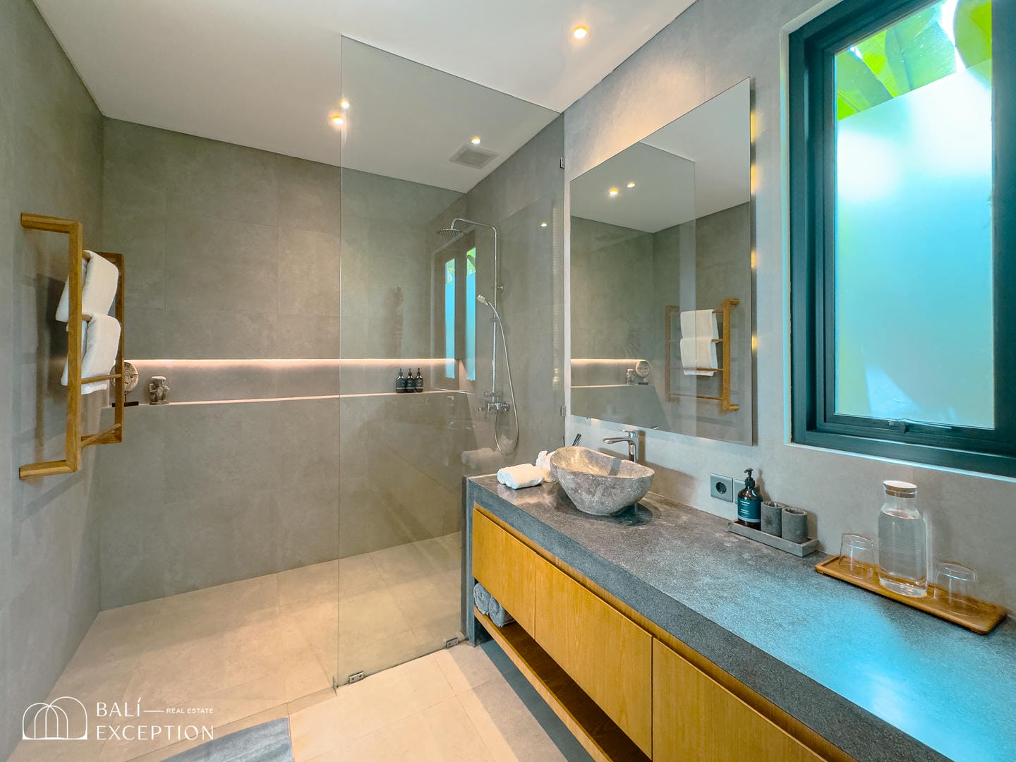 The interior of the villa is designed in a modern tropical concept, combining warm natural materials with clean architectural lines. The property includes five bedrooms, all with ensuite bathrooms, ensuring comfort and privacy throughout. Fully furnished, the main living space is bright and airy, with the lounge and dining area flowing naturally into a fully equipped kitchen.