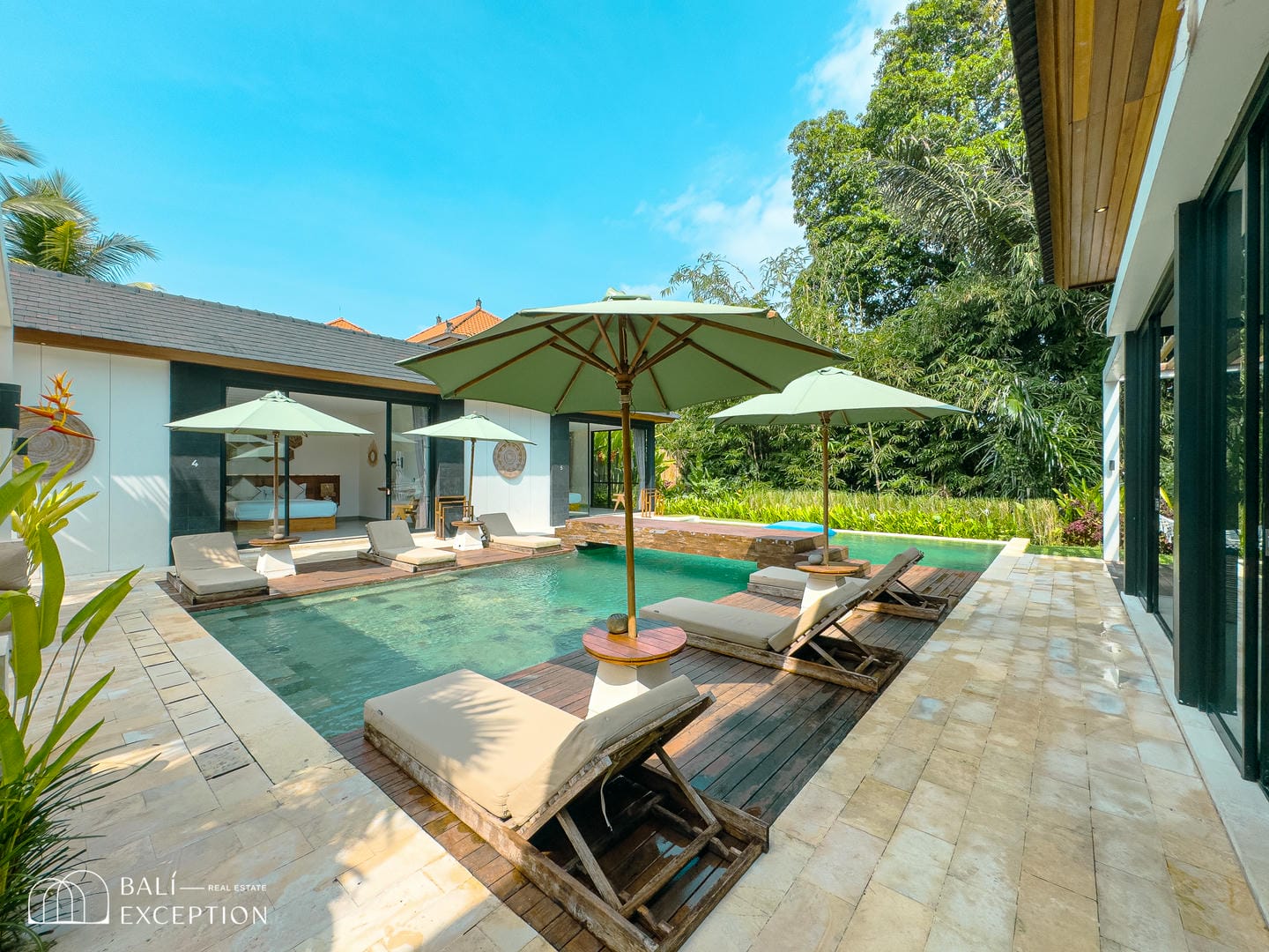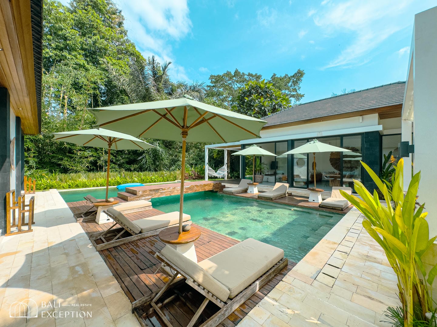 The outdoor area features a 70 sqm swimming pool at the center of the property, surrounded by sun loungers, tropical plants, and peaceful jungle views. The villa also offers a 45 sqm parking area.