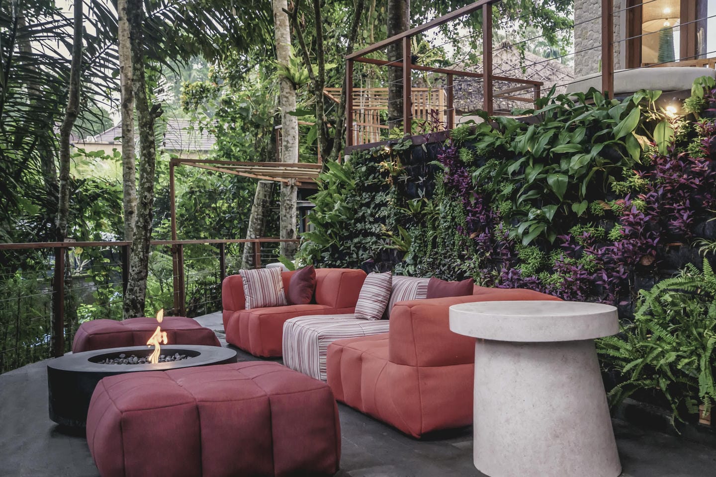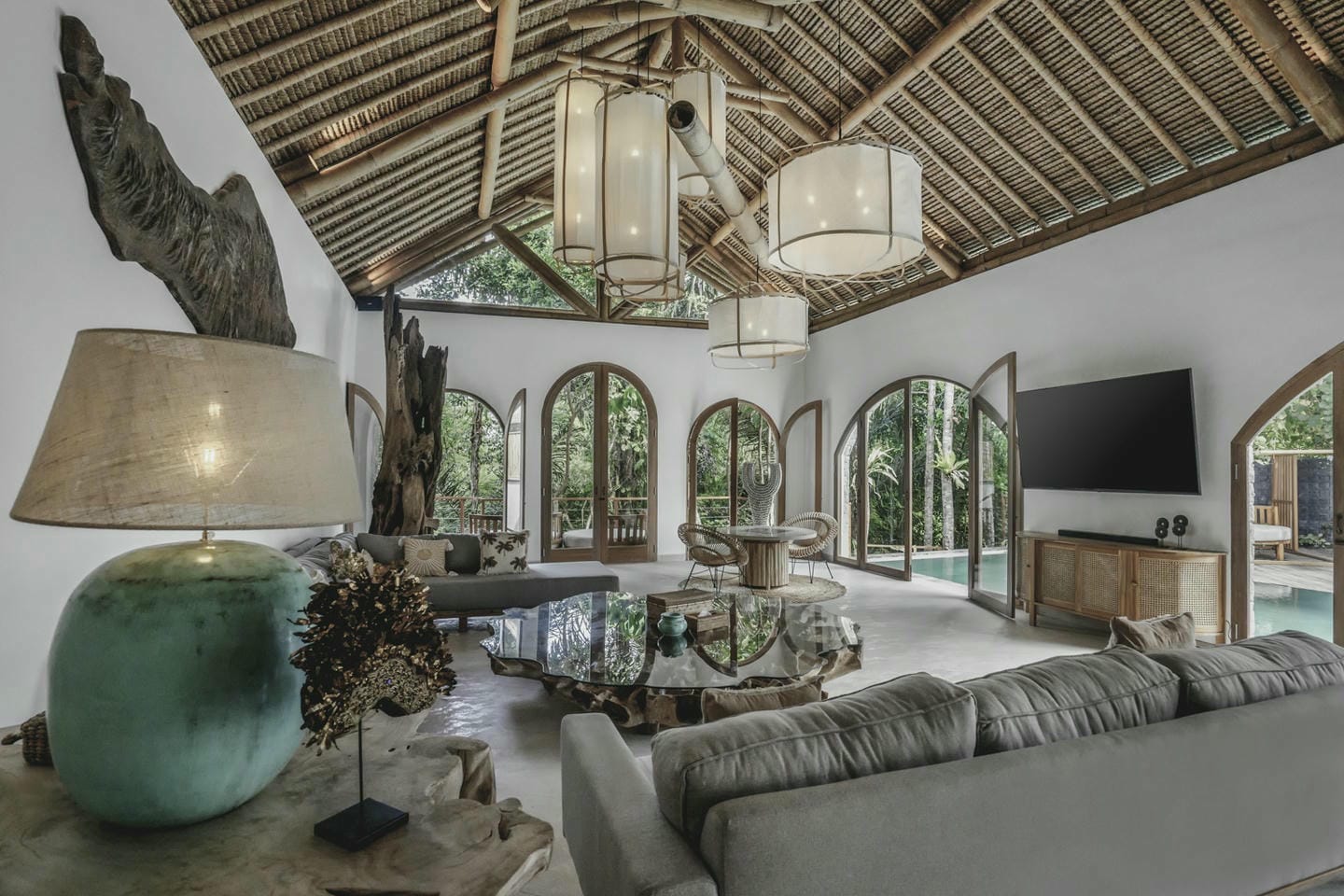 The outdoor area features a swimming pool at the center of the property, surrounded by tropical greenery and peaceful jungle views that create a calm and relaxing atmosphere.