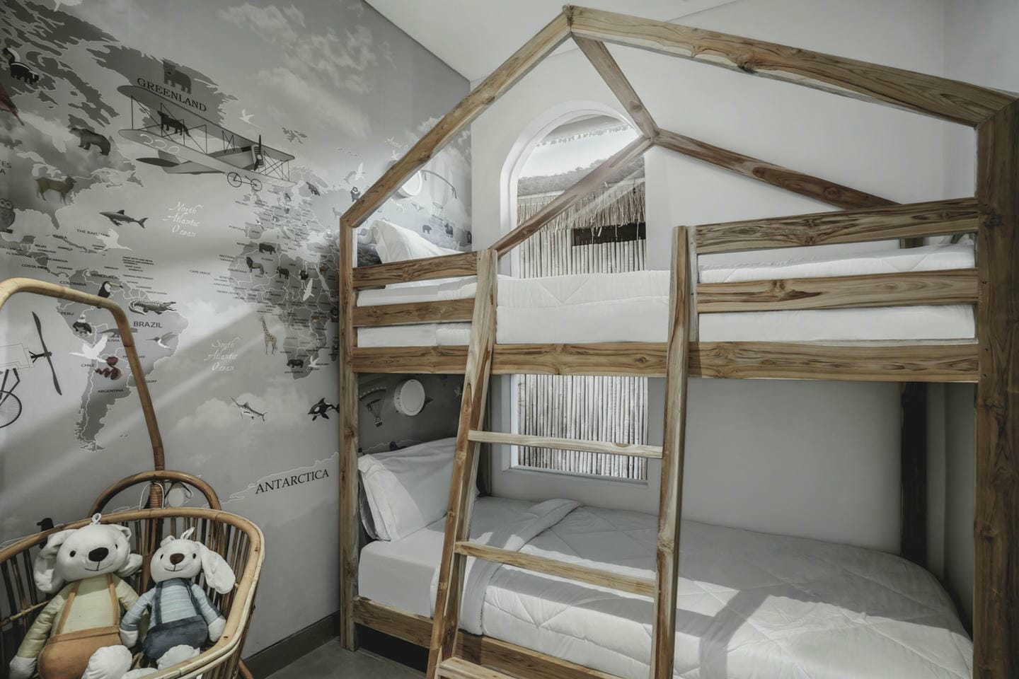 Inside, the villa showcases high ceilings and natural wood finishes. The property features six spacious bedrooms, each with its own ensuite bathroom, as well as an additional guest bathroom. Fully furnished, the villa is set on 1,230 sqm of land and offers generous living areas, a bright open-plan living and dining space, and a fully equipped kitchen that flows naturally throughout the home.