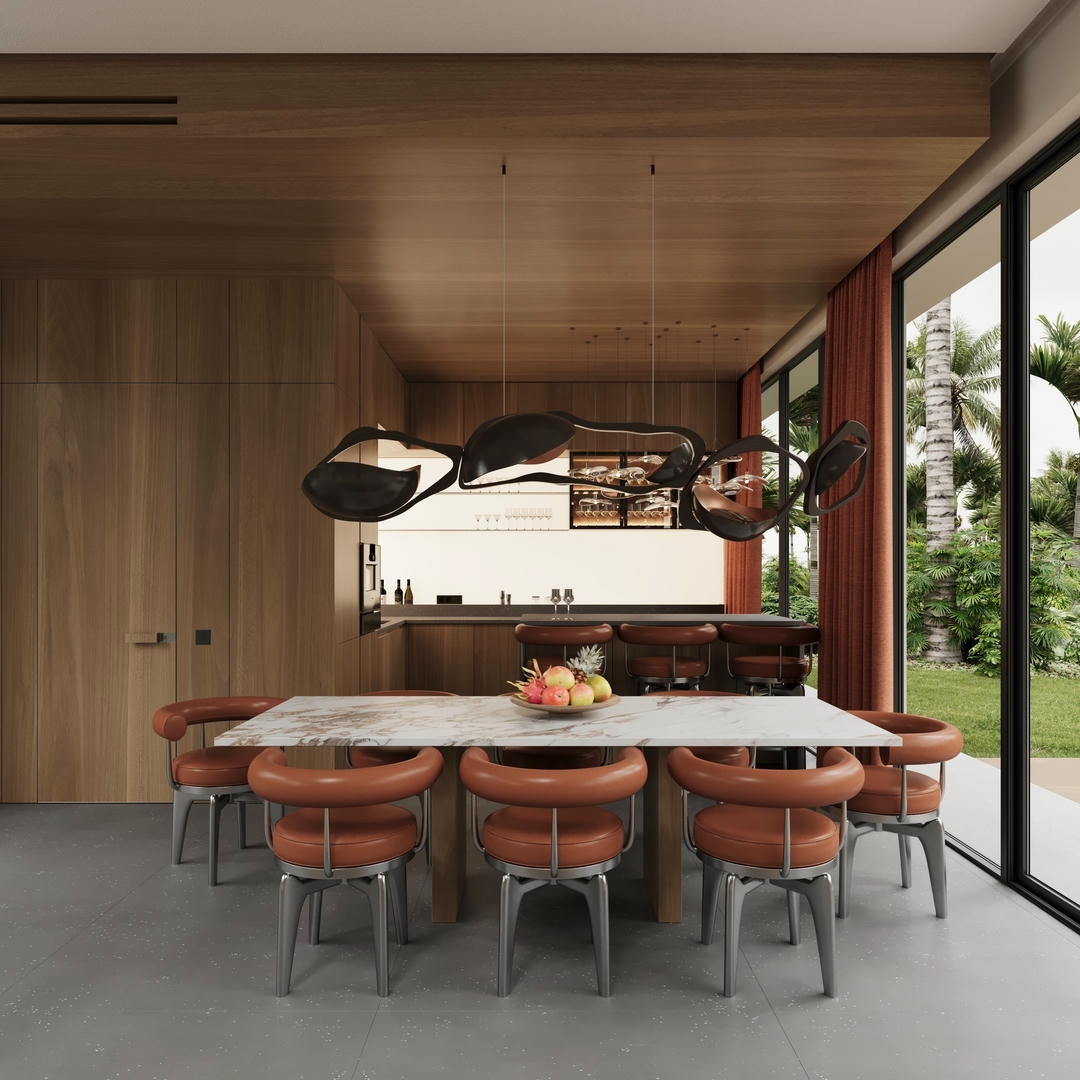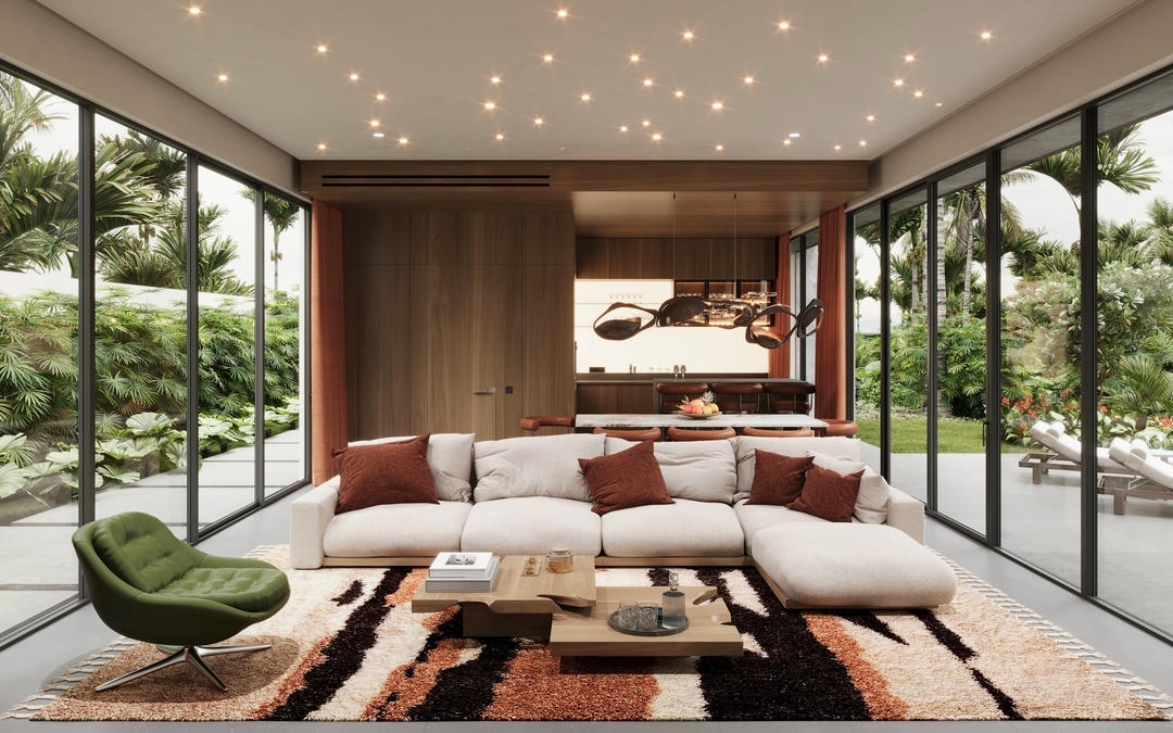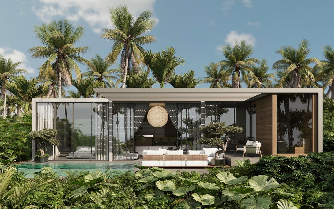 The villa offers options of 1, 2, or 3 bedrooms, each with ensuite bathrooms, and comes fully furnished with a fully equipped kitchen. The enclosed living room features high ceiling windows and a dining area, creating a bright and comfortable atmosphere.