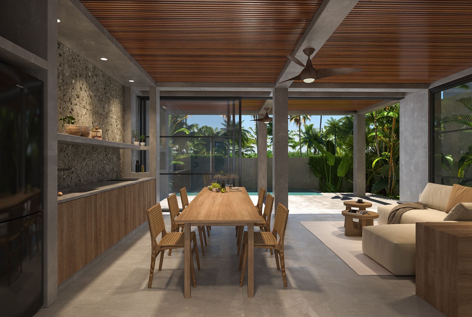This off-plan 2-bedroom villa, each with its own ensuite bathroom, features an enclosed living room with high ceiling windows, creating a bright and inviting atmosphere. The villa comes fully furnished with a modern, fully equipped kitchen, and a dining area designed for comfort and style.