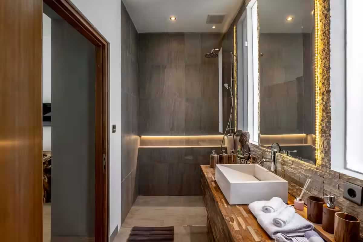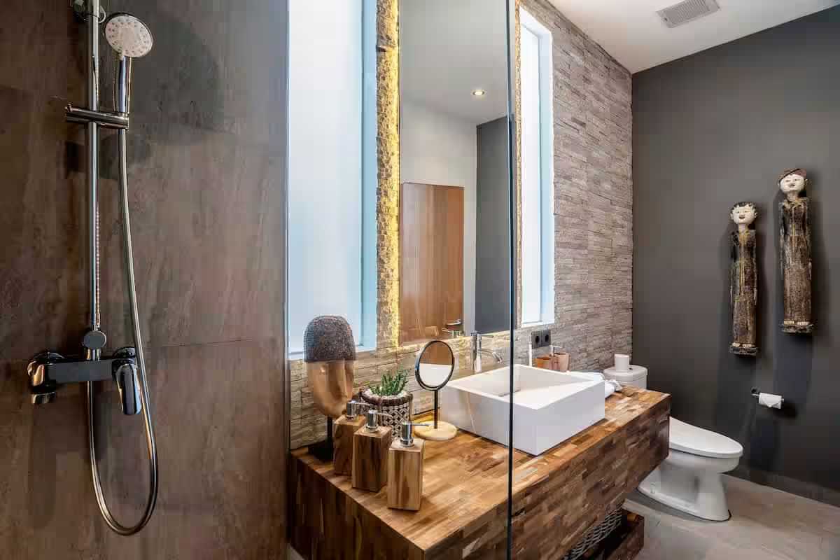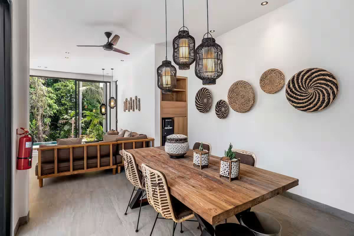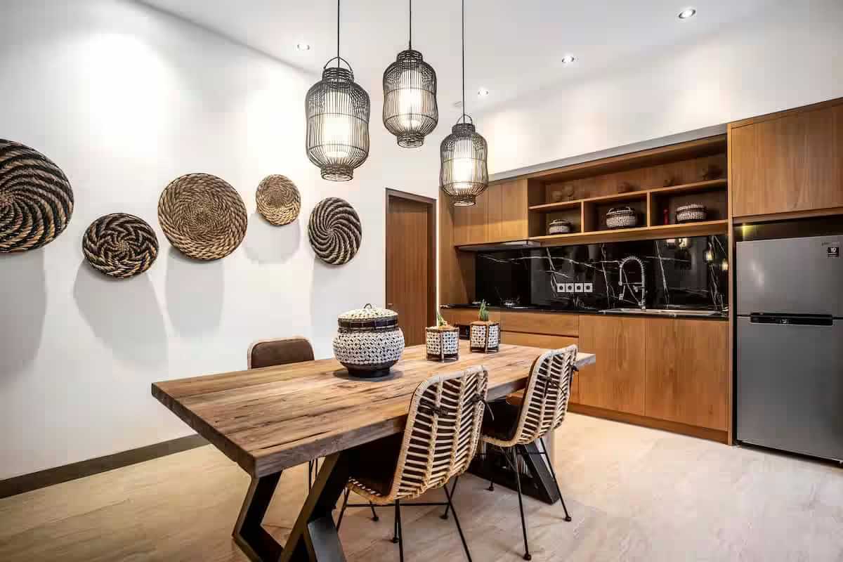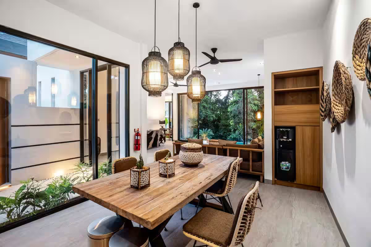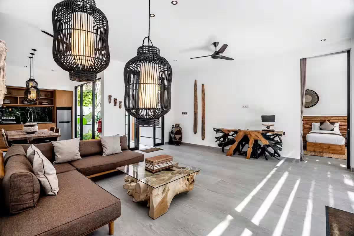 The interior features a modern tropical design with natural wooden accents and earthy tones that create a warm, inviting atmosphere. Each space is thoughtfully designed, combining clean lines with rustic charm for a sophisticated yet cozy living experience.