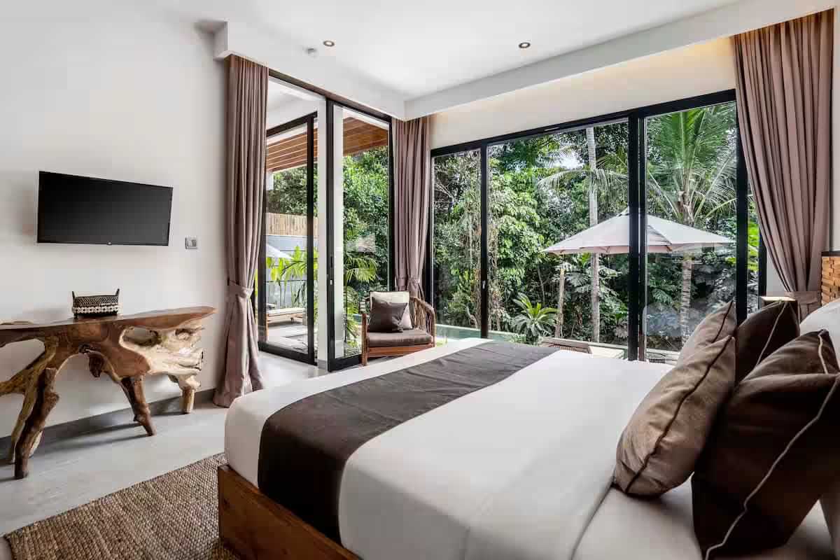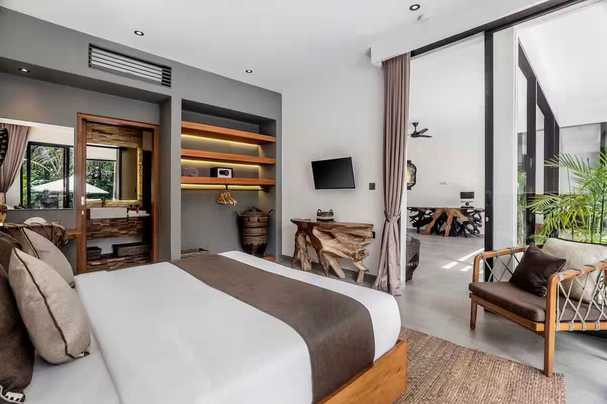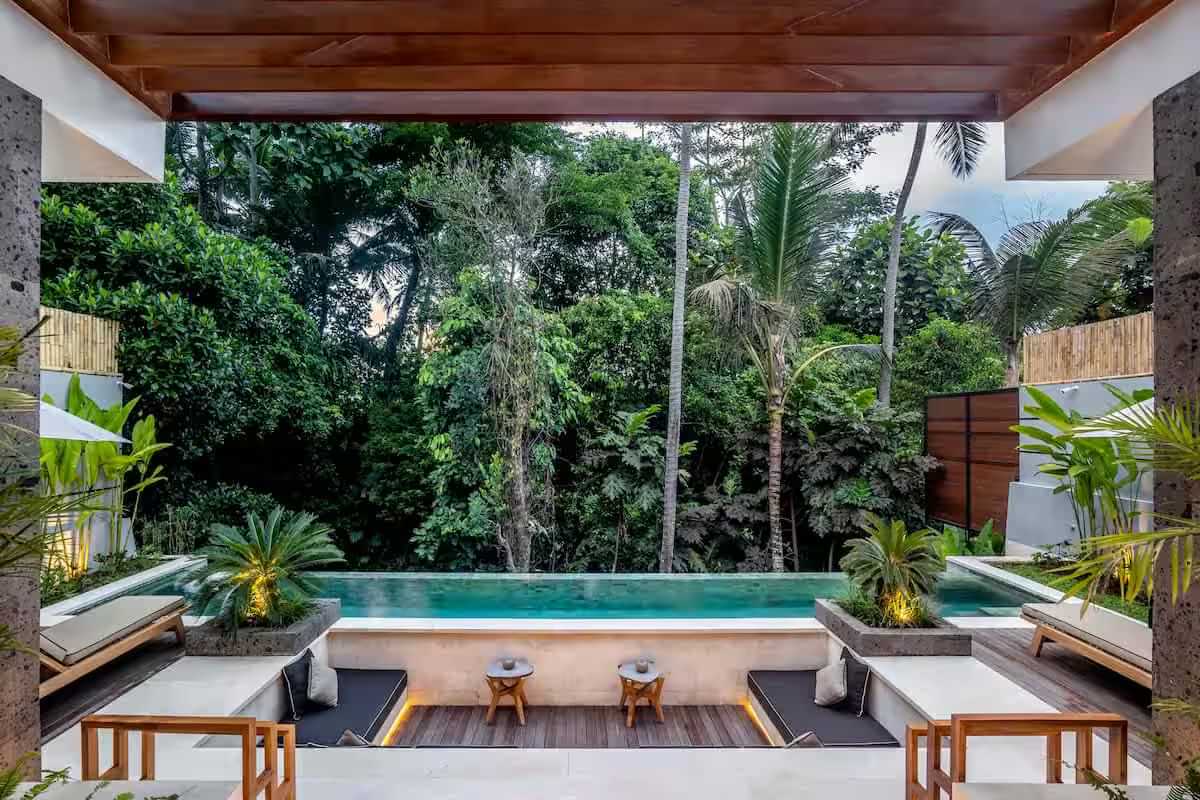 Outdoors, the villa boasts an elegant infinity pool surrounded by tropical greenery, offering tranquil jungle views. The open-concept layout allows seamless indoor-outdoor living, perfect for relaxation or entertaining guests.