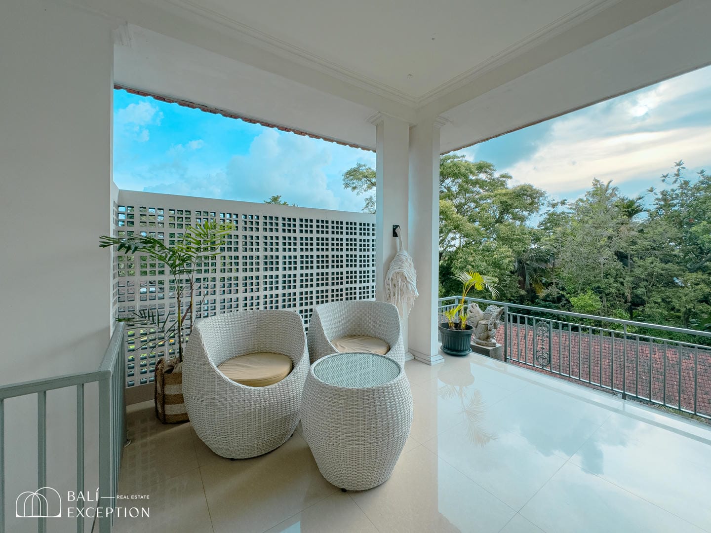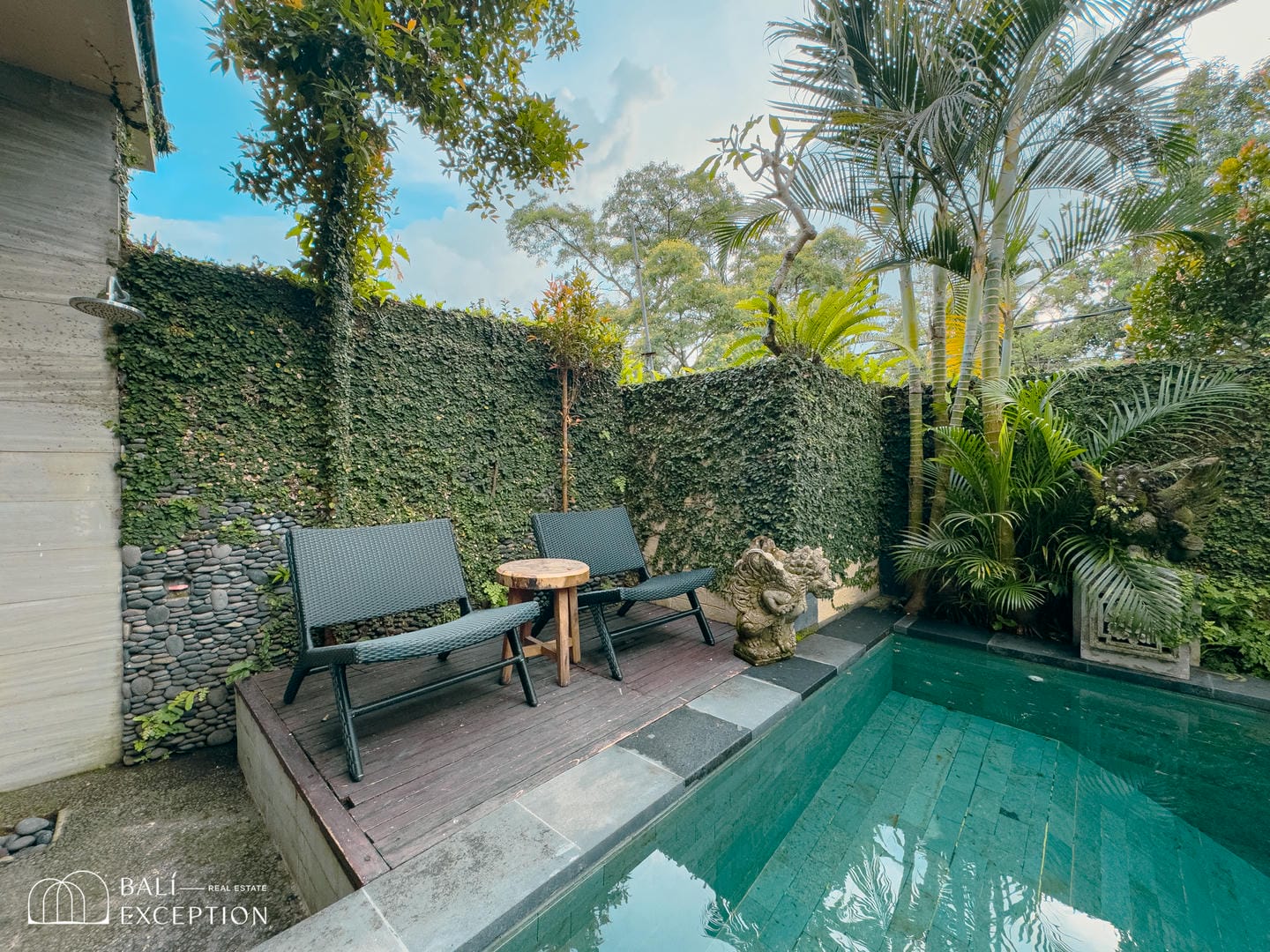 Completing the experience, the villa features its own private pool. The balcony offers calming views of the lush gardens and shimmering pool.