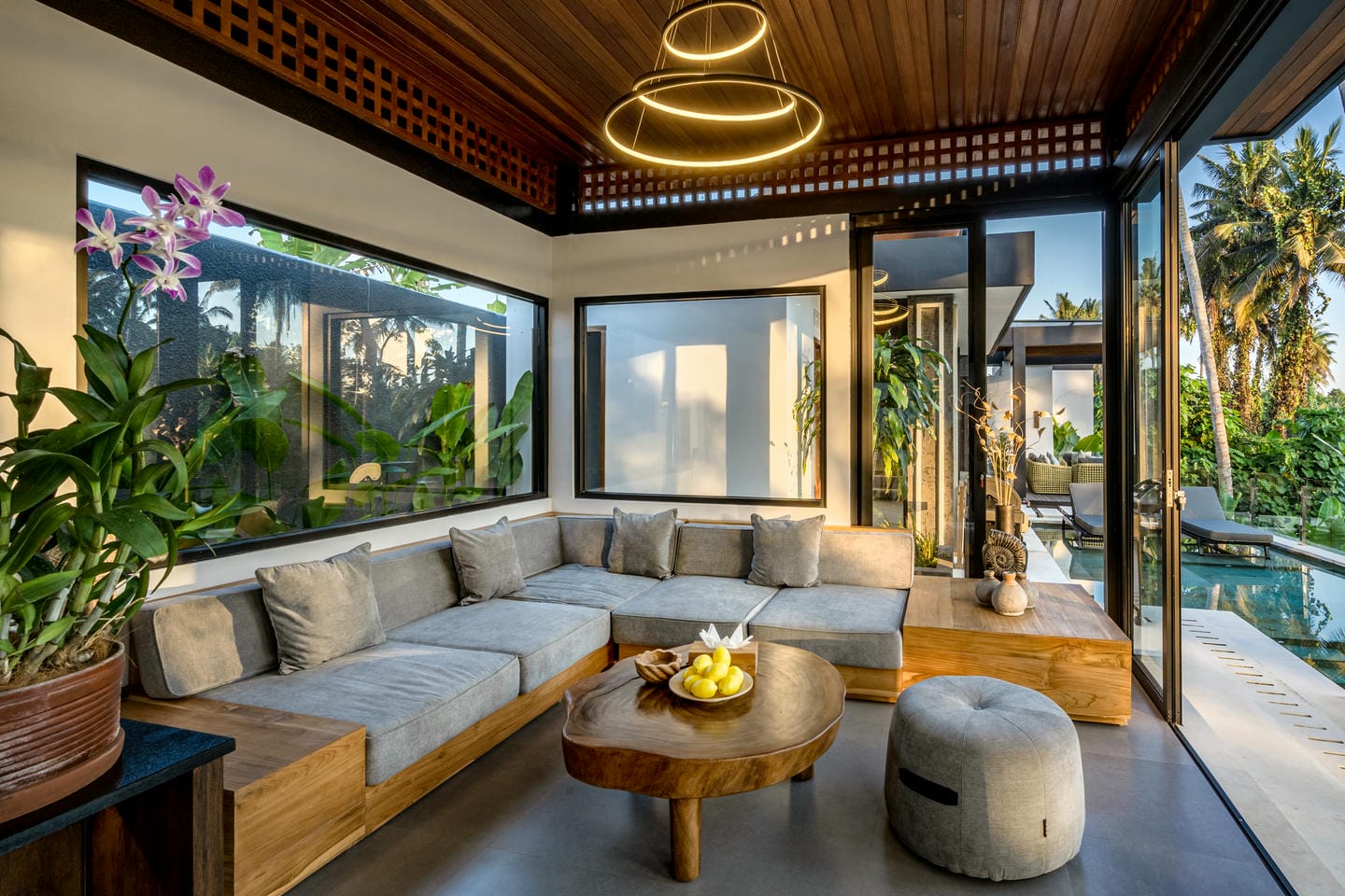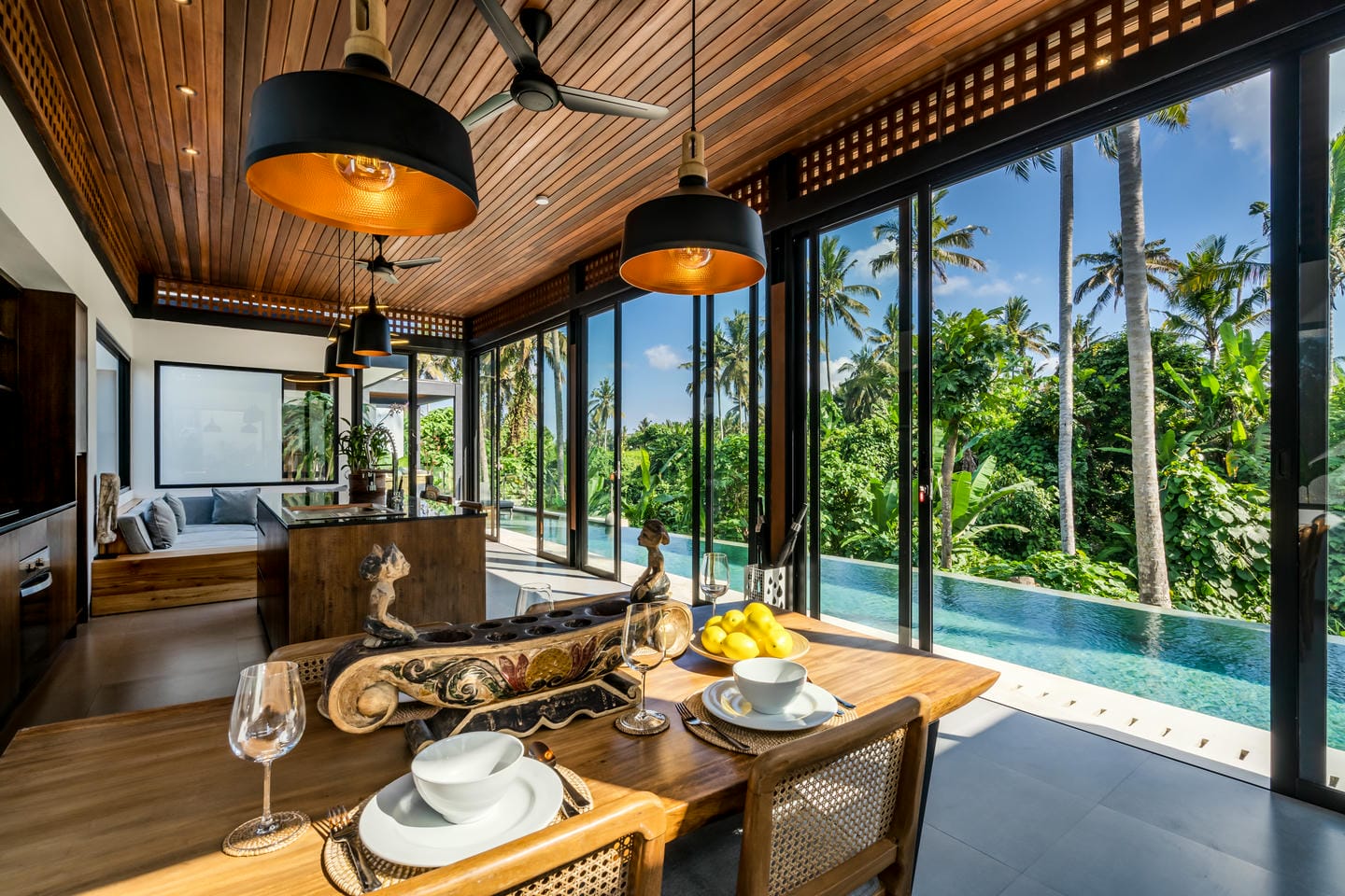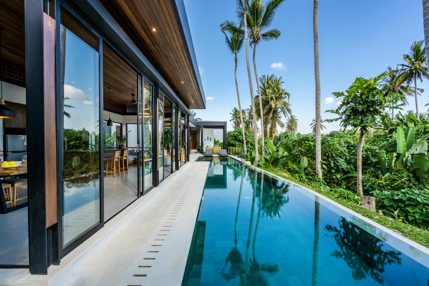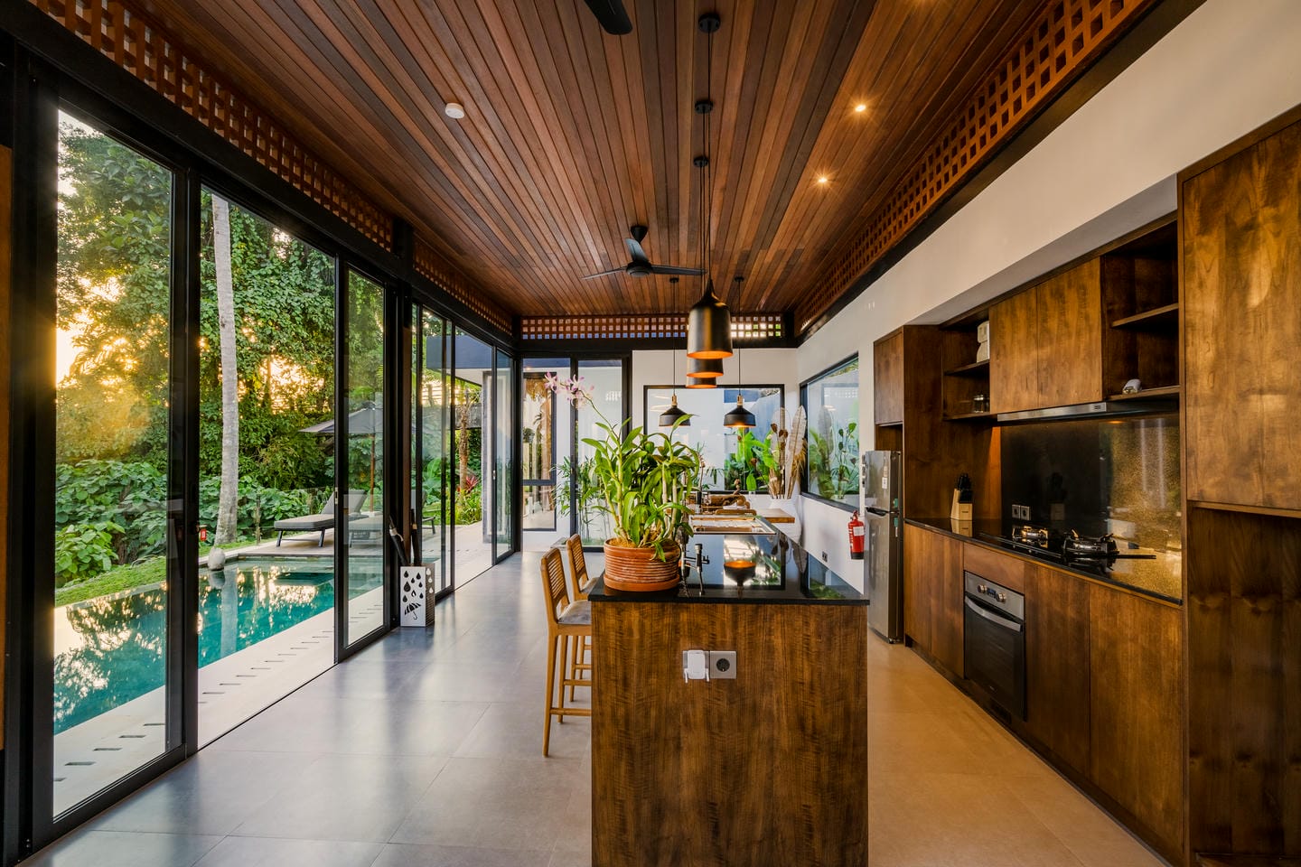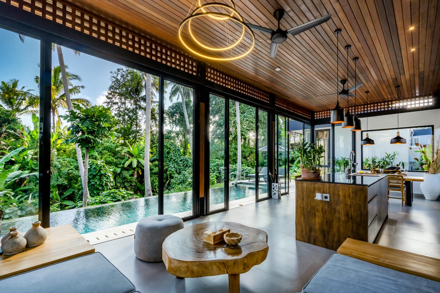 The interior features a modern tropical design with clean architectural lines, large glass sliding doors, and warm wooden accents. Each bedroom is bright and airy, complete with ensuite bathrooms and direct access to the outdoor area. The open-plan living and dining space is enhanced by high wooden ceilings and stylish lighting, creating a cozy yet elegant ambiance.