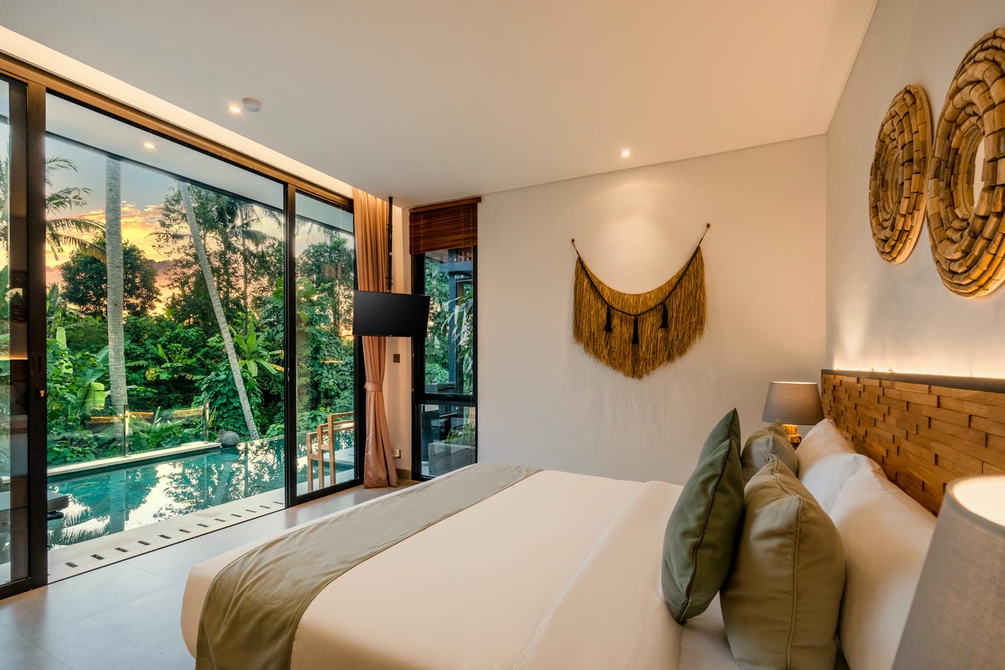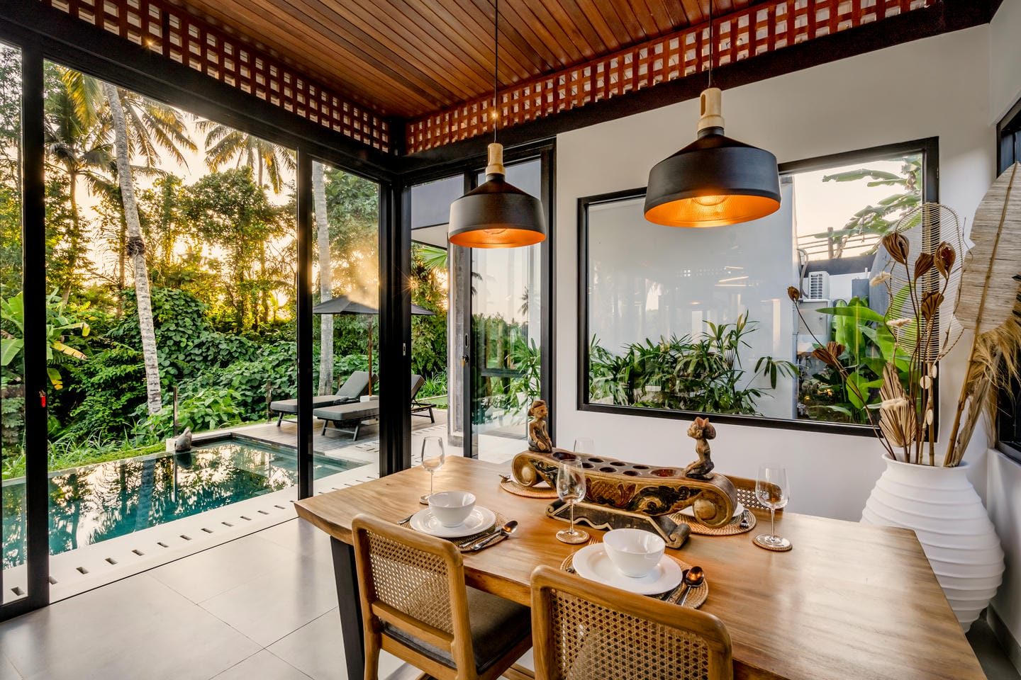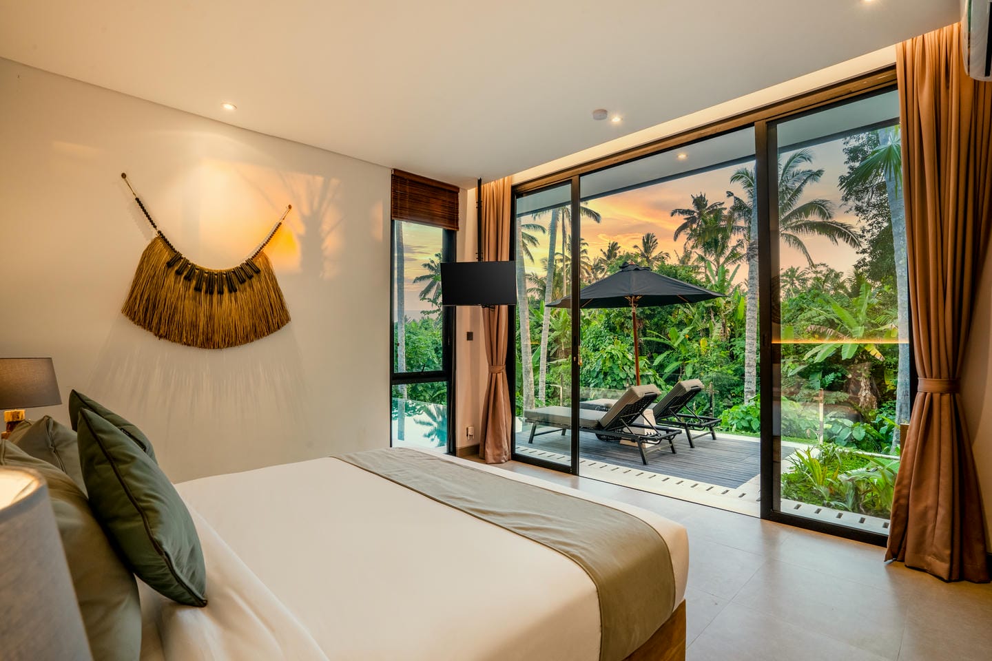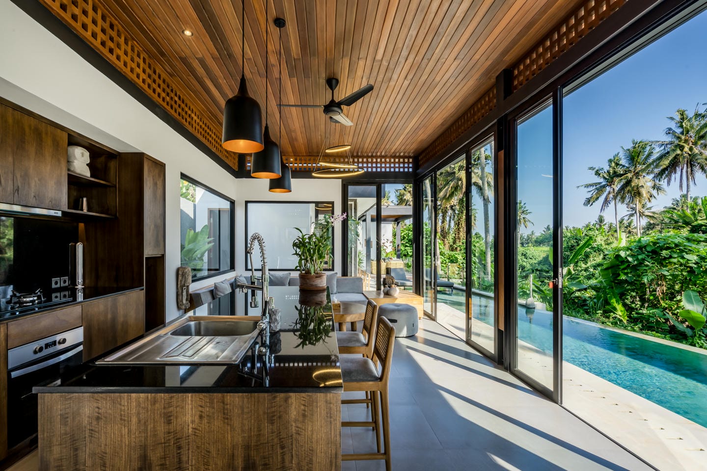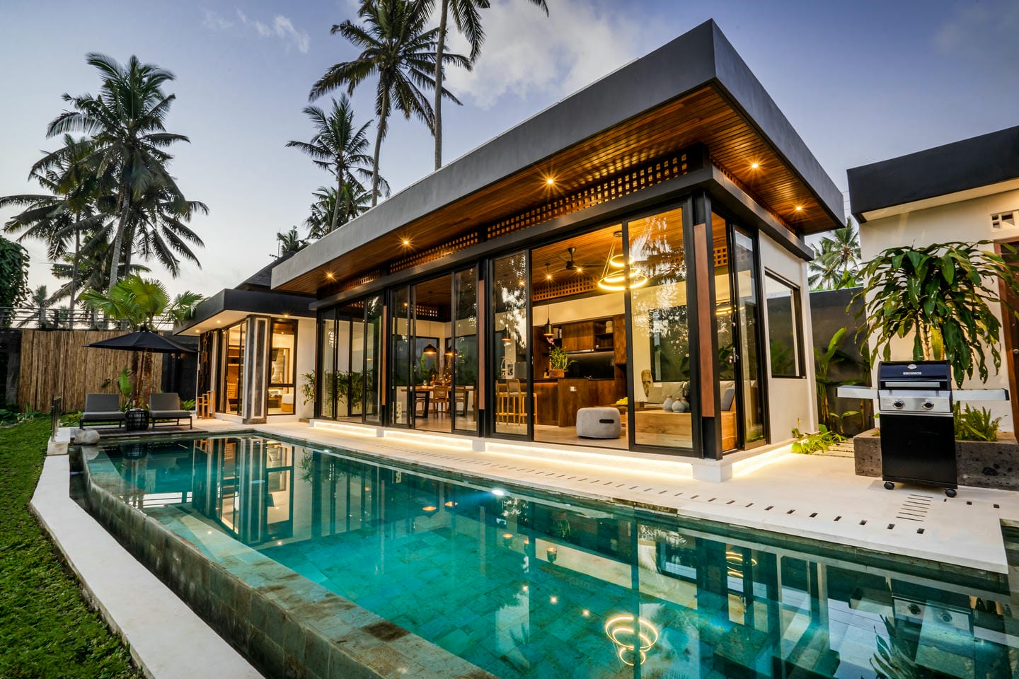 The interior features a modern tropical design with clean architectural lines, large glass sliding doors, and warm wooden accents. Each bedroom is bright and airy, complete with ensuite bathrooms and direct access to the outdoor area. The open-plan living and dining space is enhanced by high wooden ceilings and stylish lighting, creating a cozy yet elegant ambiance.