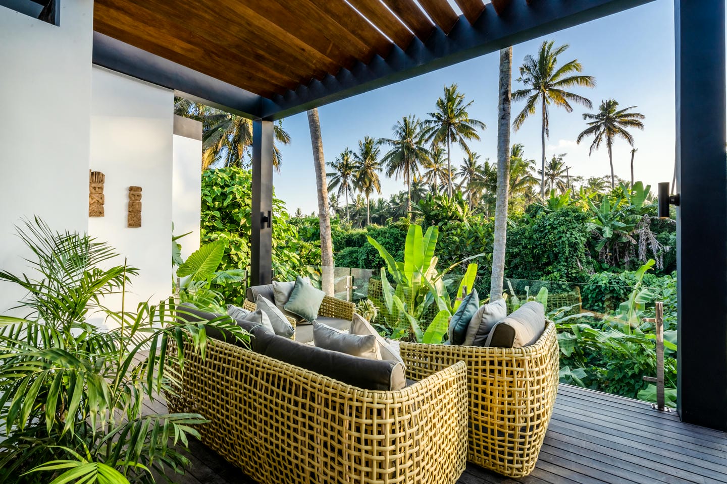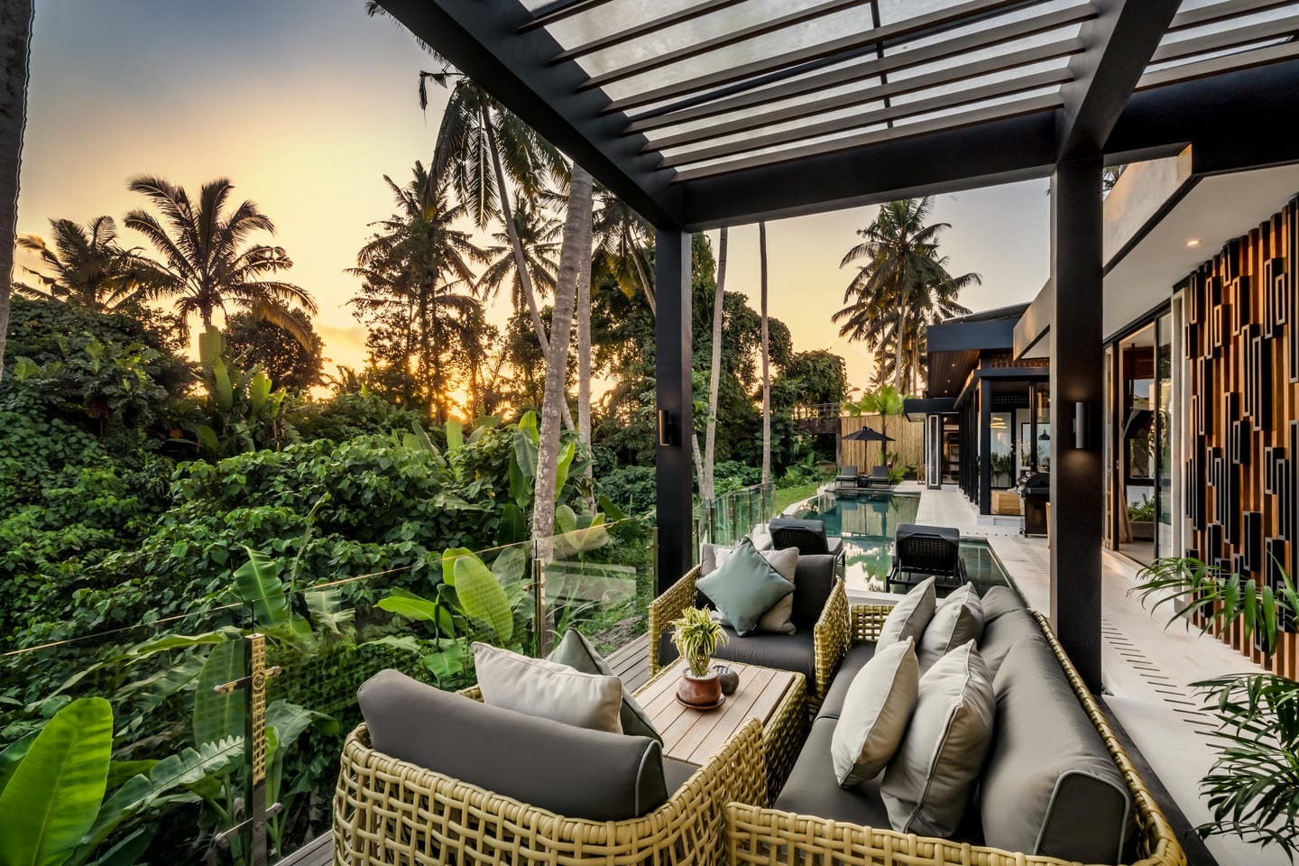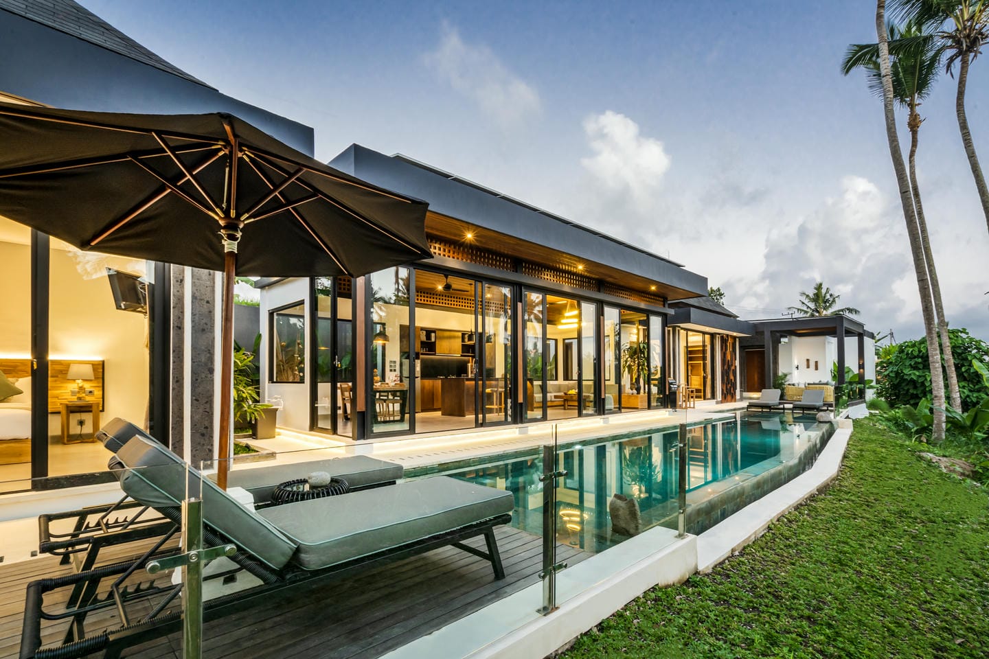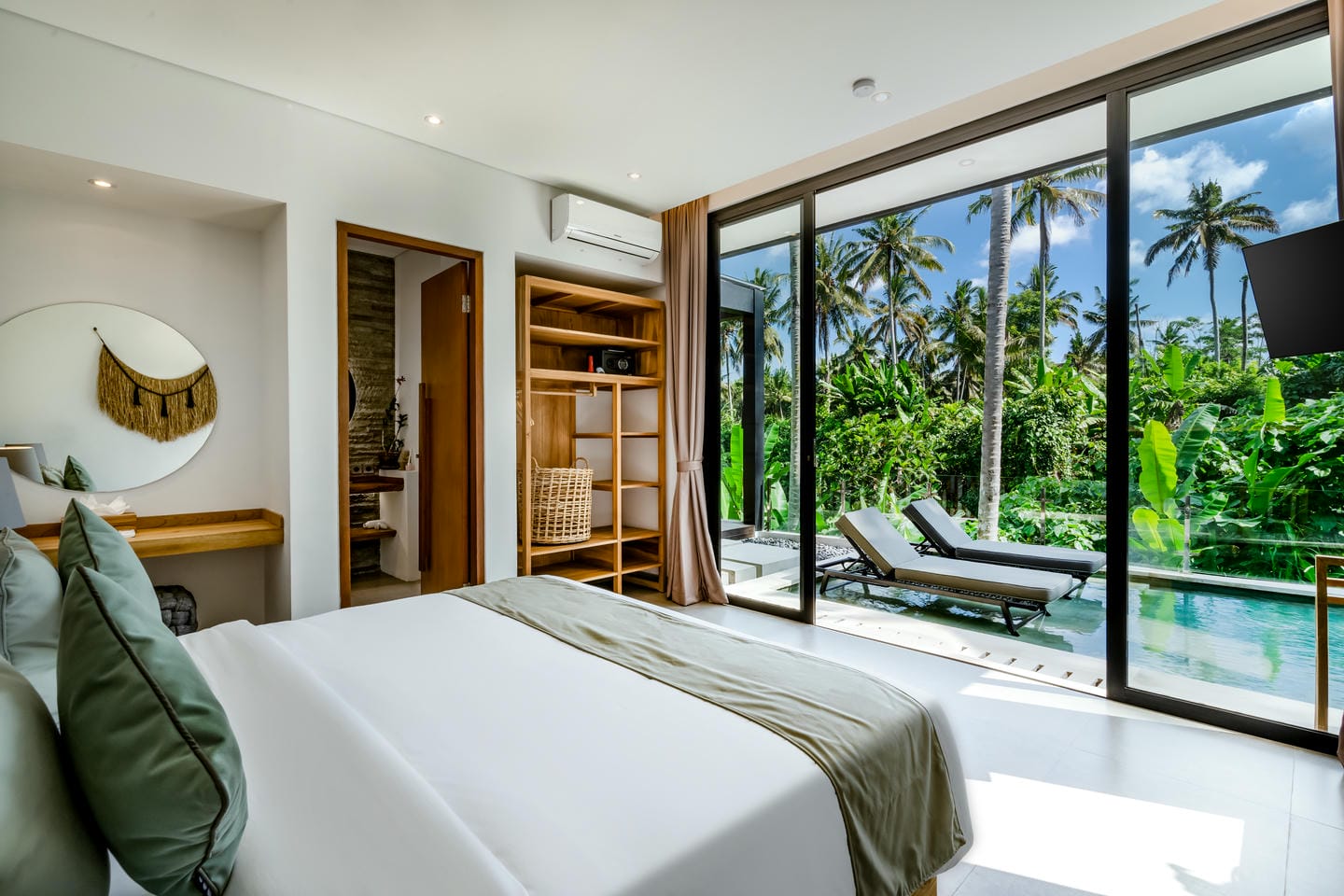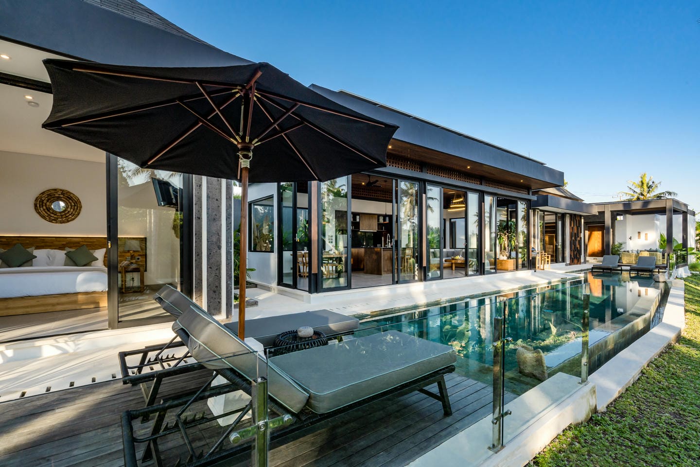 The interior features a modern tropical design with clean architectural lines, large glass sliding doors, and warm wooden accents. Each bedroom is bright and airy, complete with ensuite bathrooms and direct access to the outdoor area. The open-plan living and dining space is enhanced by high wooden ceilings and stylish lighting, creating a cozy yet elegant ambiance.