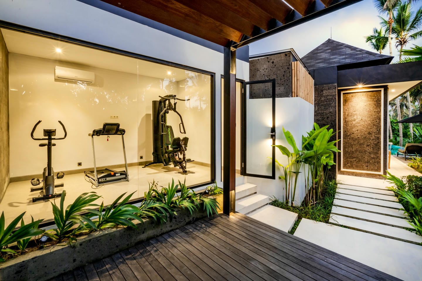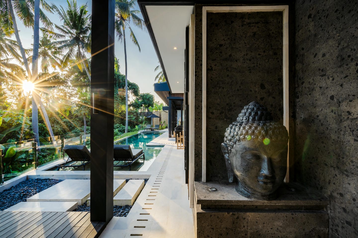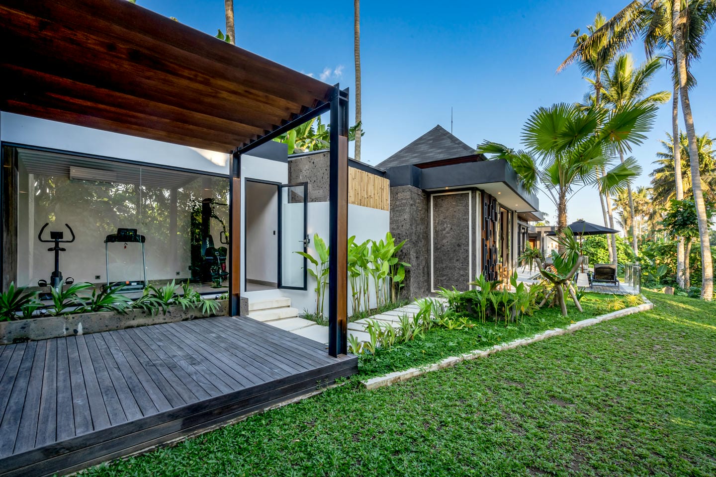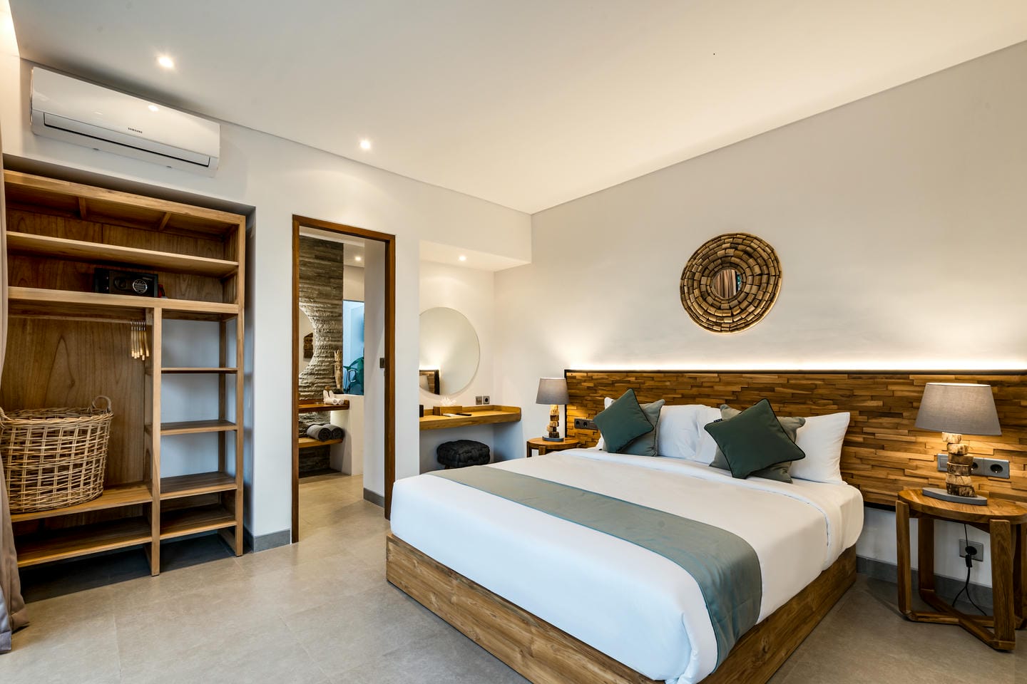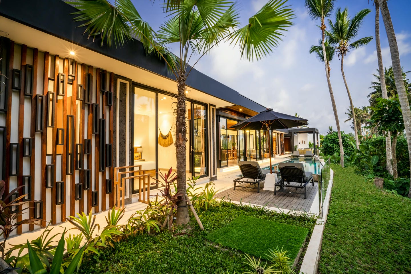 The interior features a modern tropical design with clean architectural lines, large glass sliding doors, and warm wooden accents. Each bedroom is bright and airy, complete with ensuite bathrooms and direct access to the outdoor area. The open-plan living and dining space is enhanced by high wooden ceilings and stylish lighting, creating a cozy yet elegant ambiance.
