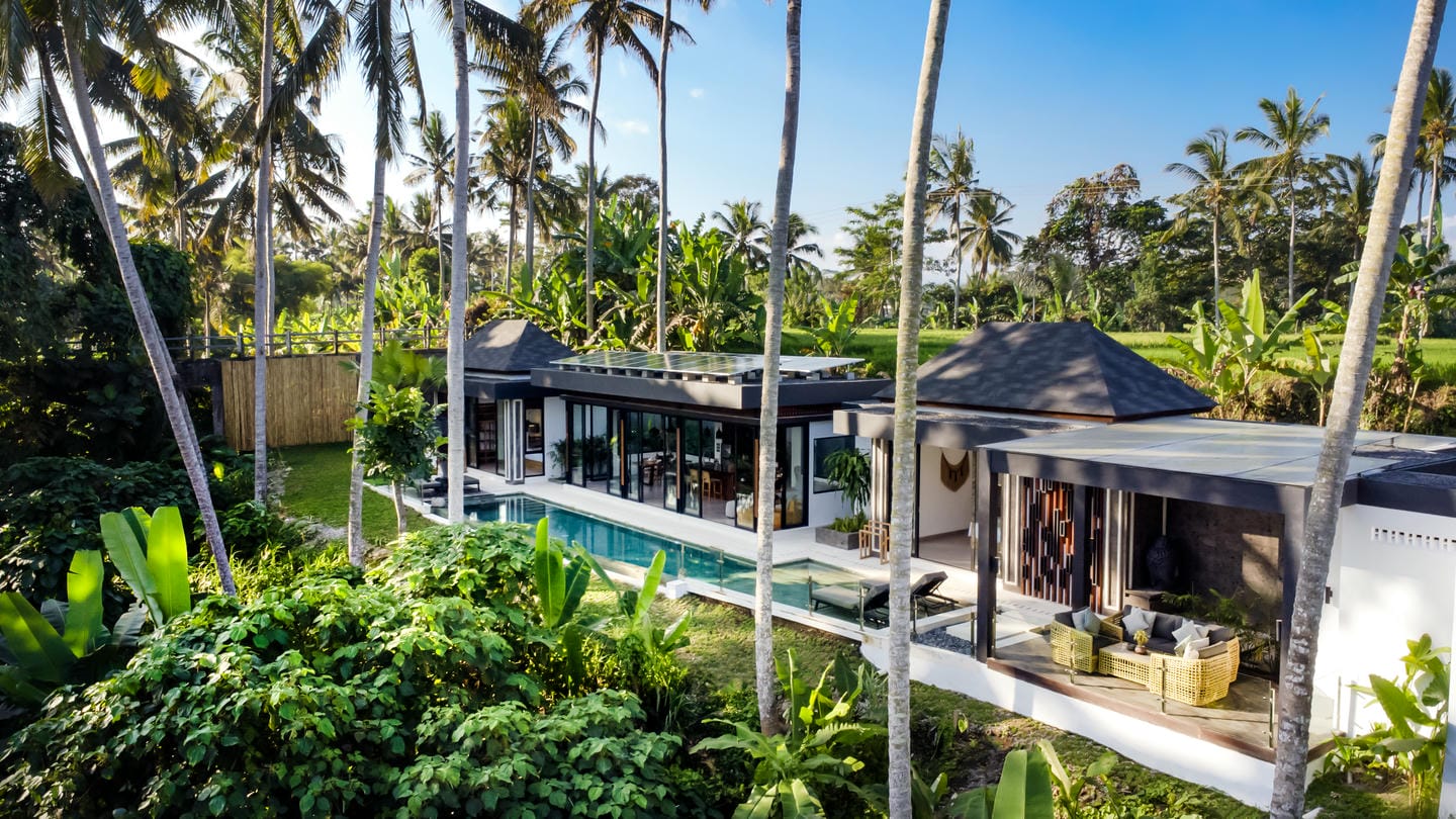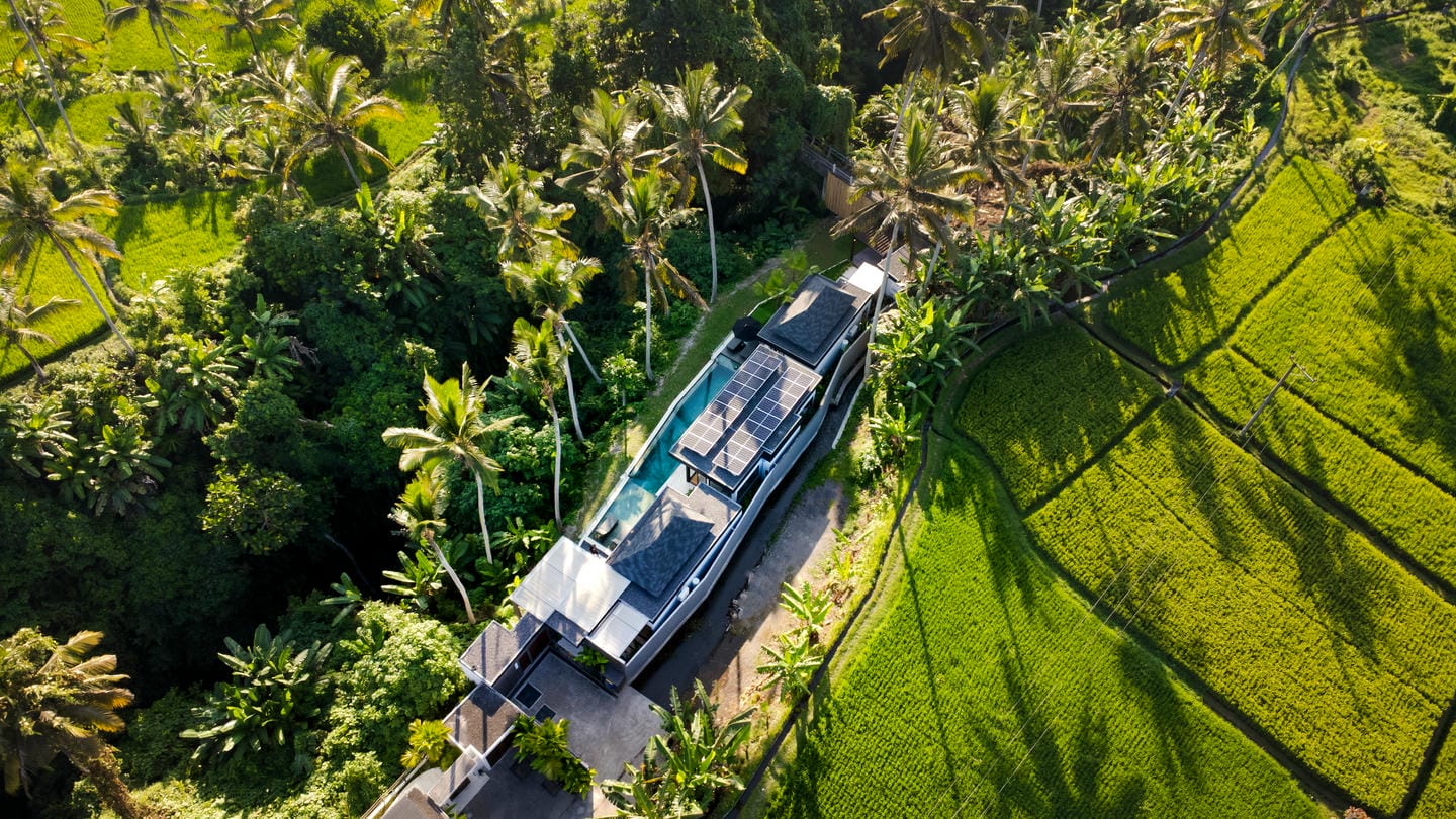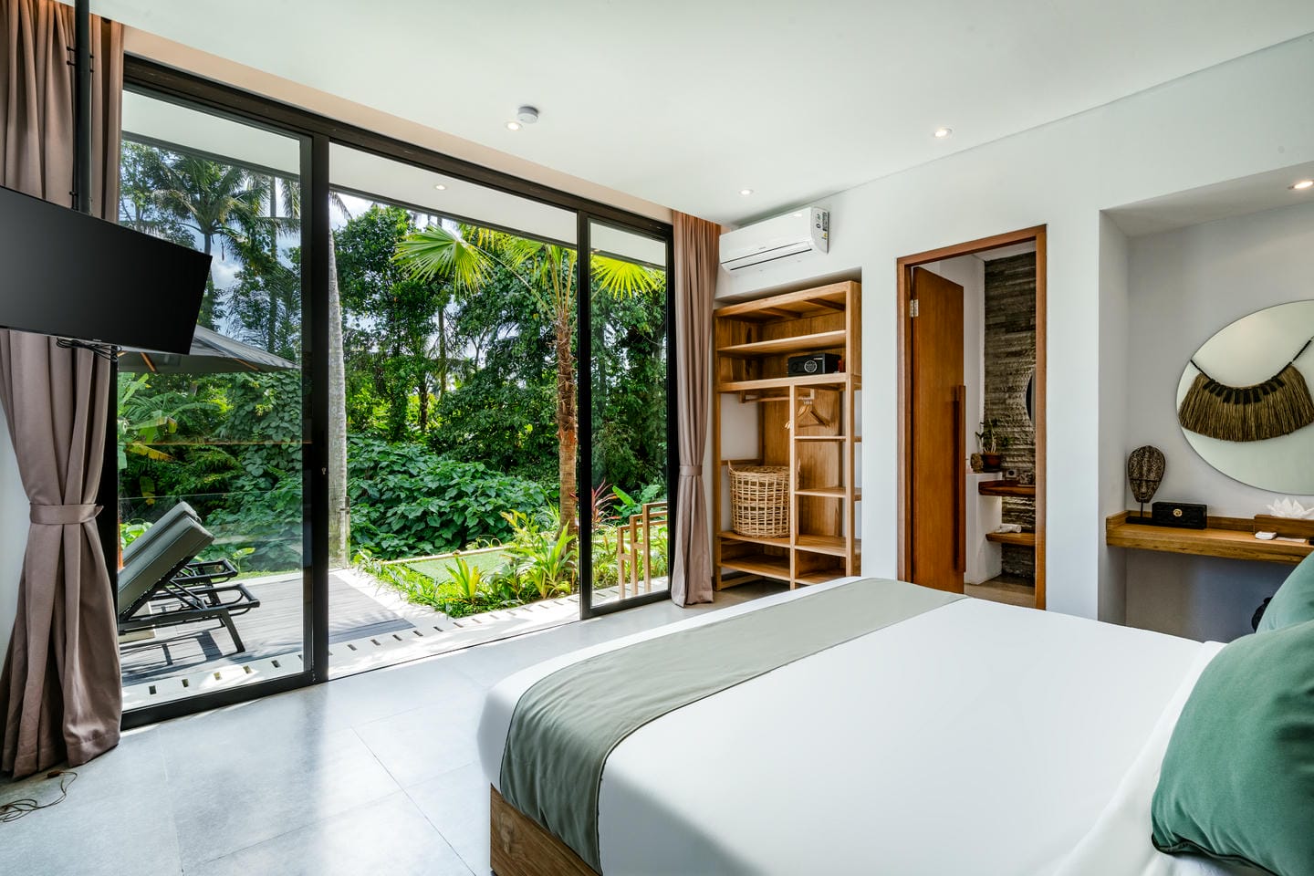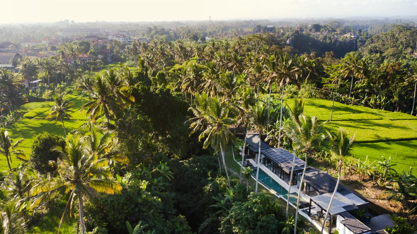 Outside, the villa boasts a private swimming pool overlooking beautiful green rice fields and palm trees. The spacious terrace and lounge area provide the perfect spot to relax, entertain guests, or simply enjoy the tranquil Ubud surroundings.