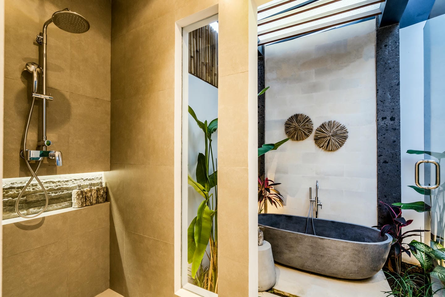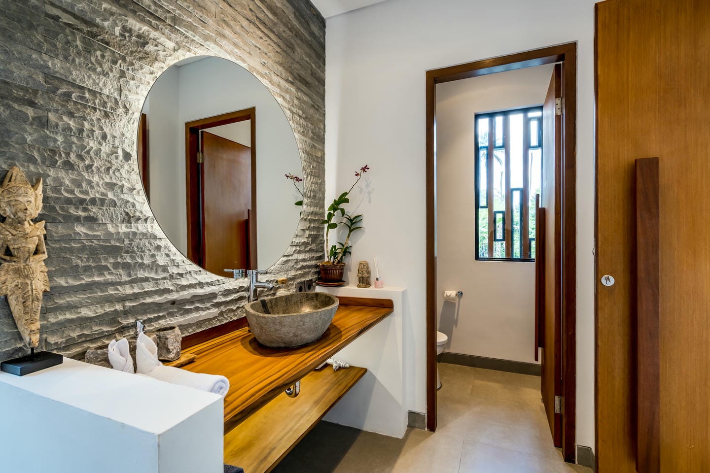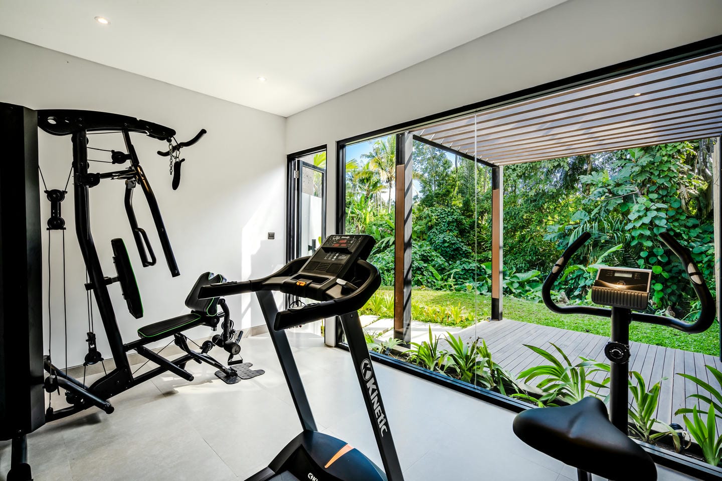 Outside, the villa boasts a private swimming pool overlooking beautiful green rice fields and palm trees. The spacious terrace and lounge area provide the perfect spot to relax, entertain guests, or simply enjoy the tranquil Ubud surroundings.