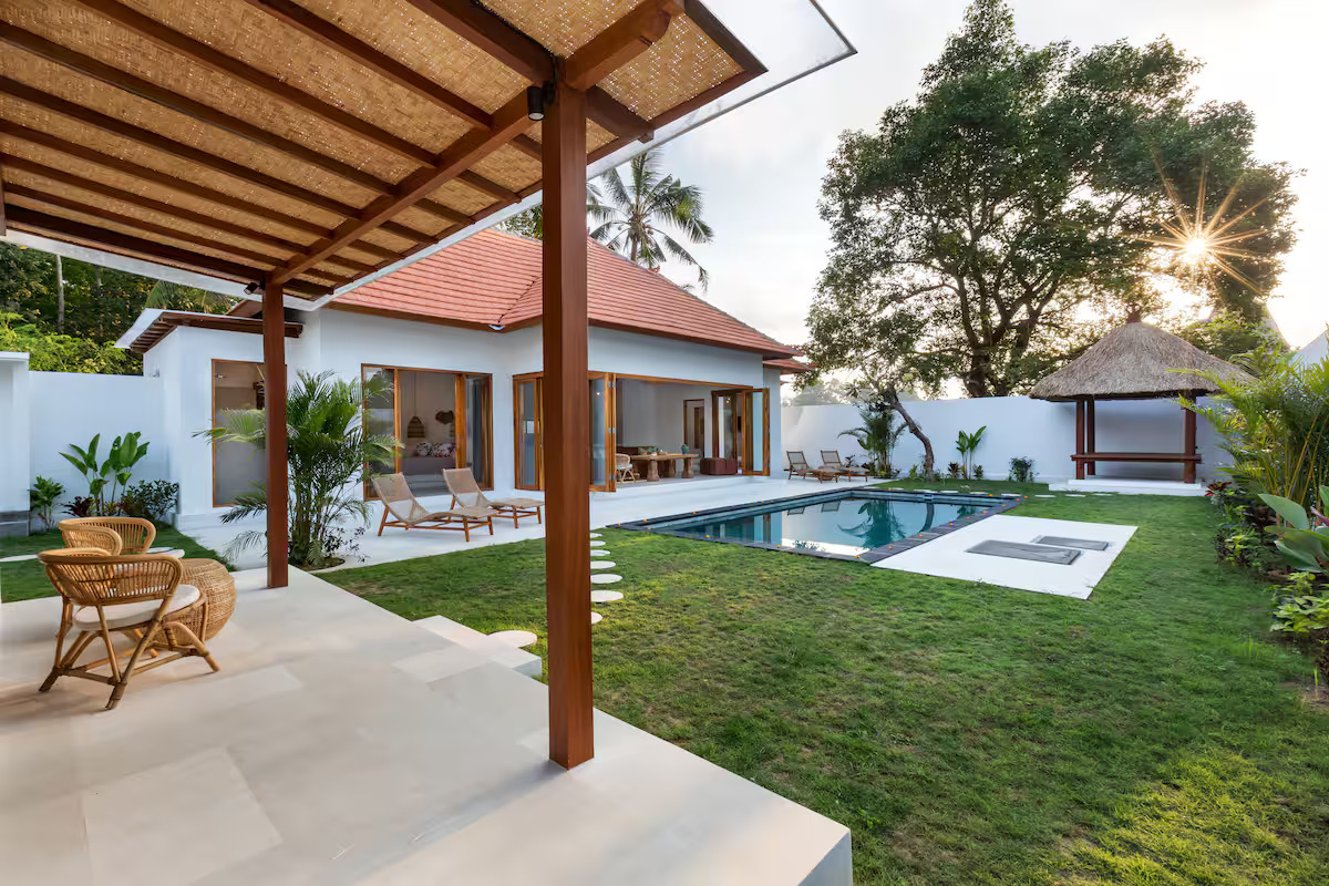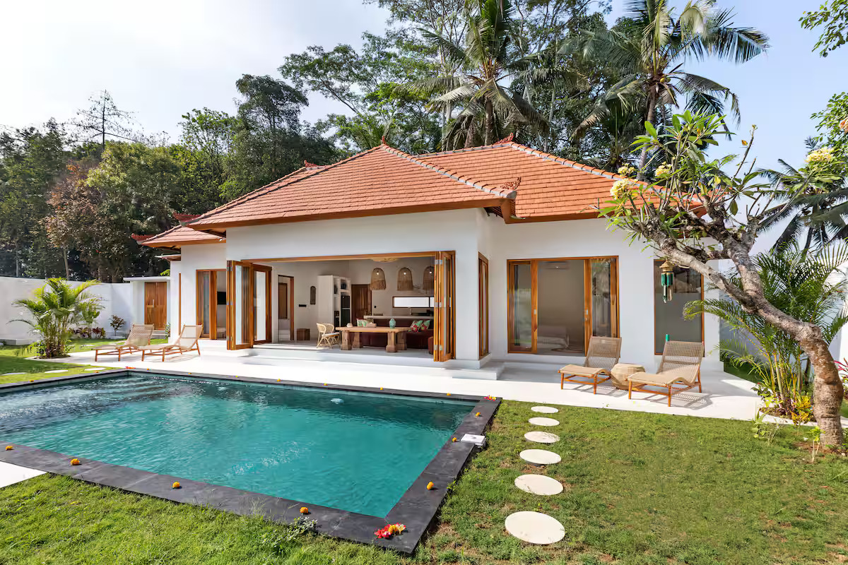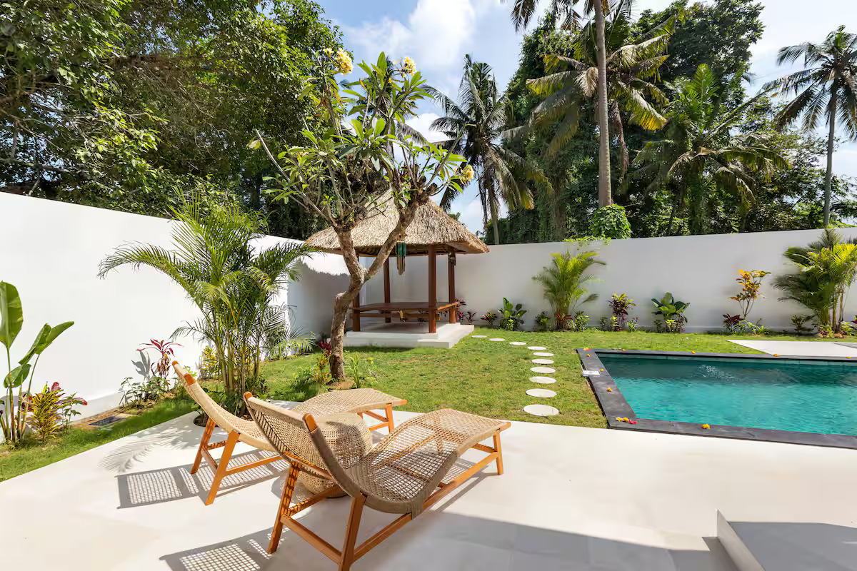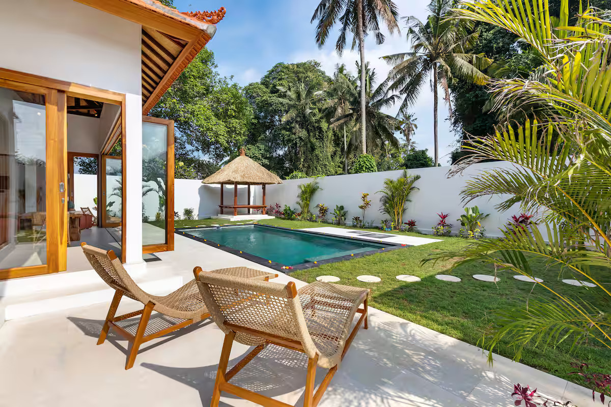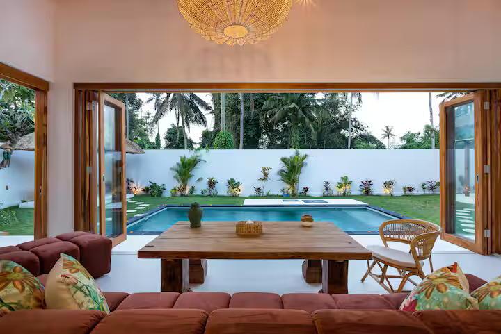 Outdoor, the villa presents a relaxing private pool area framed by tropical landscaping. The view embraces lush greenery and a calm garden setting, creating a tranquil retreat perfect for unwinding or entertaining guests. The seamless indoor-outdoor connection enhances the overall tropical living experience.