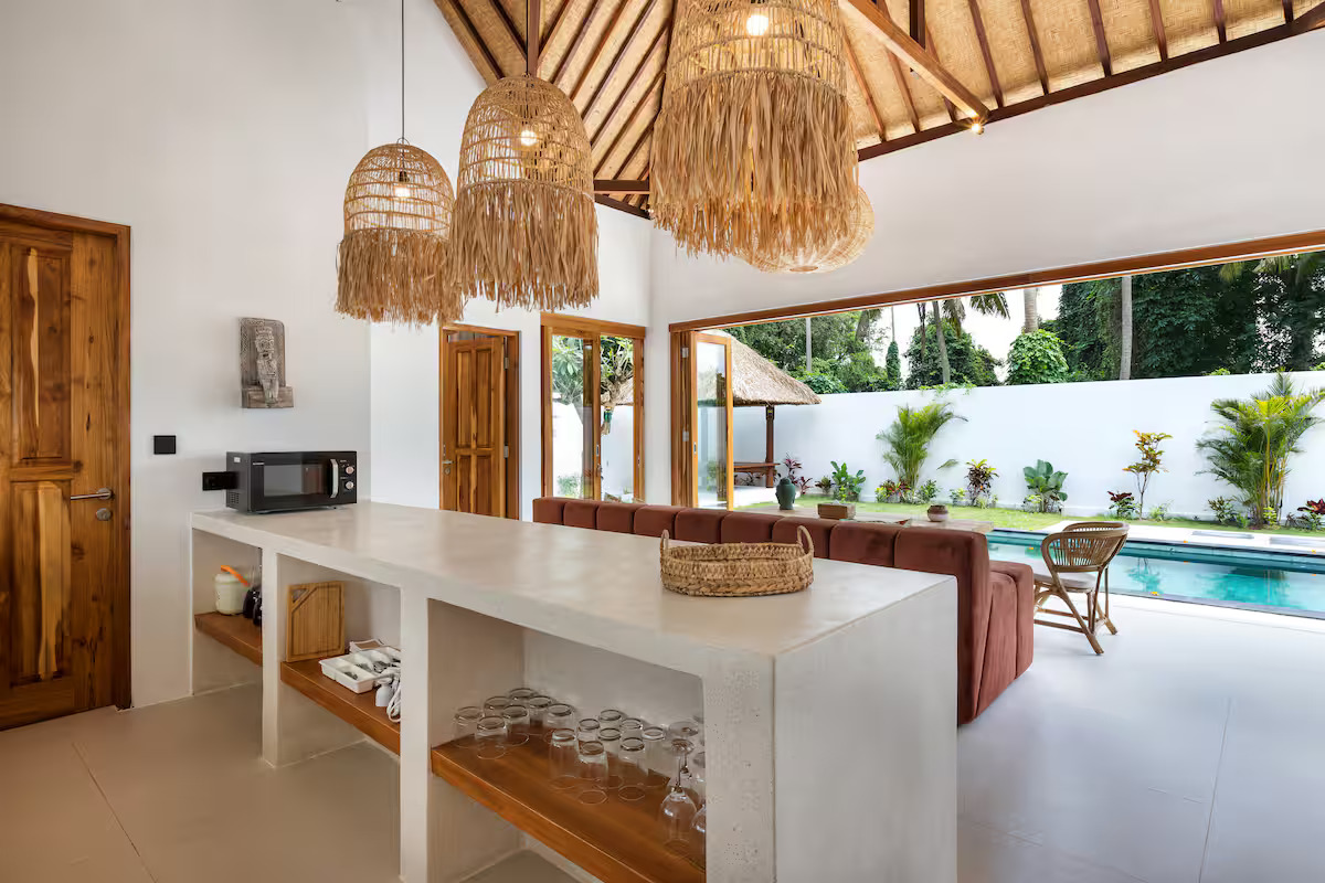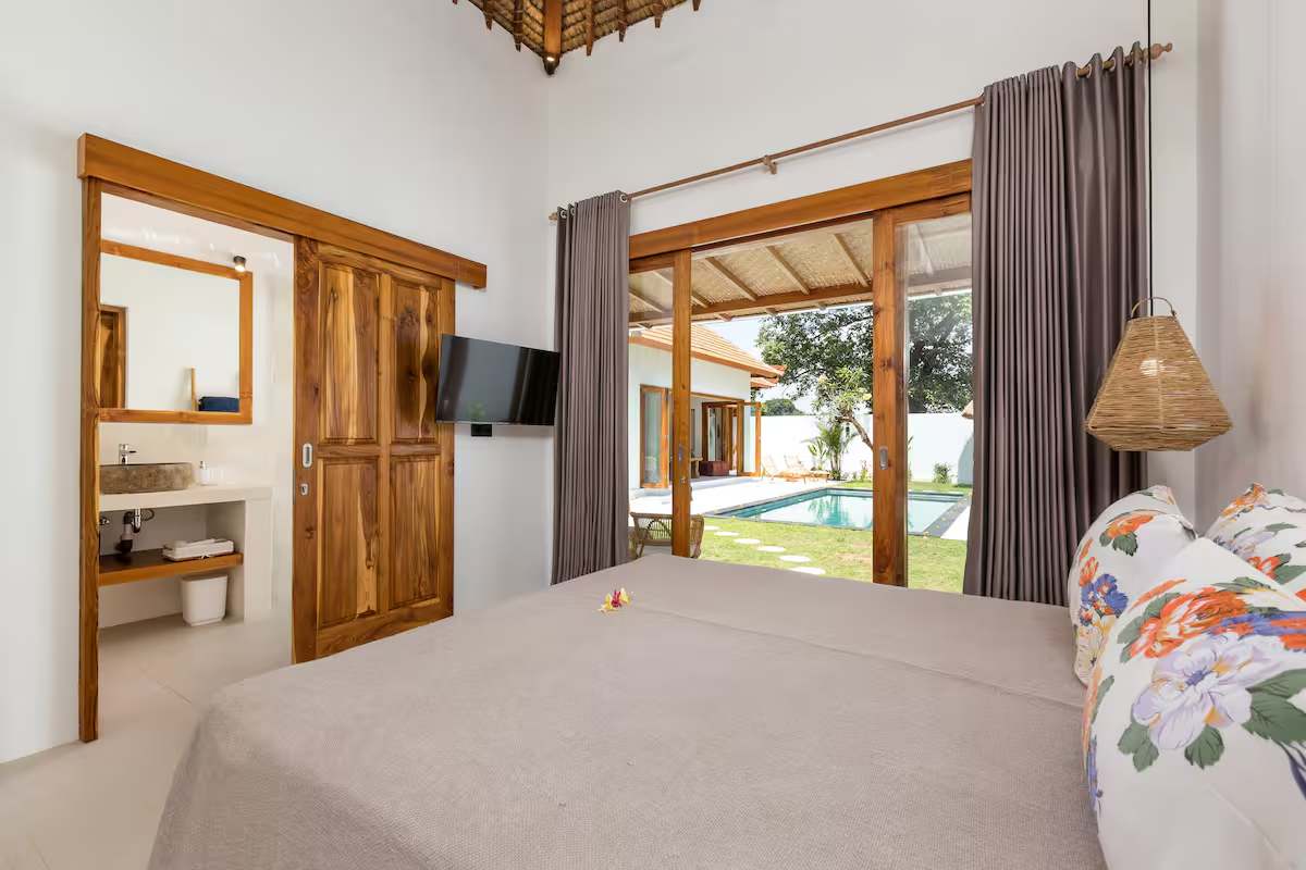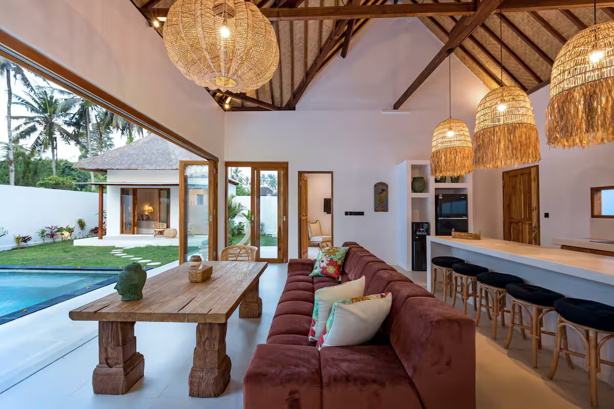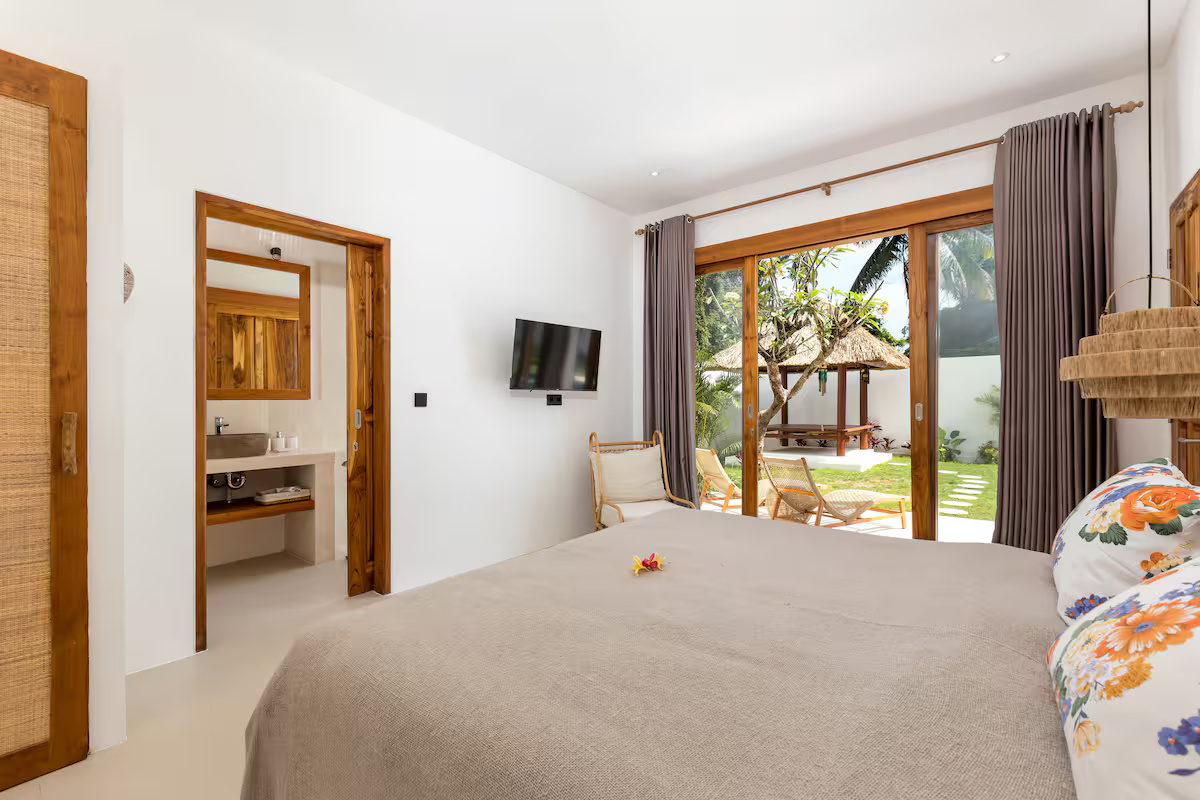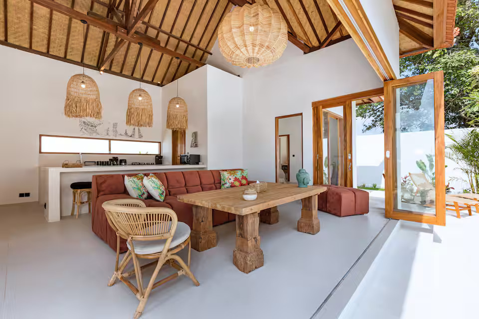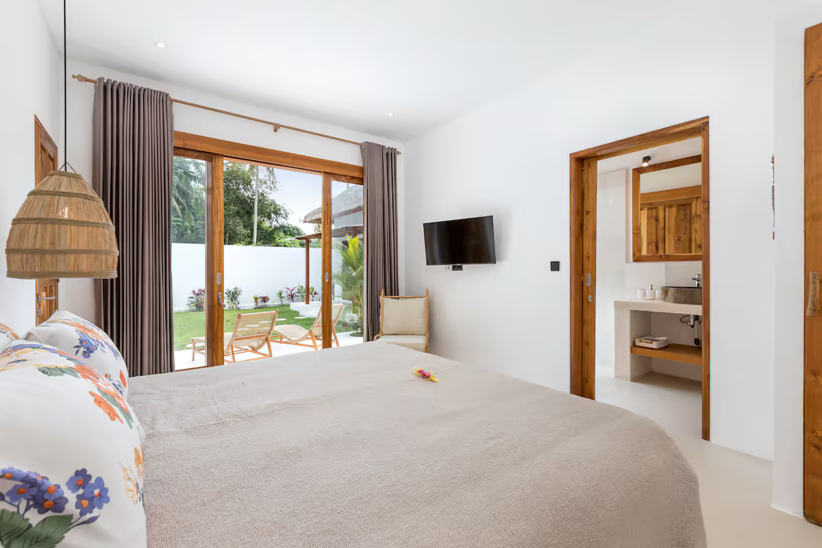 The interior showcases a warm tropical-modern design with natural materials and earthy tones. The living area features an open-plan layout with large glass doors that allow plenty of natural light to flow in. Wooden elements, clean lines, and tasteful furnishings create a cozy yet elegant ambiance. Each of the three bedrooms is well-proportioned, offering comfort and privacy, complemented by stylish bathrooms.