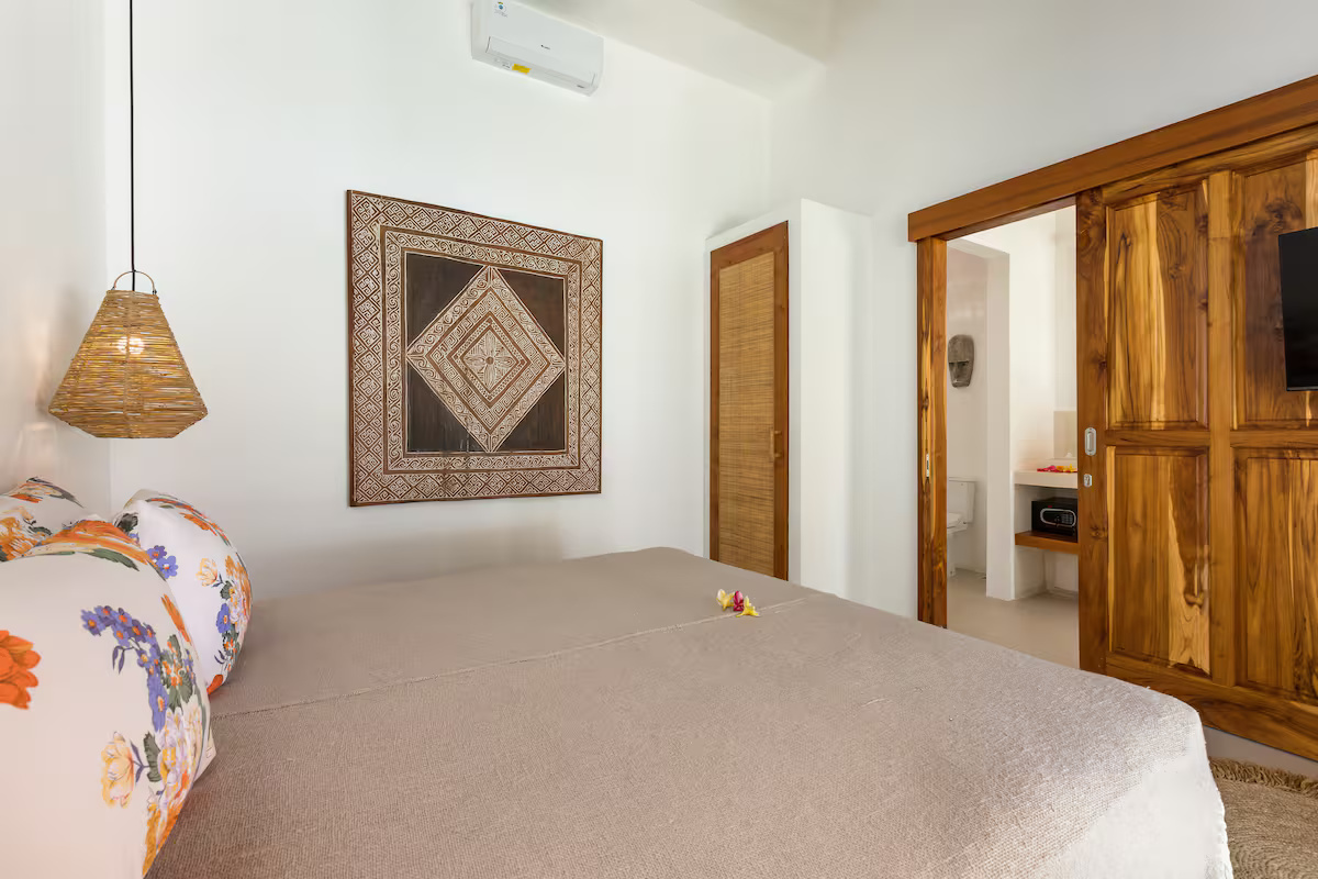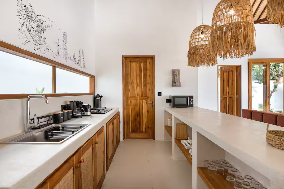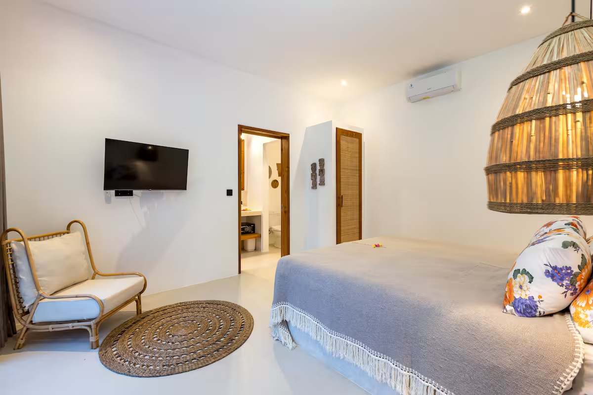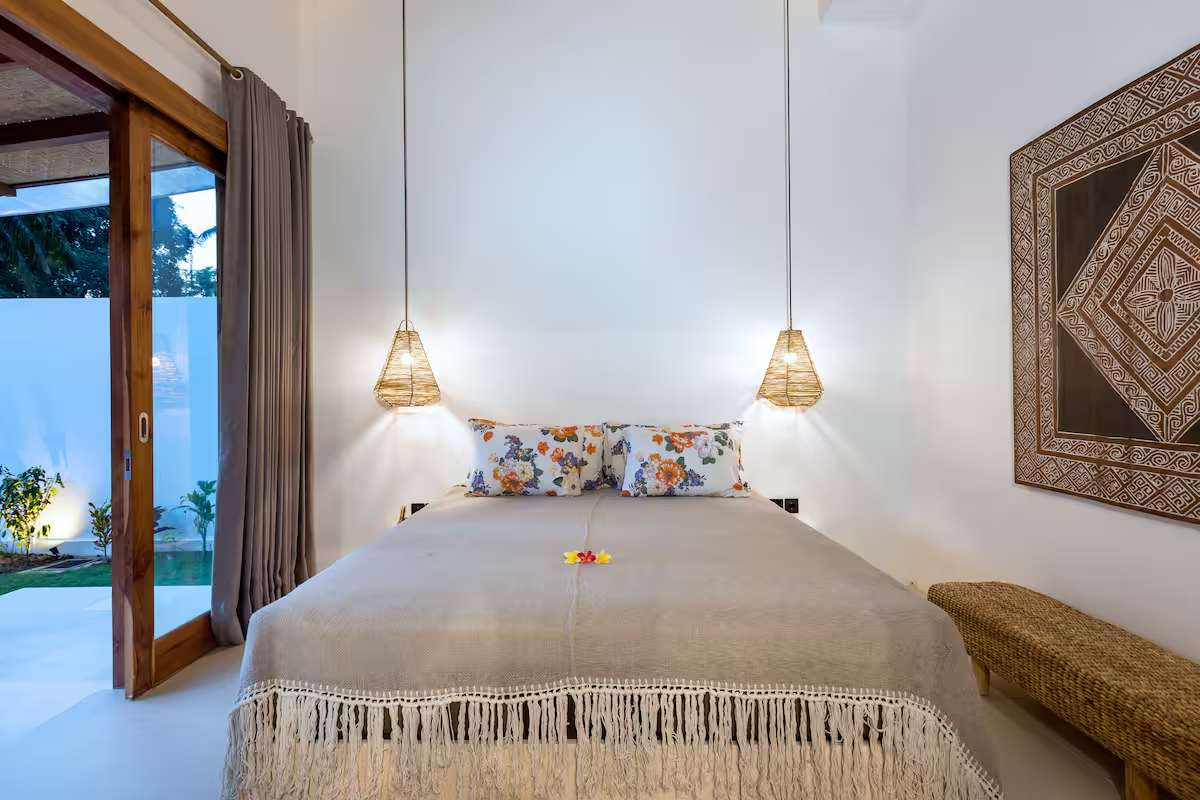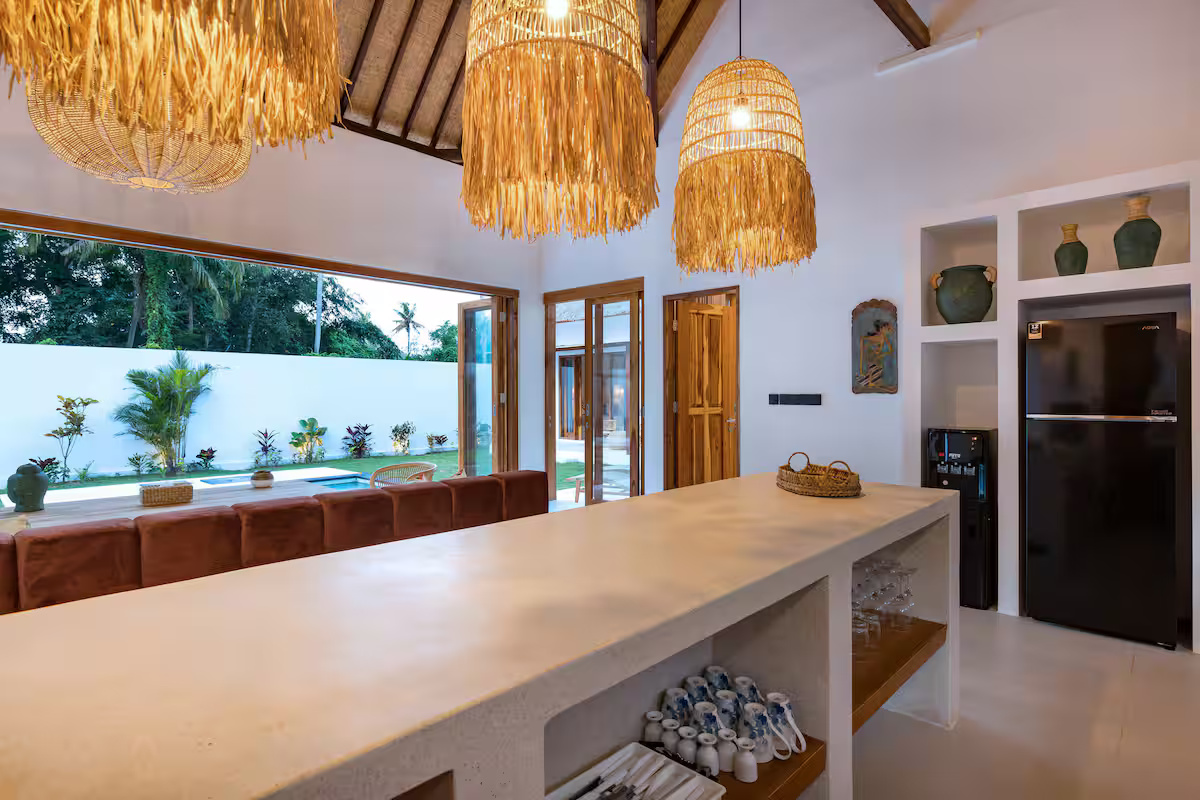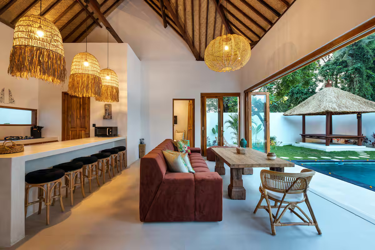 The interior showcases a warm tropical-modern design with natural materials and earthy tones. The living area features an open-plan layout with large glass doors that allow plenty of natural light to flow in. Wooden elements, clean lines, and tasteful furnishings create a cozy yet elegant ambiance. Each of the three bedrooms is well-proportioned, offering comfort and privacy, complemented by stylish bathrooms.