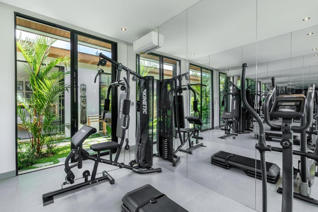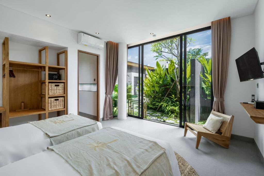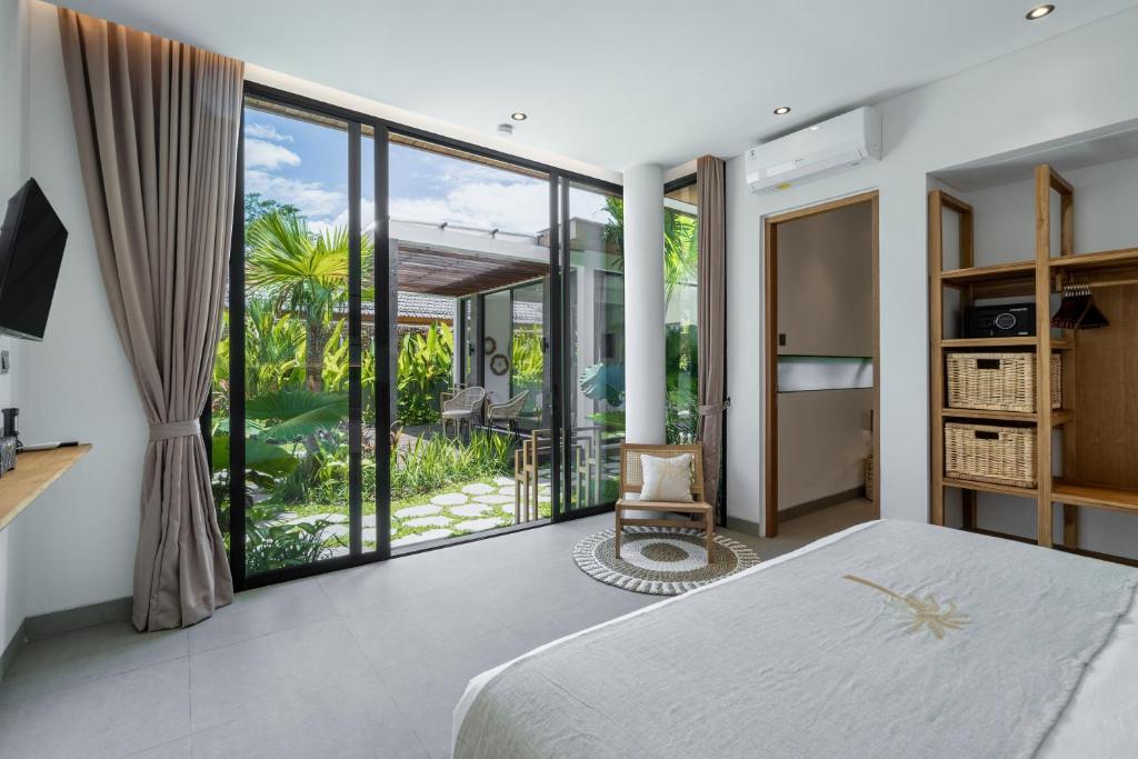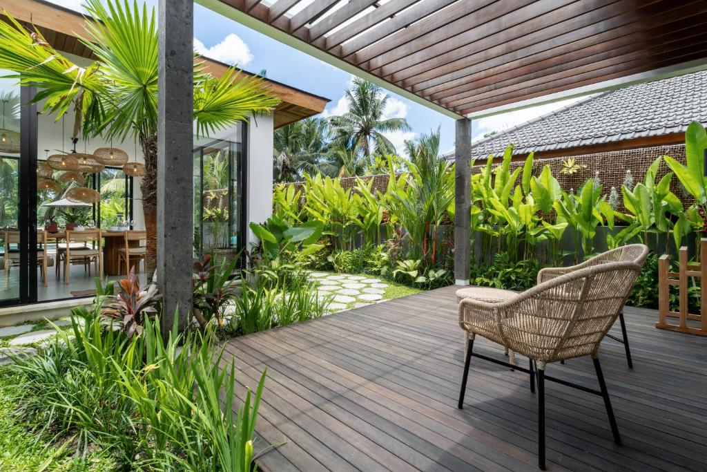 Outdoors, you’ll find a lush garden with a stunning pool surrounded by tropical greenery, offering a peaceful escape with refreshing jungle views and complete privacy.