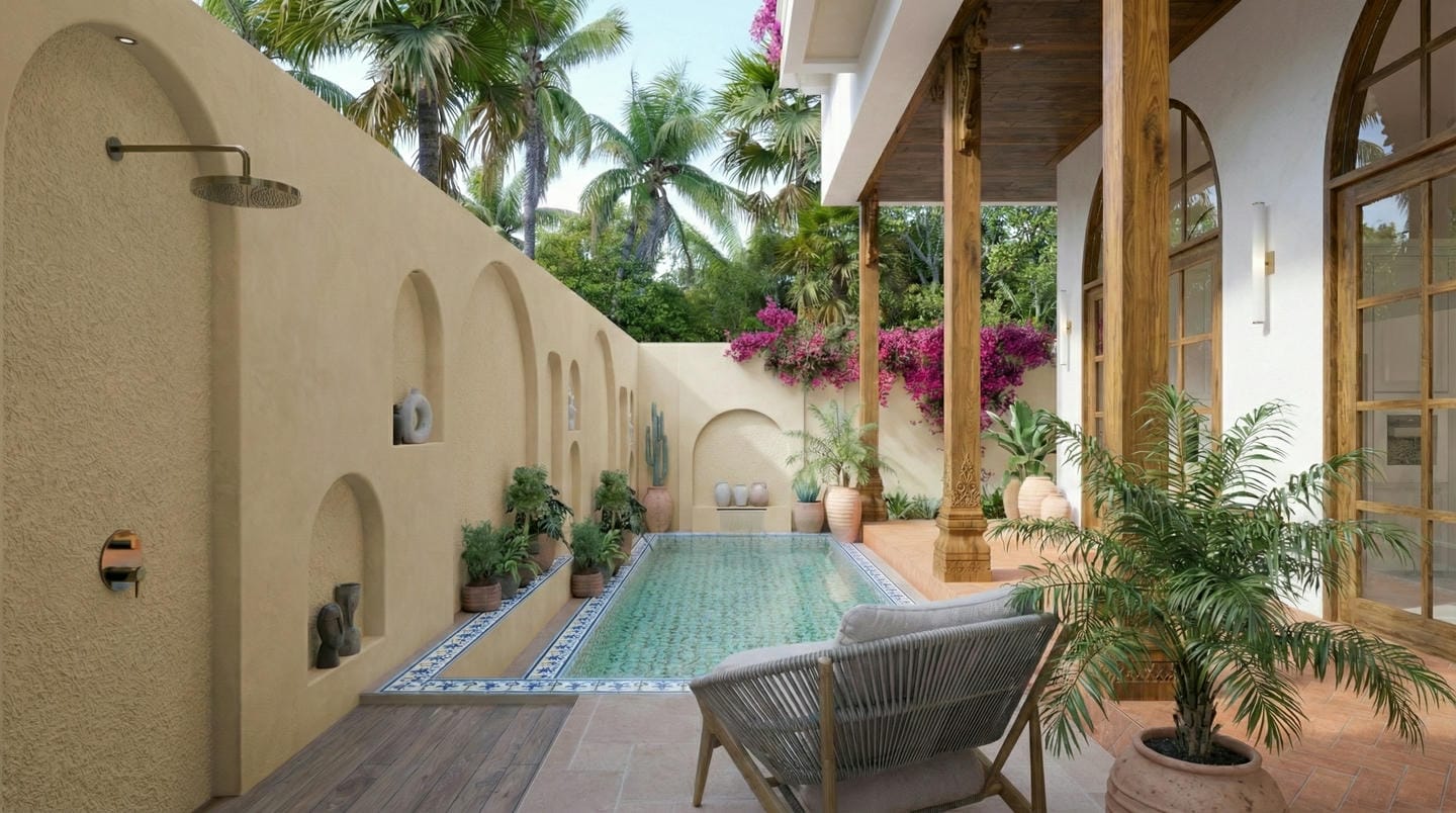 Outside, the villa features a charming private pool framed by Mediterranean tiles, lush greenery, and inviting lounge areas.