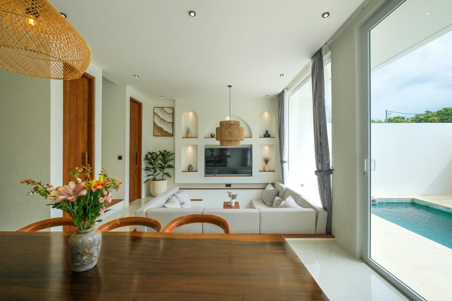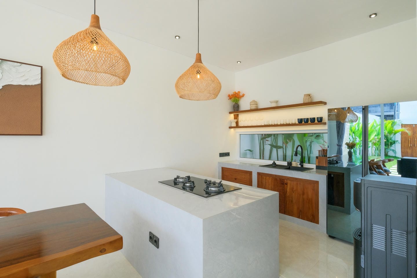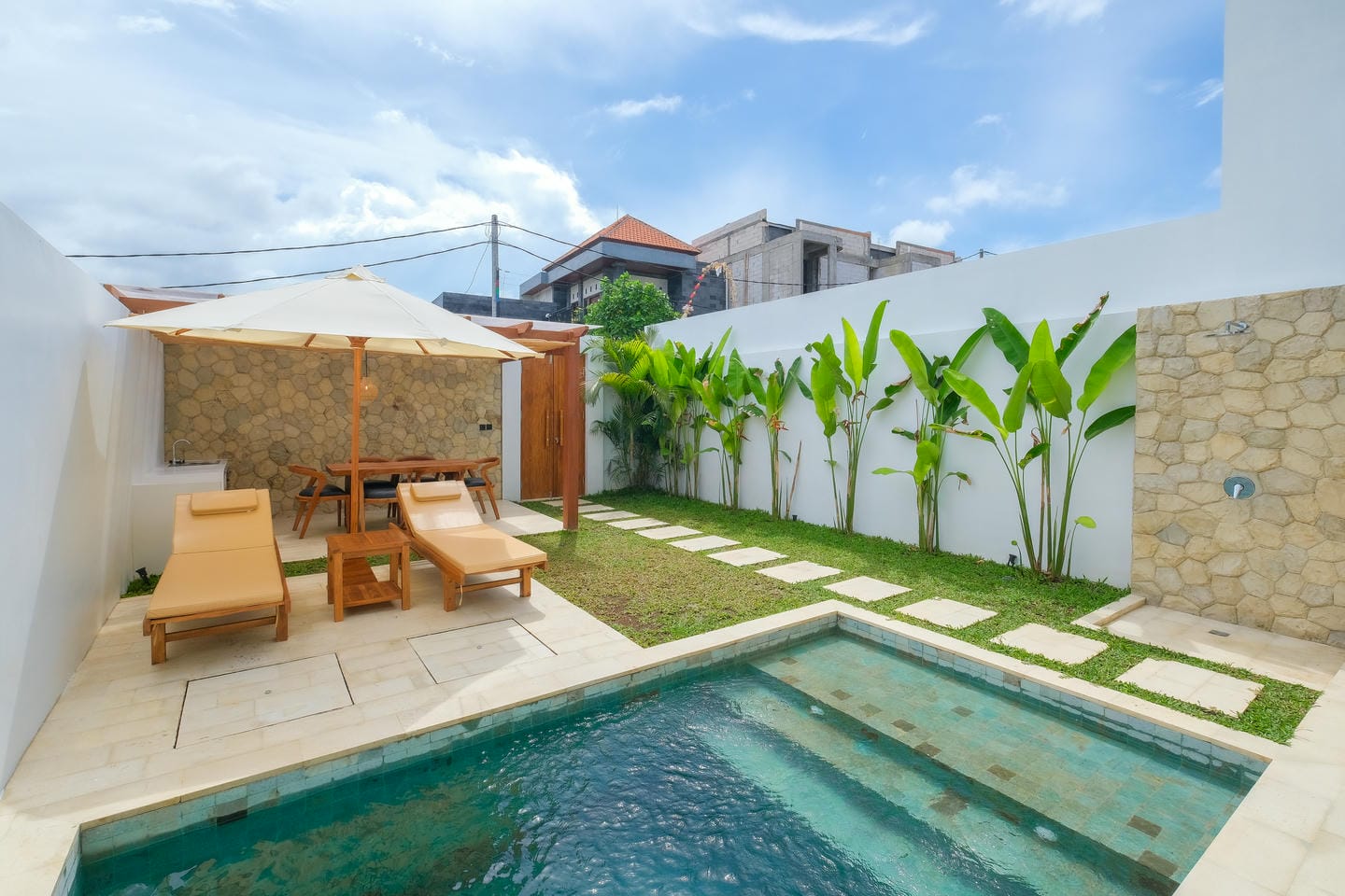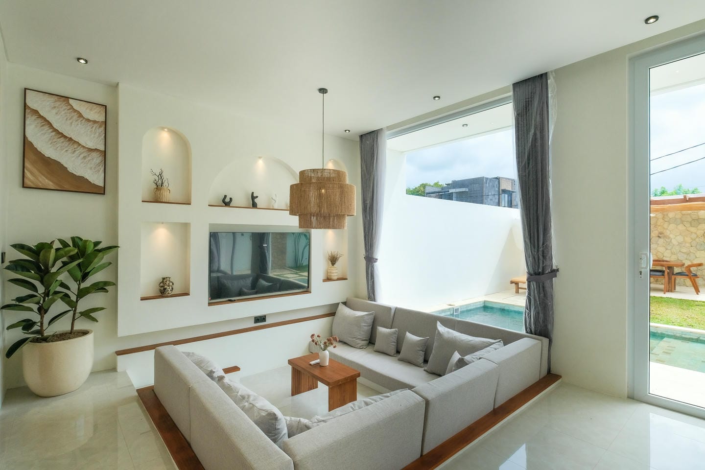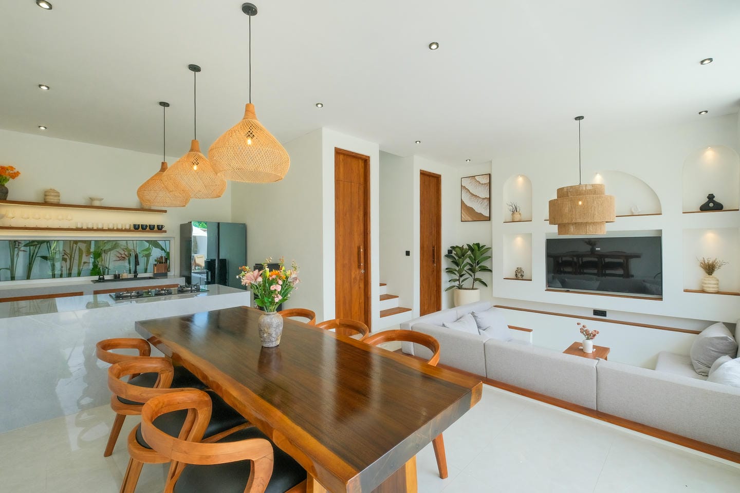 This villa in Ungasan, Uluwatu, offers a perfect blend of minimalistic and Mediterranean design, located just 3 minutes from Karma Beach, and 8 minutes from Melasti Beach, Savaya, and Green Bowl Beach.