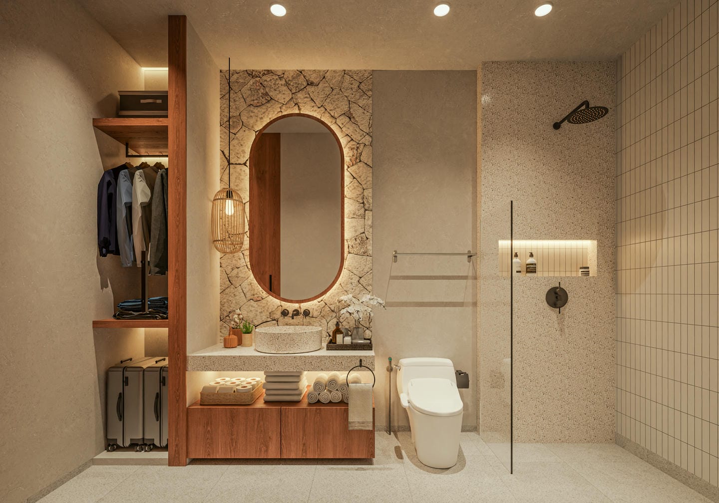 Outdoors, a private pool is elegantly framed by natural stone elements, offering a serene and harmonious atmosphere. The rooftop features an optional cold plunge pool and sauna, perfect for relaxation and rejuvenation.