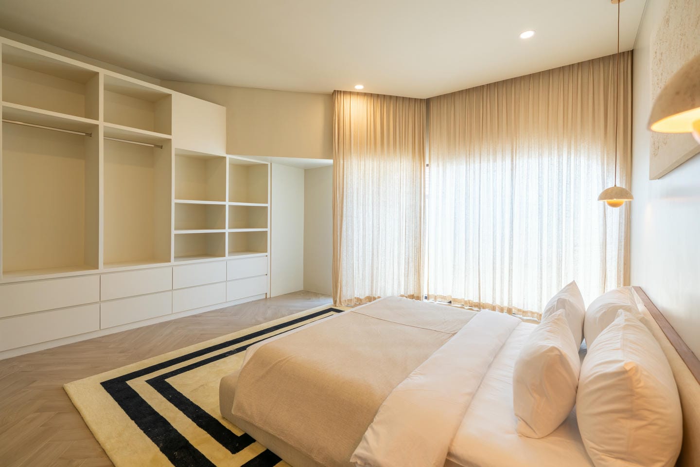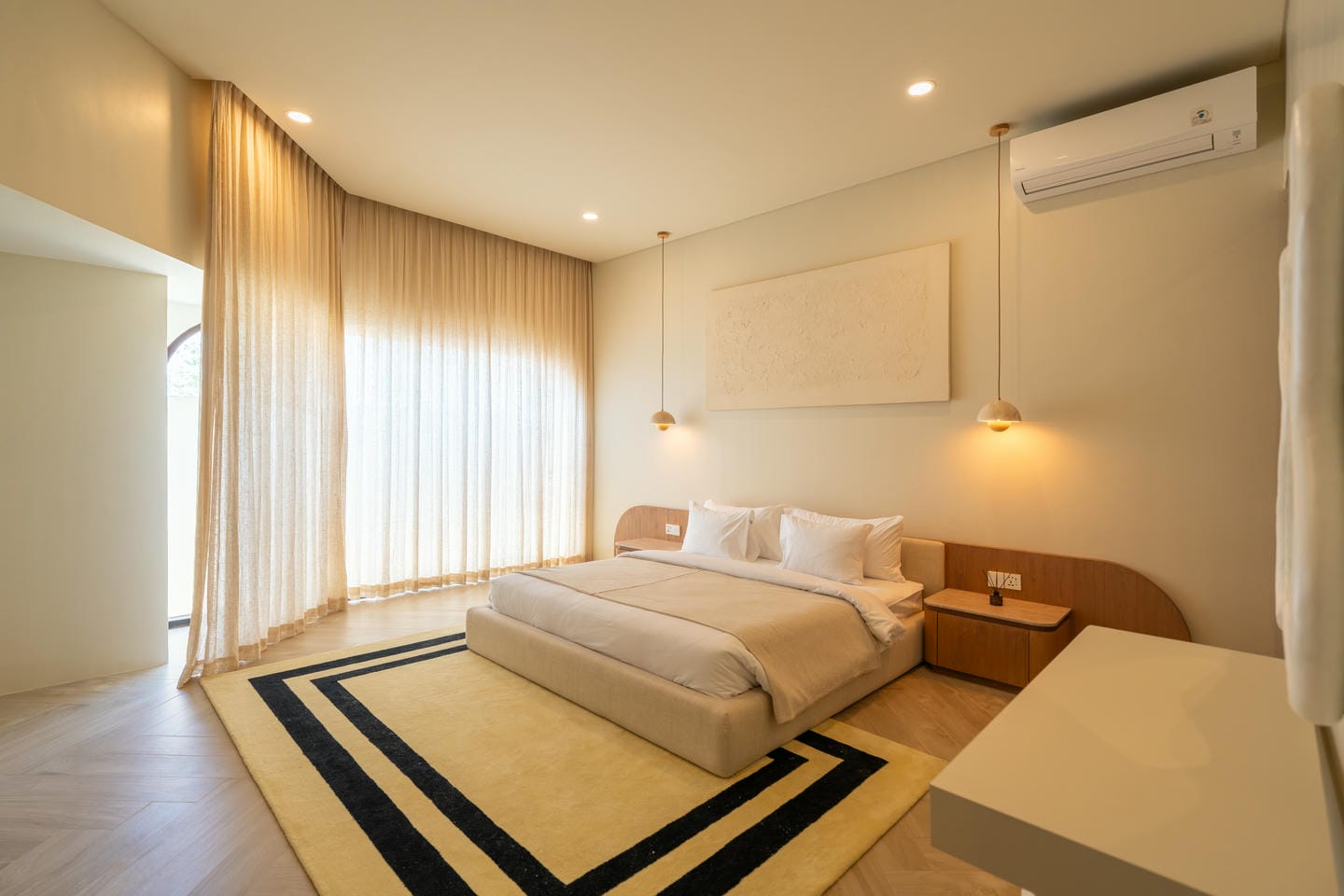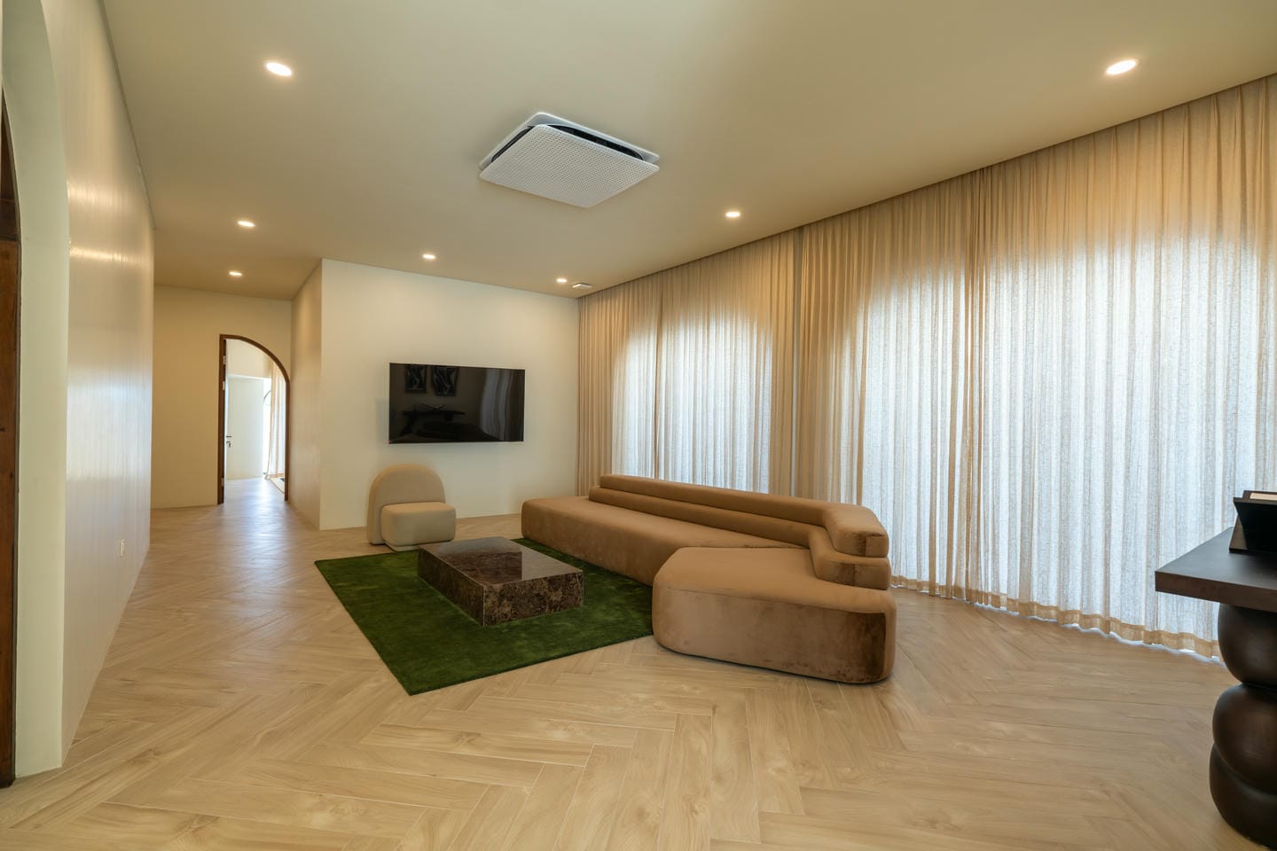 This European-designed, fully furnished villa features four bedrooms, each complete with wardrobes and ensuite bathrooms. Practical amenities include an additional guest bathroom and a fully equipped kitchen. The spacious open-plan living area effortlessly transitions into a dedicated entertainment zone, creating an inviting space for gatherings. Adding to its appeal, the villa includes a cinema room, perfect for private movie nights.